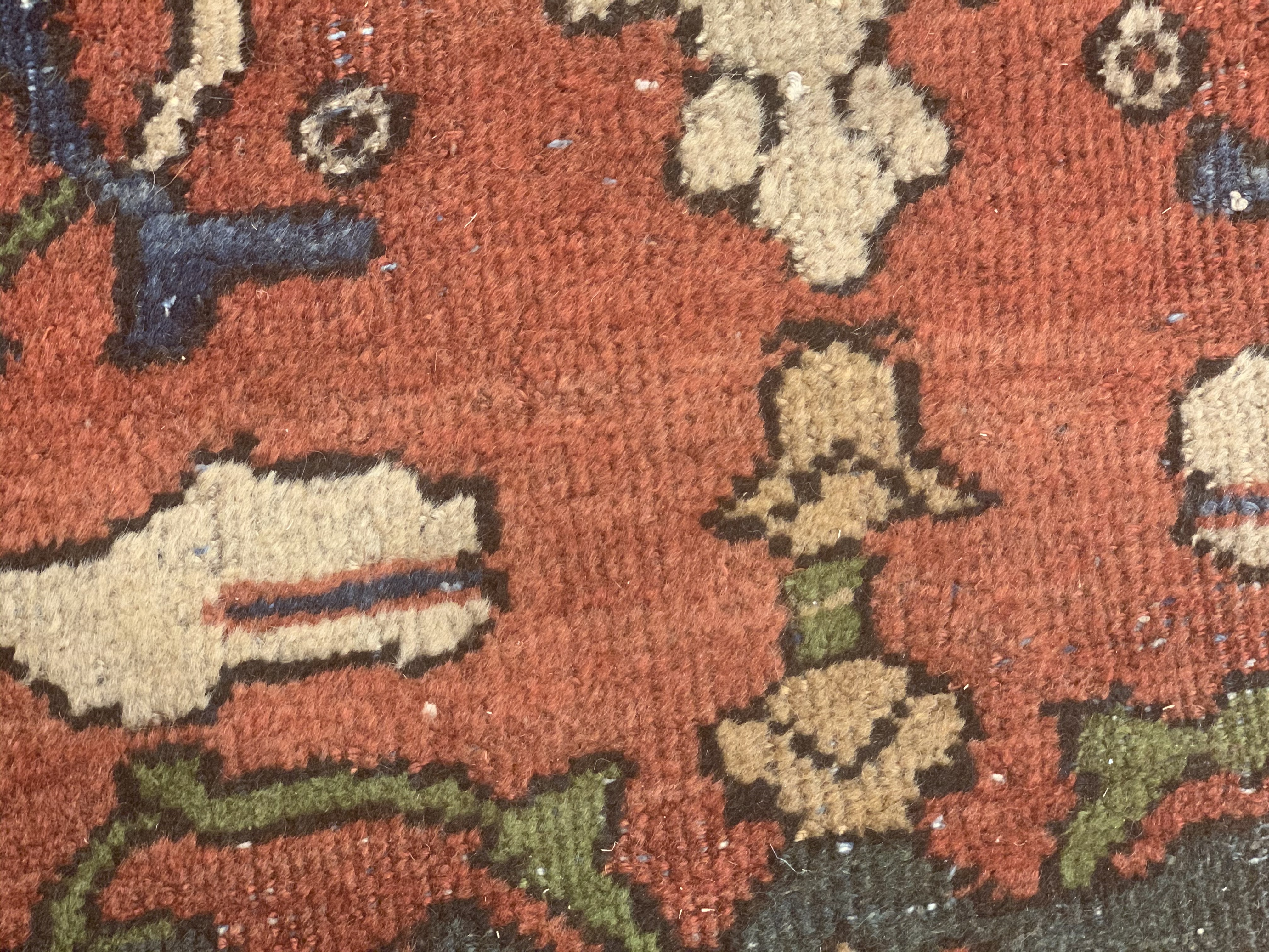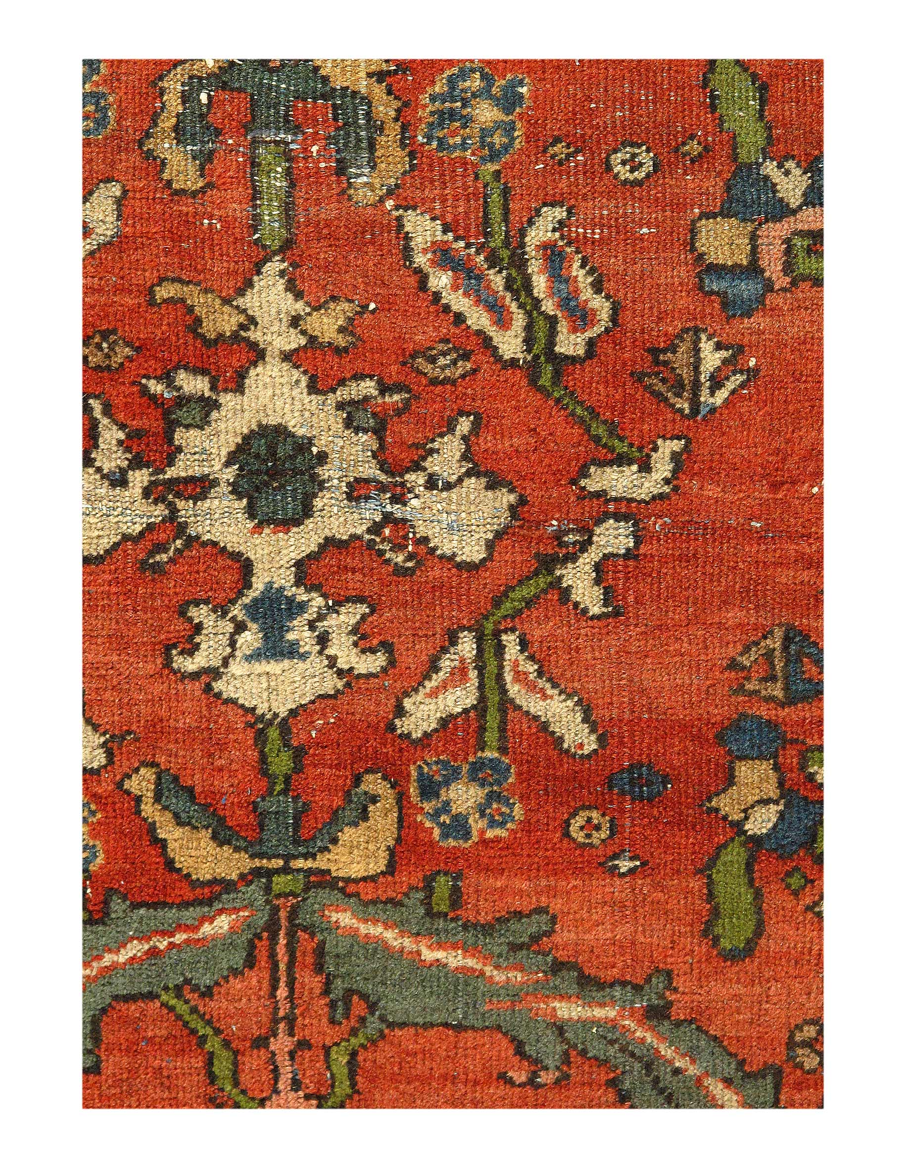 The border of this magnificent antique rug is a darker color, making the cream colored lines stand out in a bold and eye catching way against this rich dark ground. The patterns in the border of this rust color Sultanabad rug are natural inspired elements as well, with shapes reminiscent of leaves or feathers making their home among small flowers and lighter colored vines. On either side of the border with the dark ground, there are two smaller stripes which each feature a pattern of their own. The addition of these secondary borders give the rust color Sultanabad rug a dynamic feel as well as making it look extremely elegant. The two patterns within this antique Oriental rug work together beautifully to create a stunningly elegant work of art.