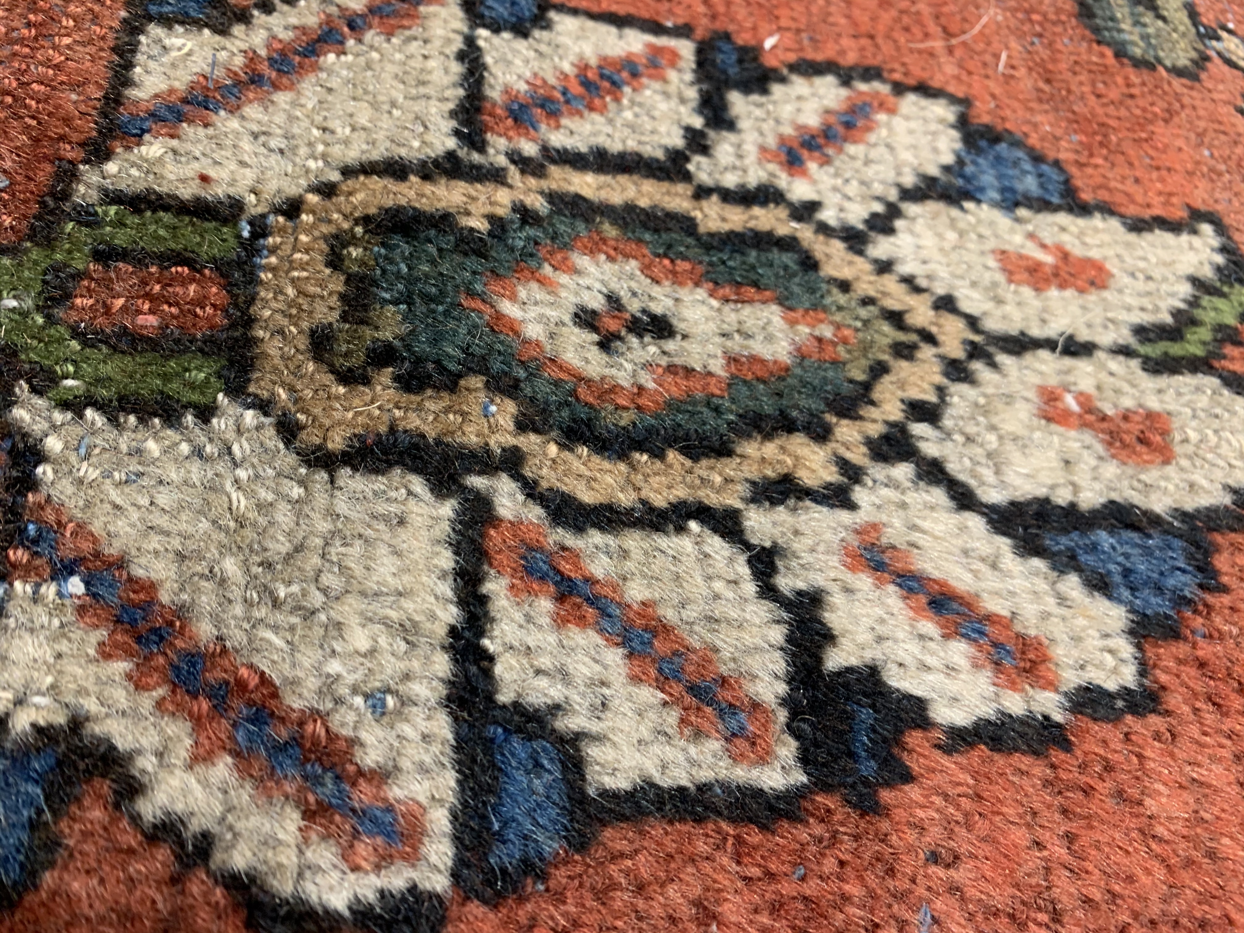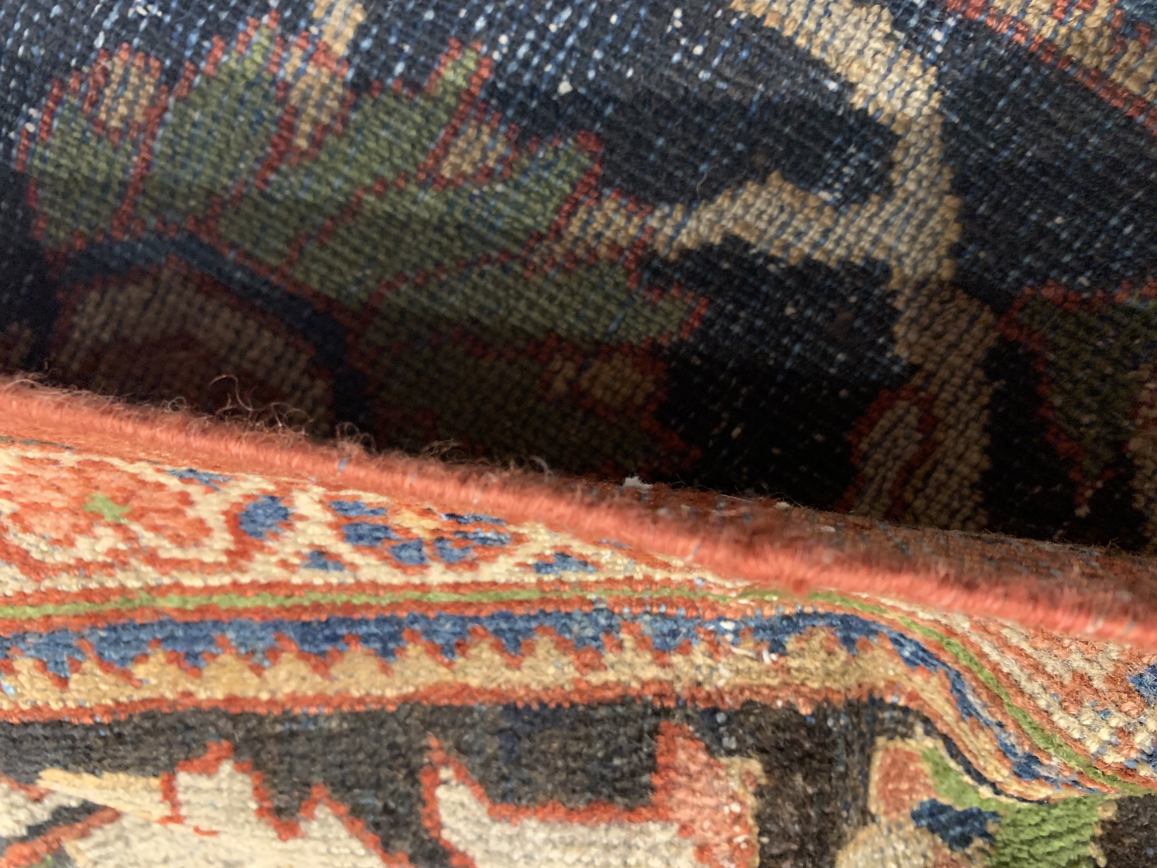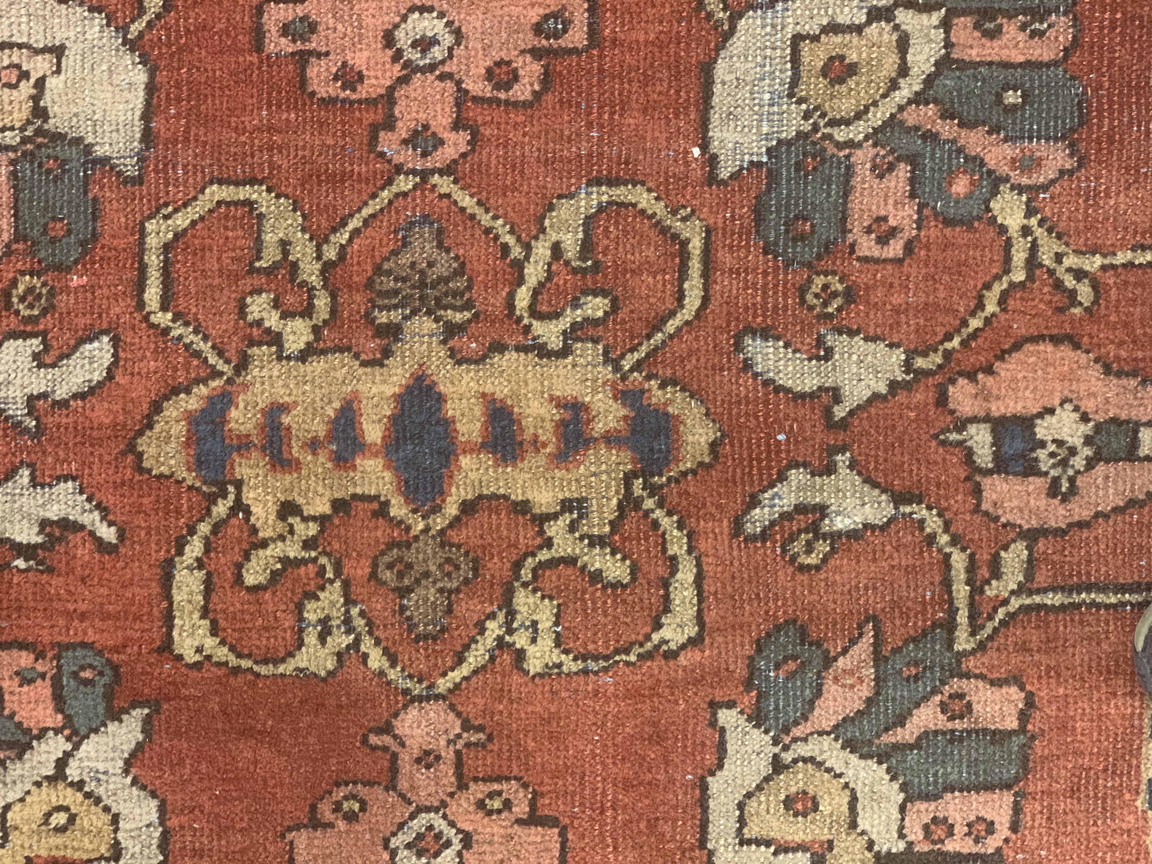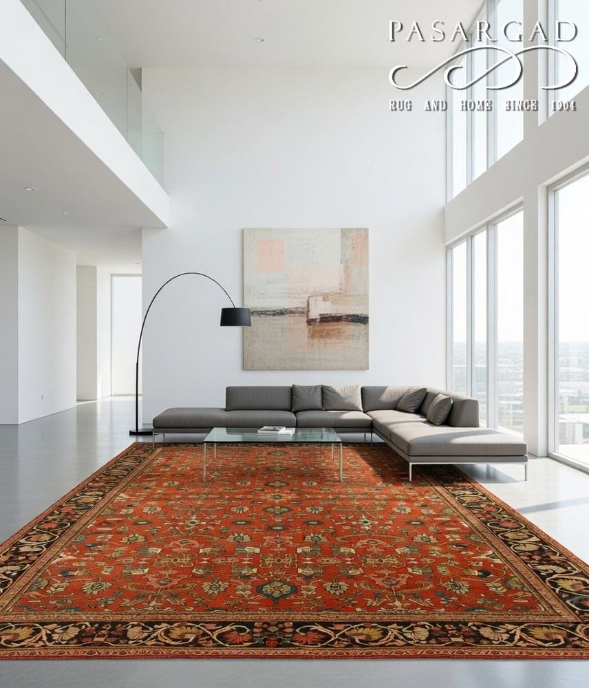 The most striking and vibrant aspect of this extra large oversized rug is the bright rust color tone that are present in the interior design of the central field. The curving vine and leaf inspired designs stand out against this rust color due to their creamy ivory and fresh green tones. These curving lines draw the eye along the Persian rug, creating an eye catching centerpiece that is added to by the presence of beautiful floral elements.