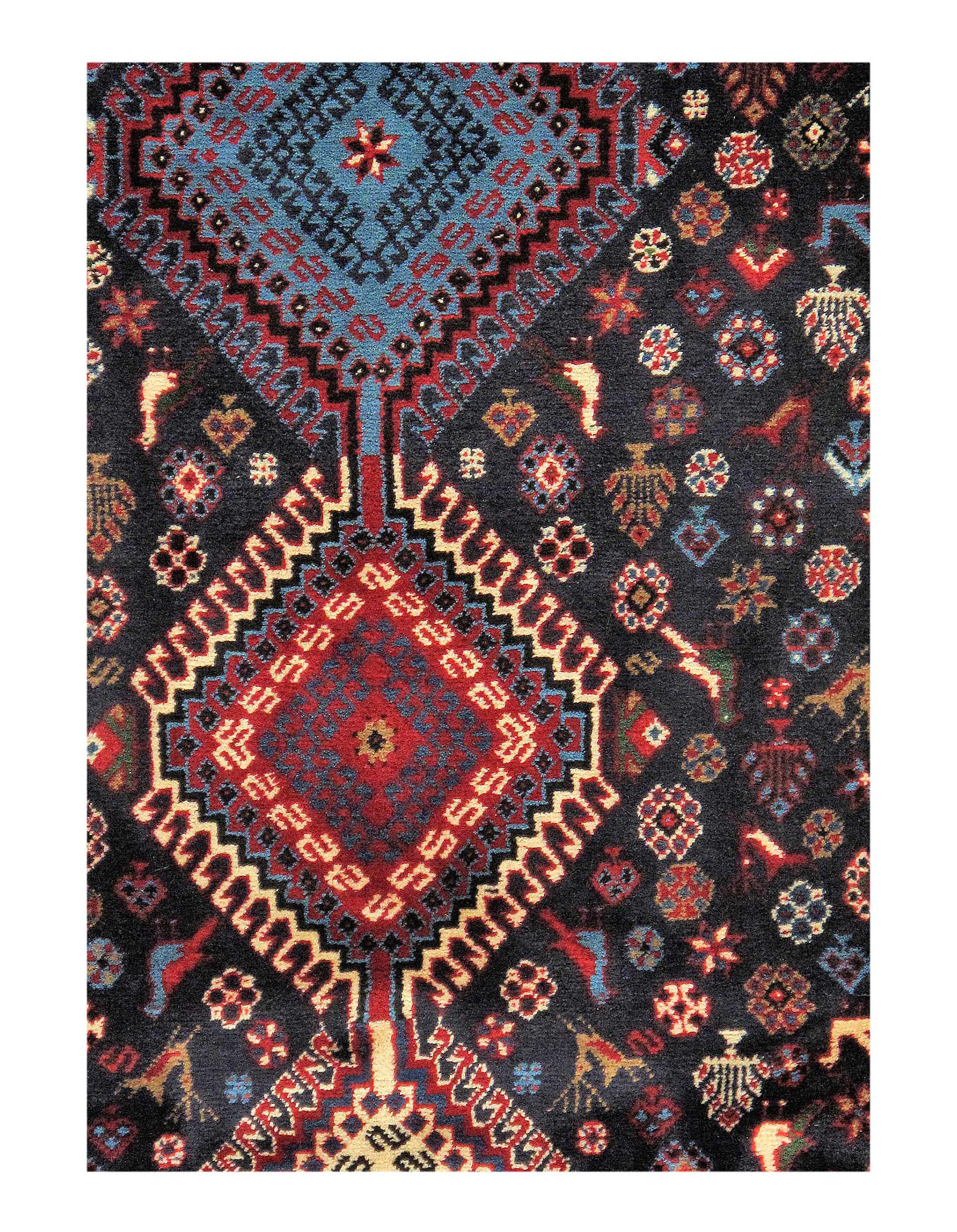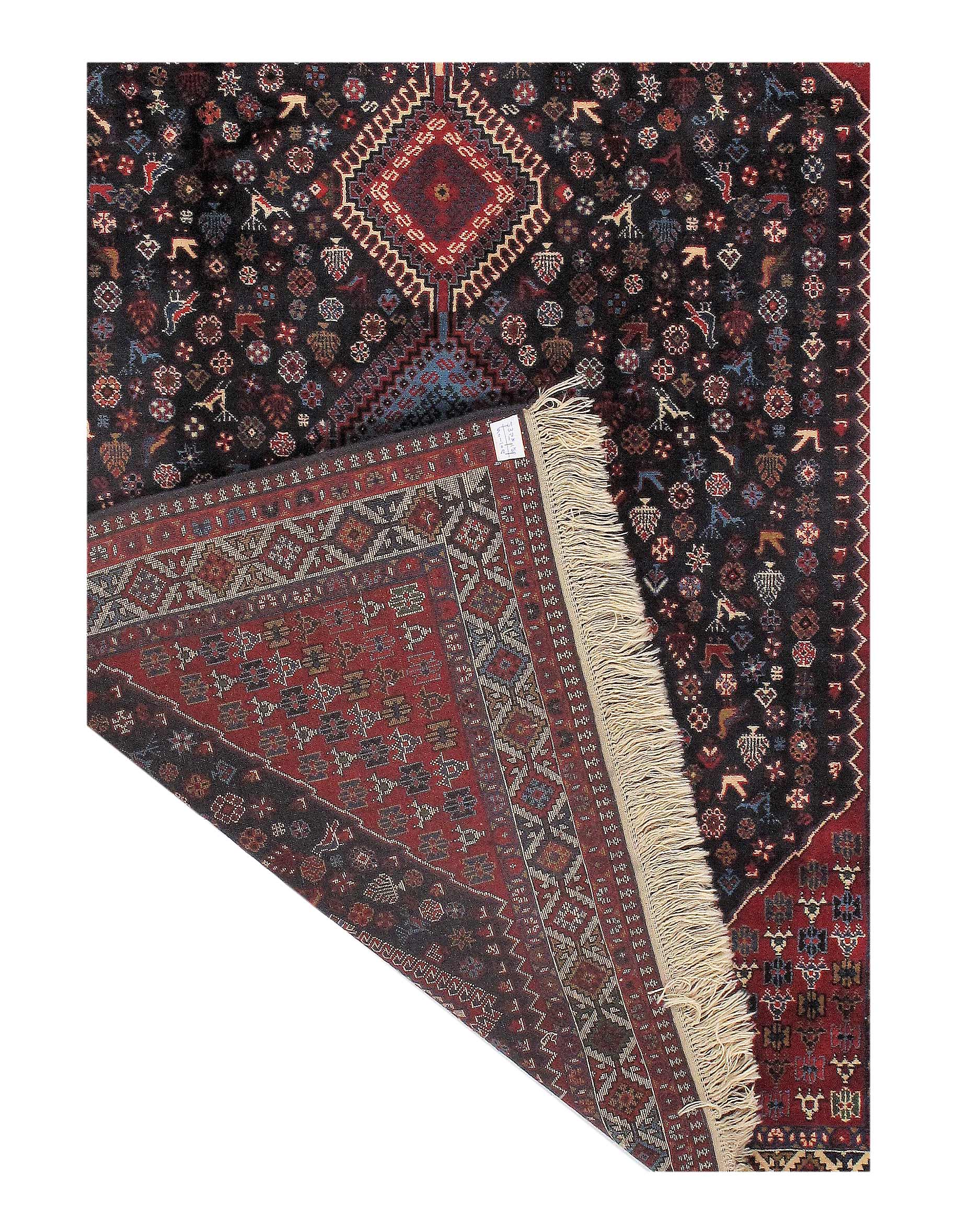 The pile used in Yalameh rugs is very fine, particularly in comparison to other tribal designs, using soft wool based on a Wool foundation. The pattern is distinctive with large repeated diamonds in a straight line down the carpet, often with geometrical animal or human prints scattered across the field. Dark red or light brown on a blue or orange background is most common for Yalameh, similar to Shiraz rugs, the rugs compliment modern or minimalist furniture beautifully, giving the living space an aura of luxurious style and warm.