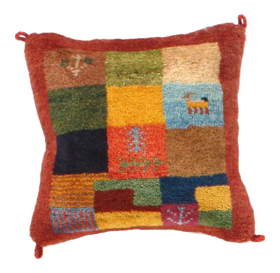 This Gabbeh cushion is made of high-quality old and rare Persian Gabbeh carpets in good workmanship. The Gabbeh carpets used for manufacturing The Persian nomadic Gabbeh carpet is produced like the Persian nomadic Kelim of pure sheep wool and natural colors. This Gabbeh pillow is an extra production, each Gabbeh cushion piece is unique!