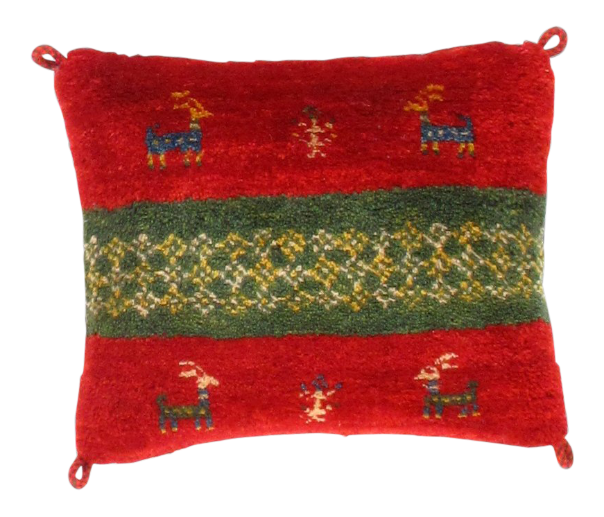 This Gabbeh cushion is made of high-quality old and rare Persian Gabbeh carpets in good workmanship. The Gabbeh carpets used for manufacturing The Persian nomadic Gabbeh carpet is produced like the Persian nomadic Kelim of pure sheep wool and natural colors. This Gabbeh pillow is an extra production, each Gabbeh cushion piece is unique!