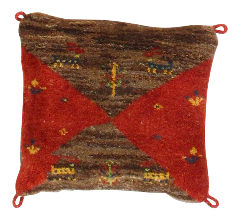 This Gabbeh cushion is made of high-quality old and rare Persian Gabbeh carpets in good workmanship. The Gabbeh carpets used for manufacturing The Persian nomadic Gabbeh carpet is produced like the Persian nomadic Kelim of pure sheep wool and natural colors. This Gabbeh pillow is an extra production, each Gabbeh cushion piece is unique!