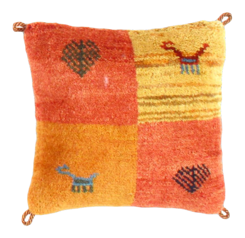 This Gabbeh cushion is made of high-quality old and rare Persian Gabbeh carpets in good workmanship. The Gabbeh carpets used for manufacturing The Persian nomadic Gabbeh carpet is produced like the Persian nomadic Kelim of pure sheep wool and natural colors. This Gabbeh pillow is an extra production, each Gabbeh cushion piece is unique!
