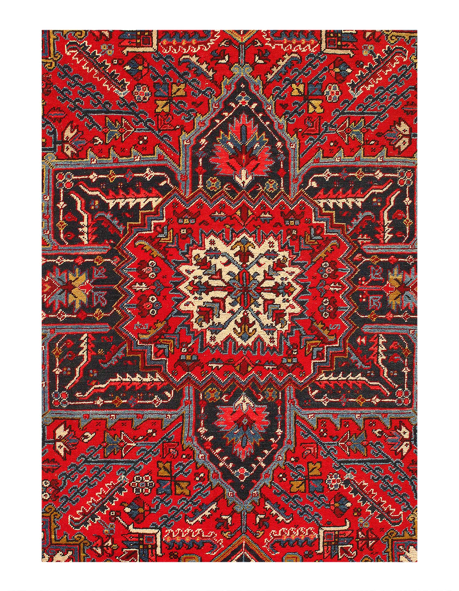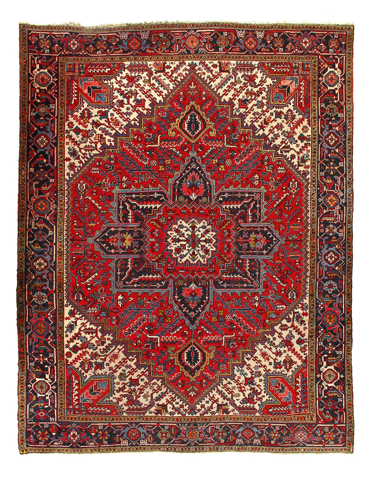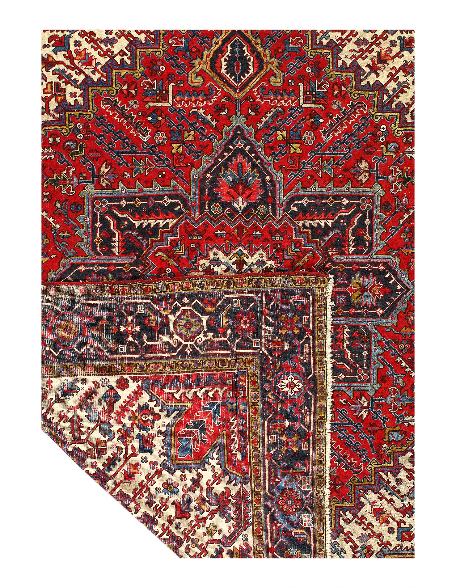 The brilliant rust field bears a central Ray of Life and many highly abstracted floral shapes in this fascinating antique Heriz rug. Four flower blossoms cluster at different points along the mid-lines, separated by riyu symbols in the shape of arrows. The patterns carry blue, pink and white colors. A broad navy border presents scrolled geometric shapes. Three separate, narrow guard borders frame the border, each carrying a geometric pattern. Heriz is a community in Northwestern Iran famed for producing extremely long lasting carpet and rugs, items that often pass down from one generation to another during many years. These antique rugs possess a coarse, durable consistency. The type of rugs made in Heriz are also sometimes produced in other places, including Bakhshaish and Gorevan. The highest grade of rug from the Heriz area is the Serapi, which was made around the turn of the Twentieth Century. Most Heriz rug contain prominent knots but the Serapi are describes as smoother.