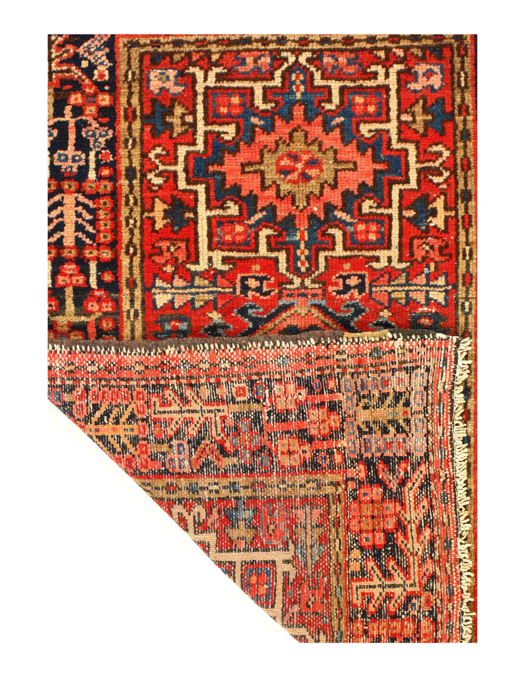 A beautiful early 20th century Persian Karajeh rug with three large medallions against an intricately woven field of myriad flowers and leaves, all woven in bright crimson, indigos, Blue, green, and white colored wool. The border is equally intricate with gorgeous scrolling vines with large-scale stylized flowers all woven in similar colors as the field.