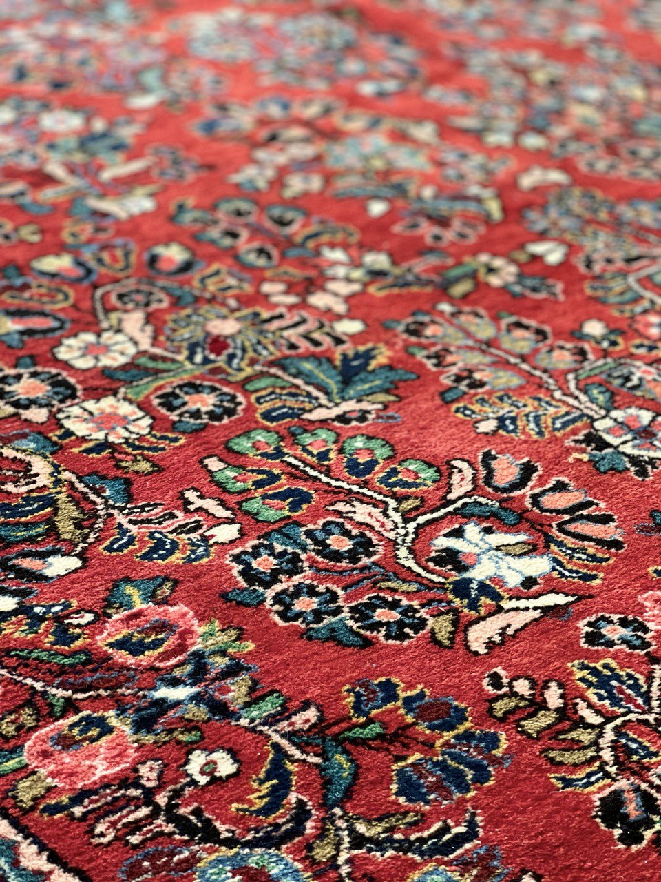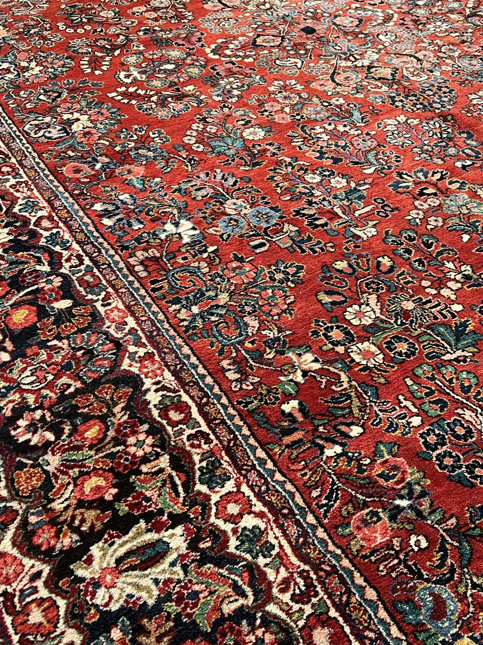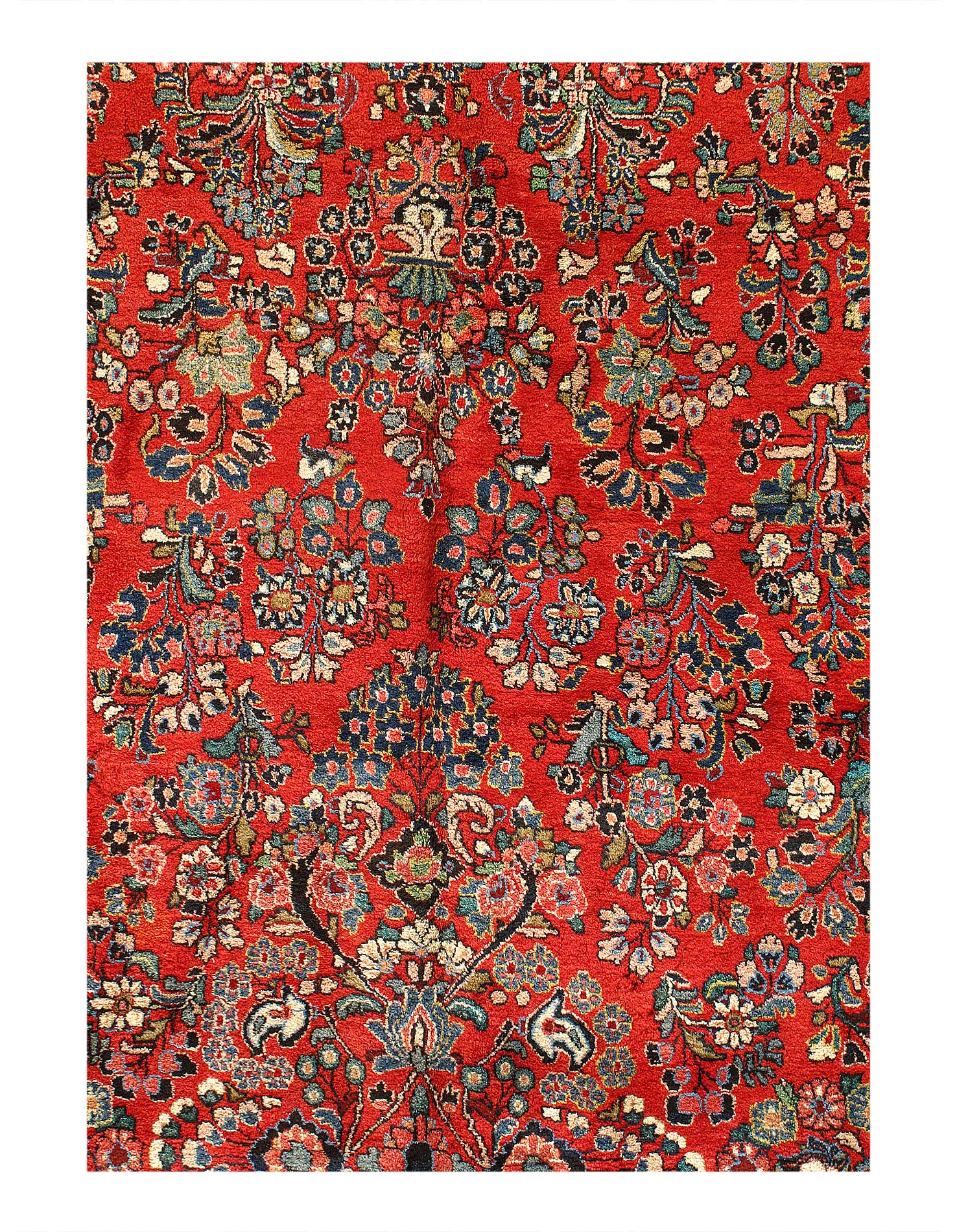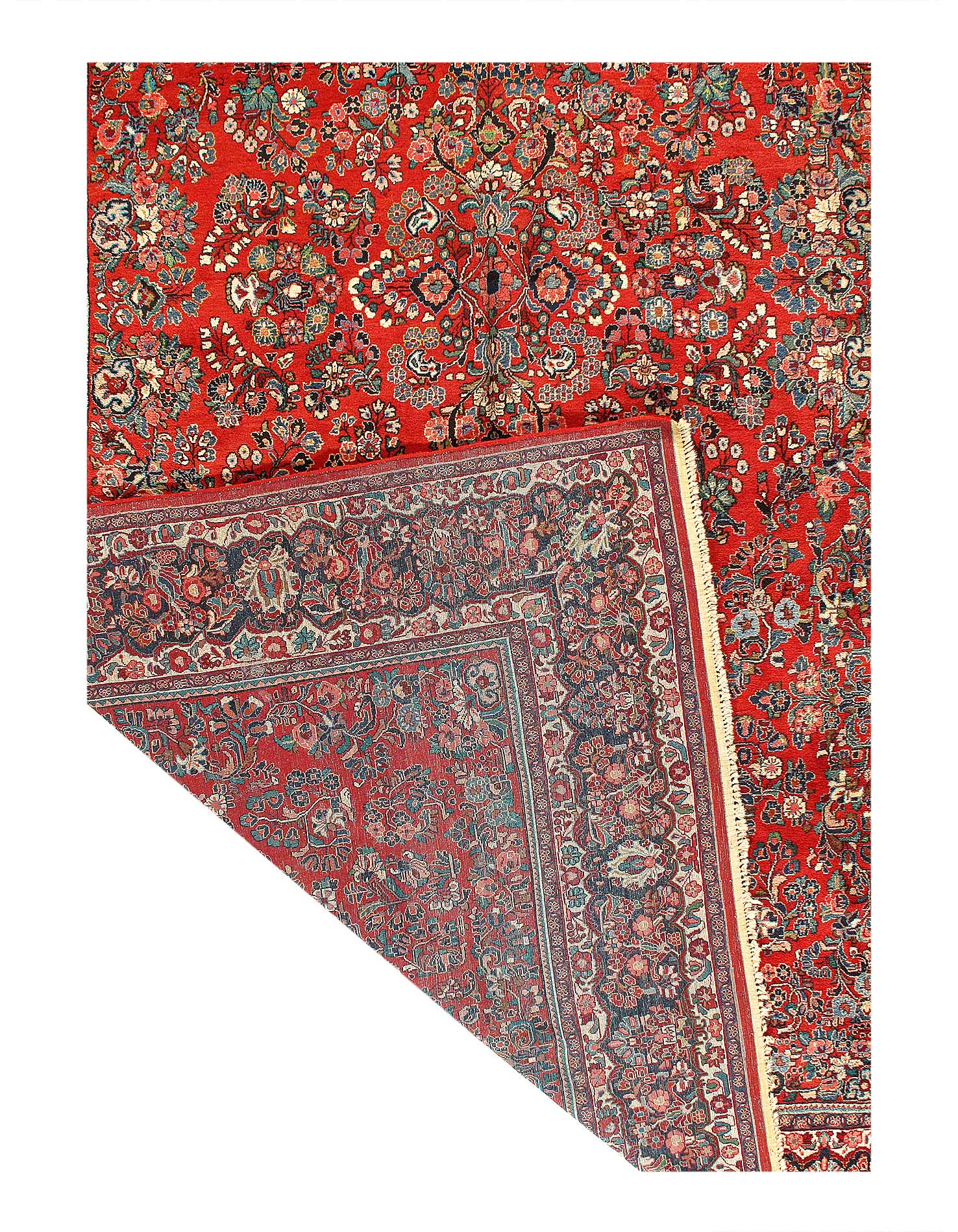 Sarouk rugs are among the most luxurious classically derived, room-sized Persian carpets. They were produced in the Arak region, not far from where Fereghans and Sultanabads were made. Some of the early examples were so closely related to Fereghans that they have been designated as Sarouk-Fereghans. While the latter tend to have medallion designs, Sarouk carpets from about 1900 onward were mostly produced in an allover format, with dense sprays or bouquets of flowers and vines arrayed across the carpet symmetrically, on a deep blue or burgundy ground. This latter type is known for its soft, velvety wool and fairly thick pile.