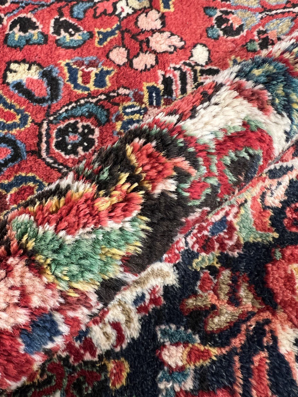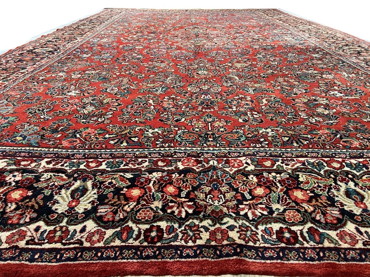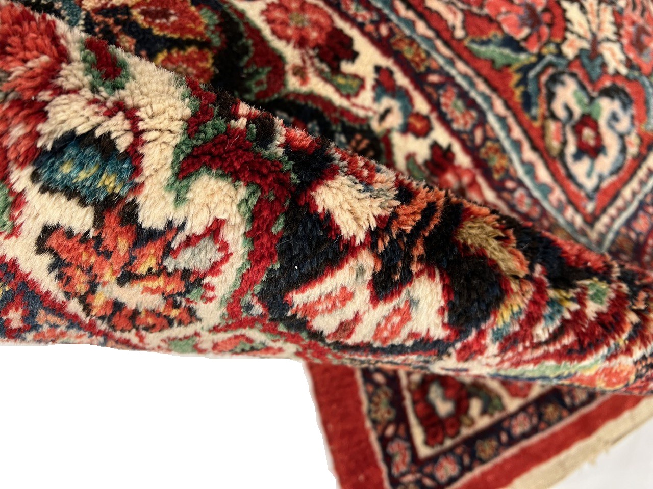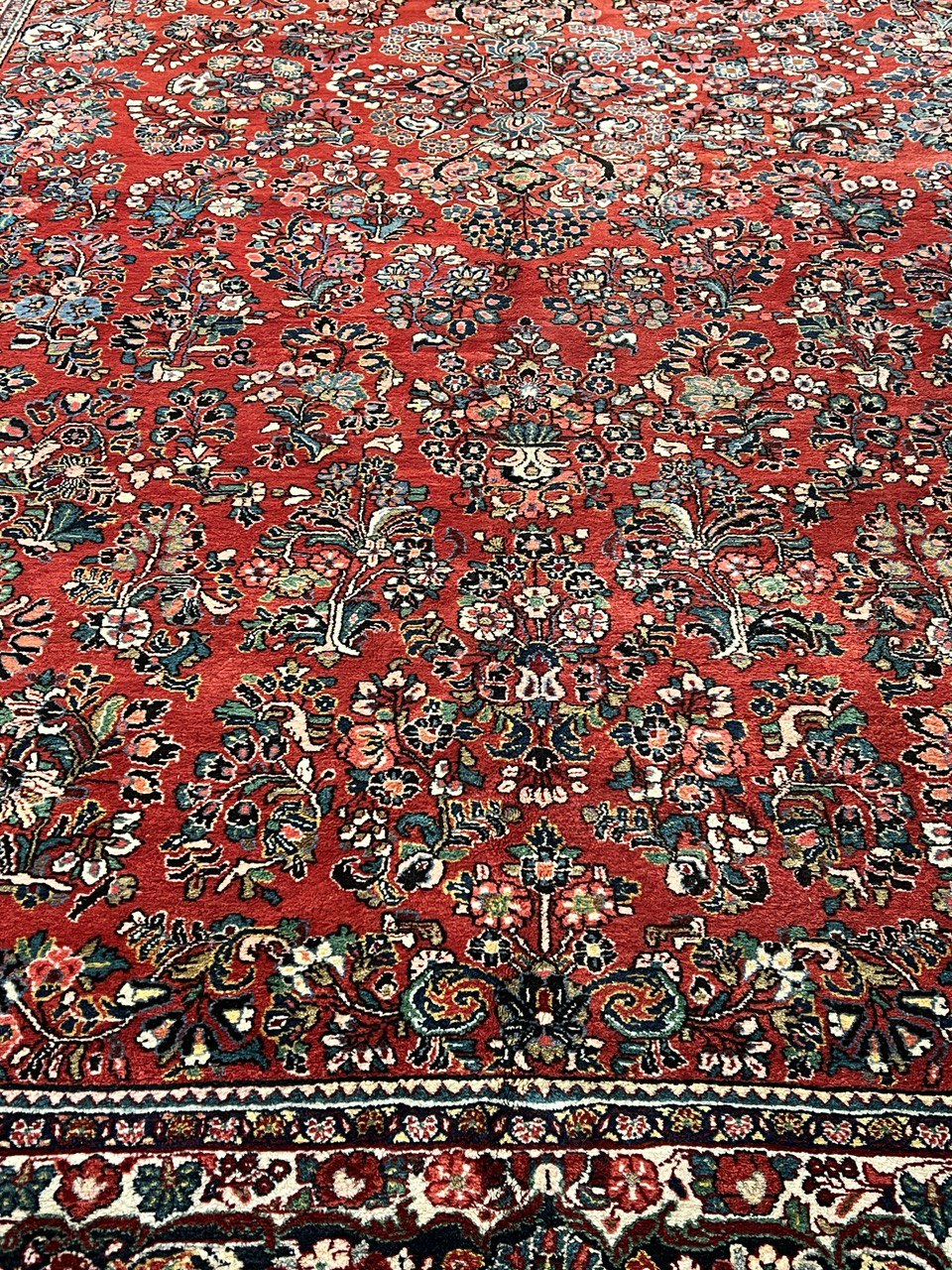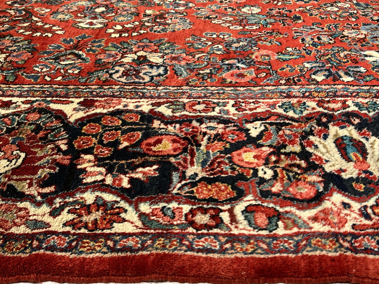 Sarouk rugs are among the most luxurious classically derived, room-sized Persian carpets. They were produced in the Arak region, not far from where Fereghans and Sultanabads were made. Some of the early examples were so closely related to Fereghans that they have been designated as Sarouk-Fereghans. While the latter tend to have medallion designs, Sarouk carpets from about 1900 onward were mostly produced in an allover format, with dense sprays or bouquets of flowers and vines arrayed across the carpet symmetrically, on a deep blue or burgundy ground. This latter type is known for its soft, velvety wool and fairly thick pile.