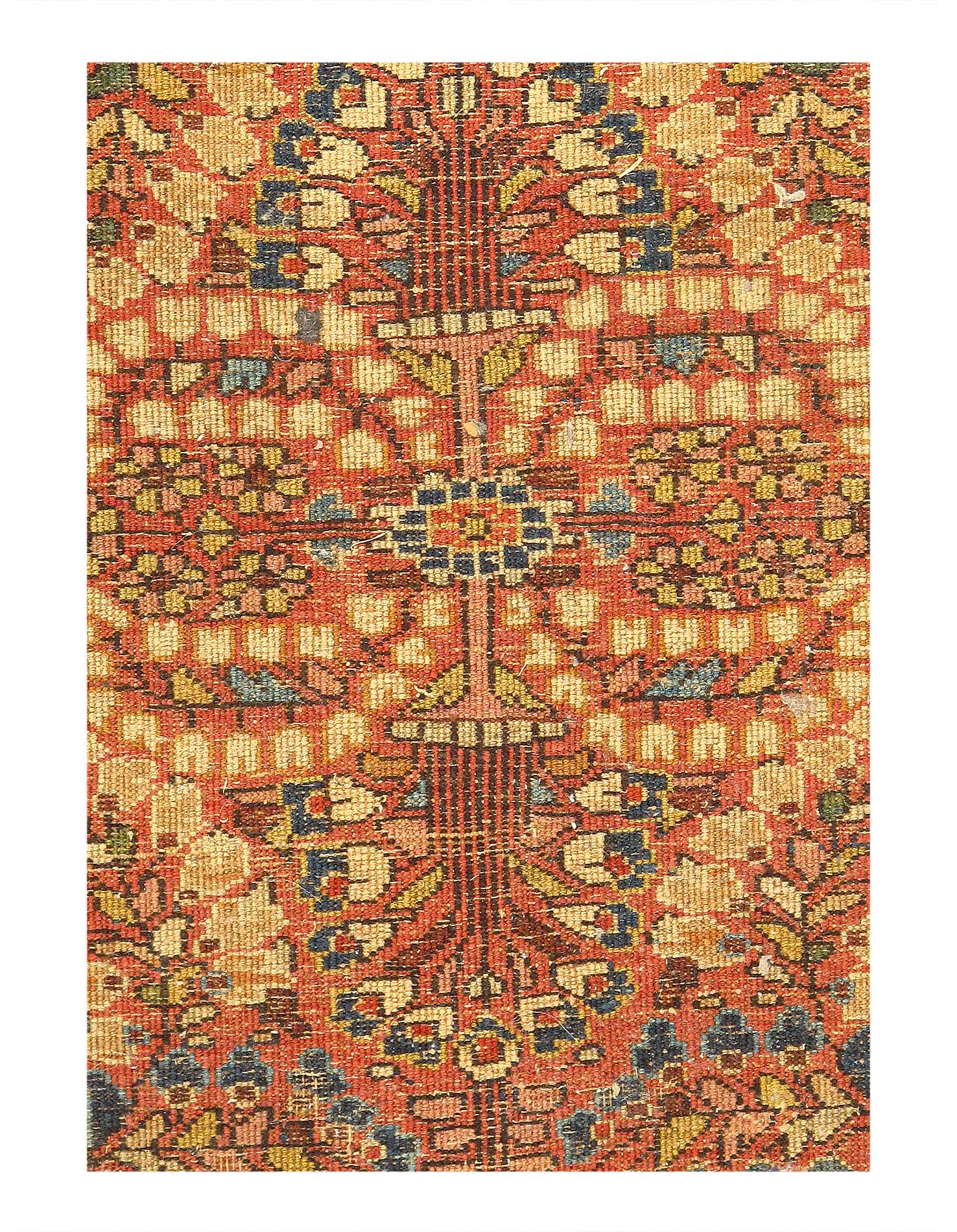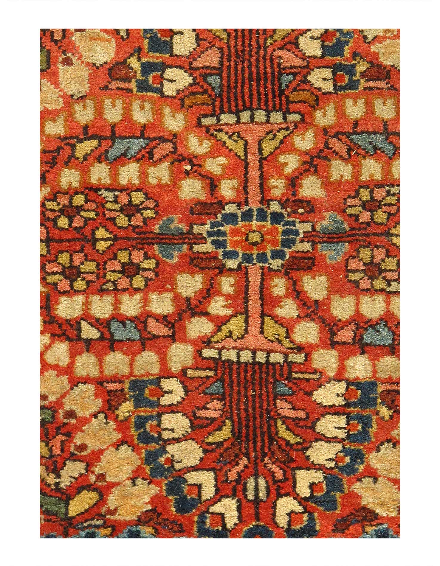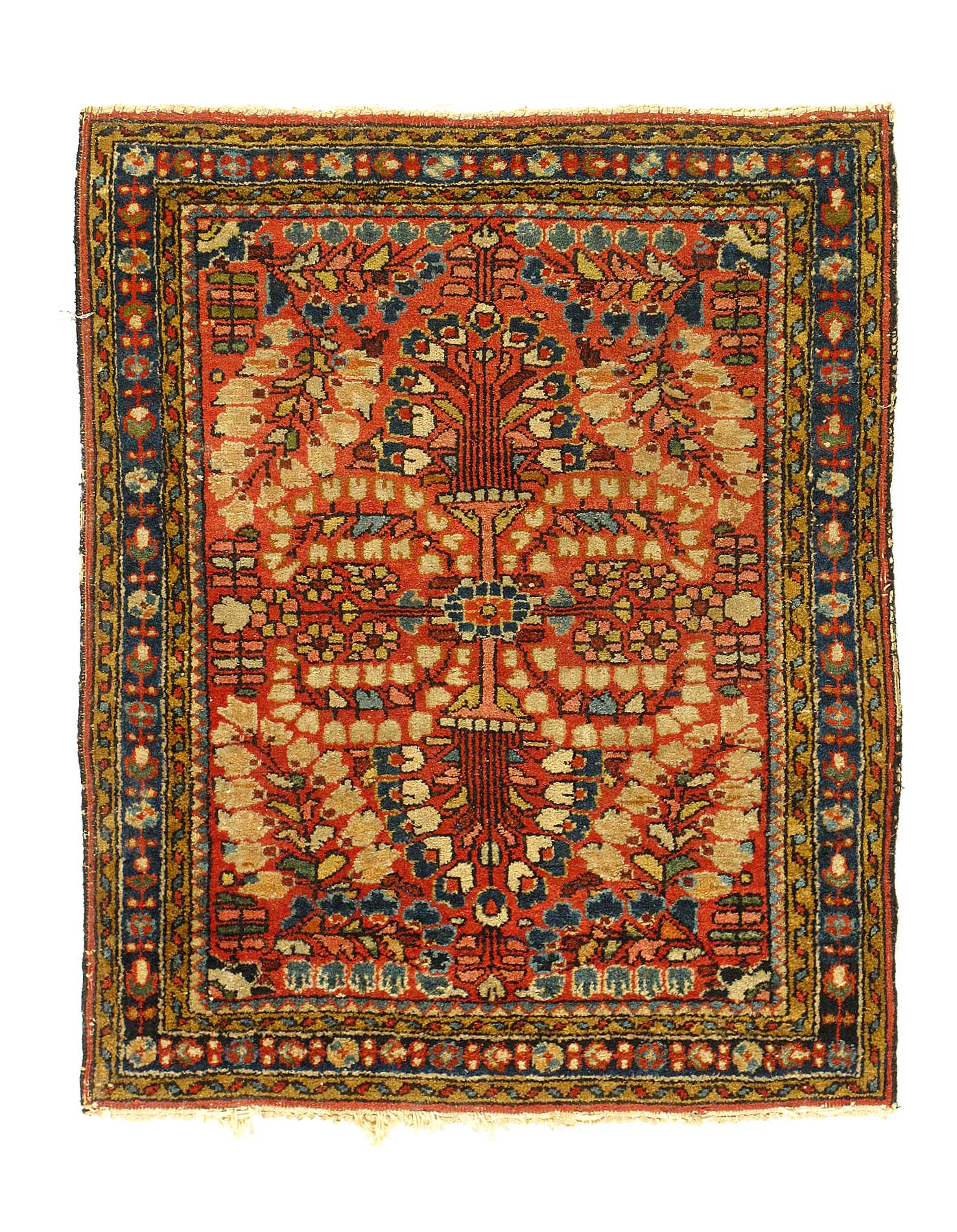 This is an antique handmade rug from the early 20th century. The piece was crafted from lamb's wool on a cotton foundation and was vegetable dyed. It has a dense, soft pile, and excellent quality, to ensure that you will enjoy it for years to come