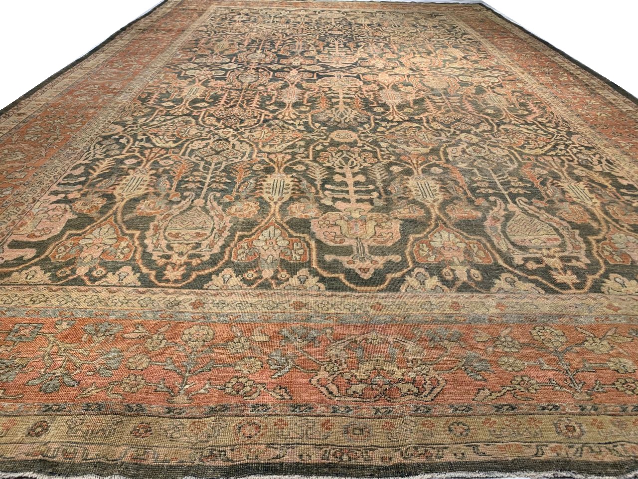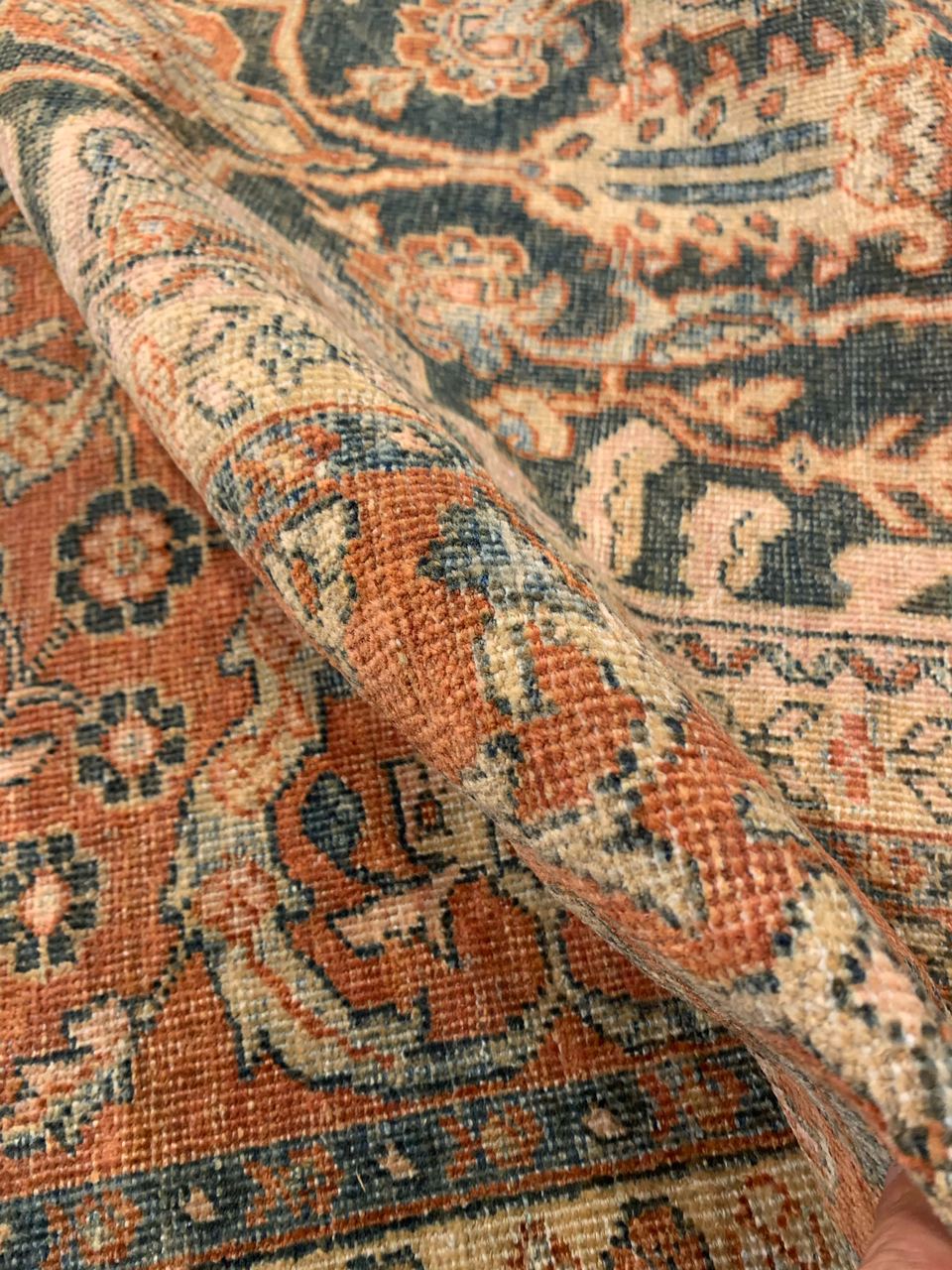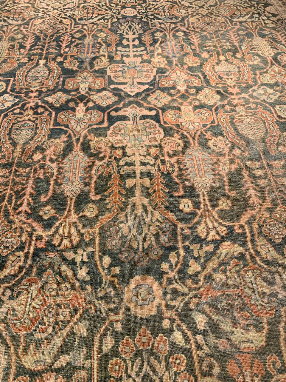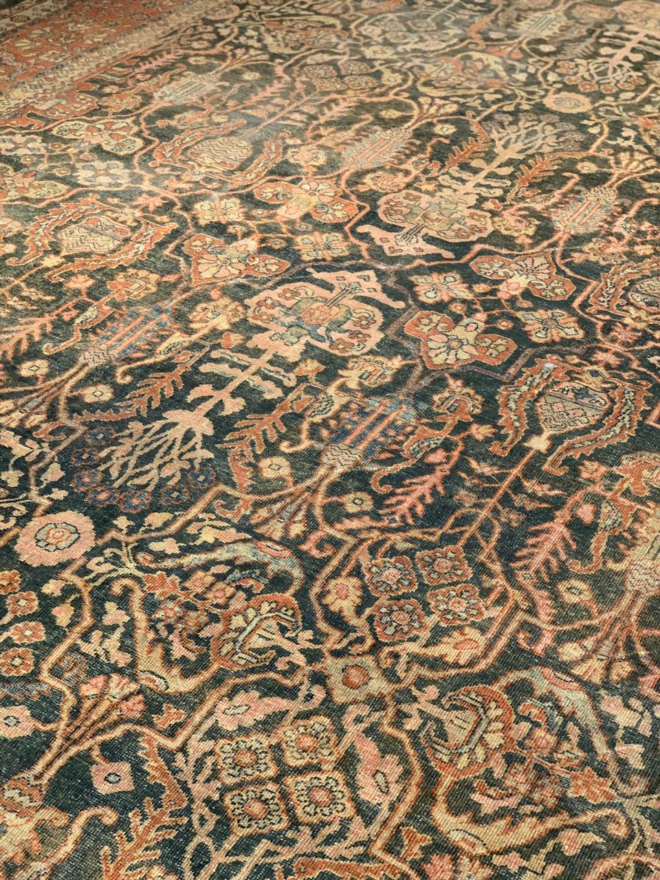 Beautiful Antique Sultanabad Persian Rug D09758, Country of Rug / Rug Type: Persian Rug, Circa Date: 1920 – A lesson in contrasts, this stunning antique Persian sultanabad mahal carpet features bold patterns that make it a real yet somewhat subtle statement piece for any interior decor. Covering the large center area, earthy motifs of medallions, feathers and floral pop off the dark background with bursts of cream and orange tones. The larger accenting border mirrors the center, with the brighter shades taking a starring role, and the dark accents peeking in and out of the smaller motifs as they dance around the rug. Thin, delicate borders that bring the design together in a neat and cohesive arrangement separate each section. This antique Persian rug has a distinct somewhat distressed patina, with fold lines visible both horizontally and vertically along the weave.