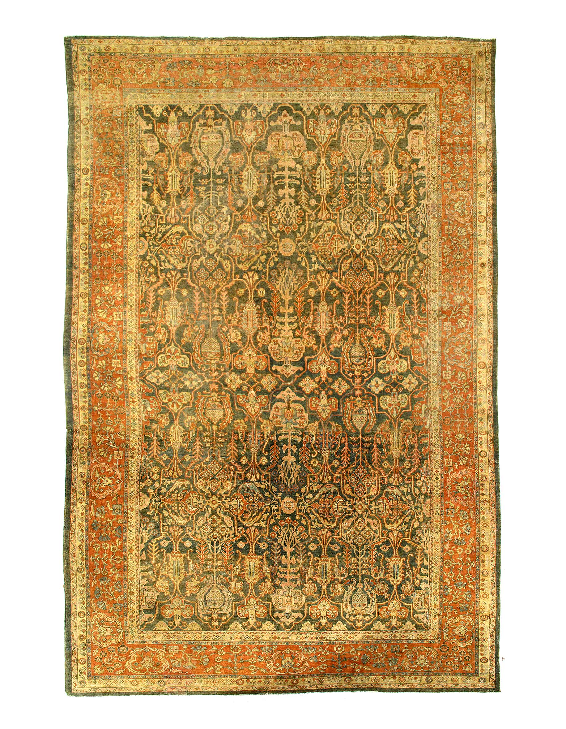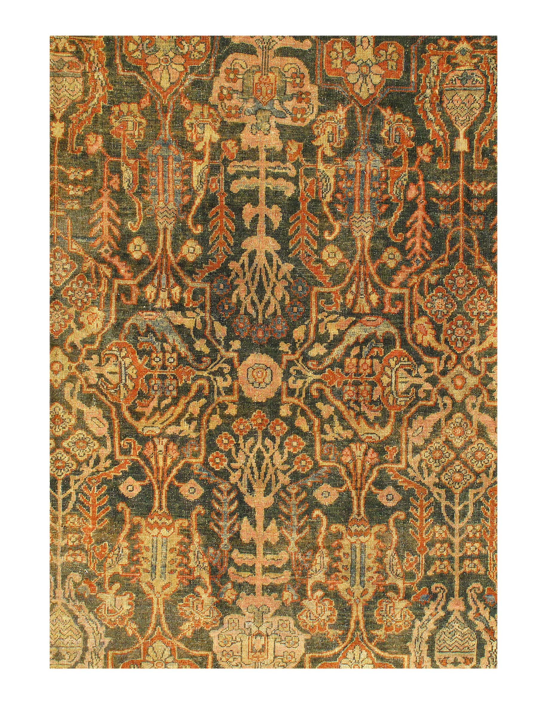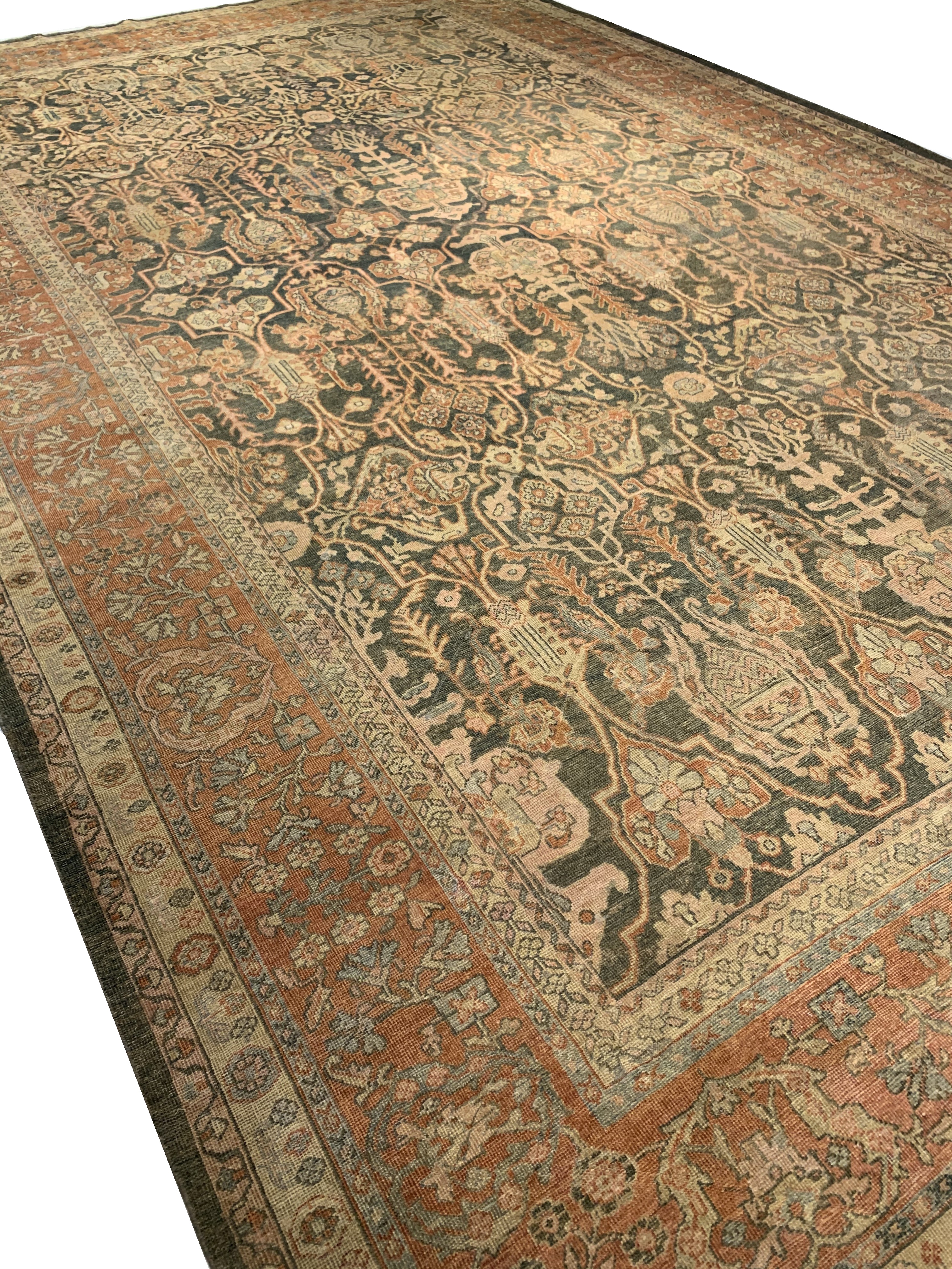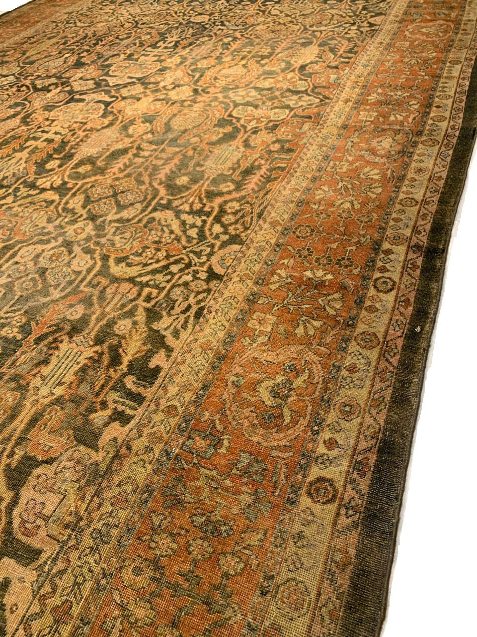 Beautiful Antique Sultanabad Persian Rug D09758, Country of Rug / Rug Type: Persian Rug, Circa Date: 1920 – A lesson in contrasts, this stunning antique Persian sultanabad mahal carpet features bold patterns that make it a real yet somewhat subtle statement piece for any interior decor. Covering the large center area, earthy motifs of medallions, feathers and floral pop off the dark background with bursts of cream and orange tones. The larger accenting border mirrors the center, with the brighter shades taking a starring role, and the dark accents peeking in and out of the smaller motifs as they dance around the rug. Thin, delicate borders that bring the design together in a neat and cohesive arrangement separate each section. This antique Persian rug has a distinct somewhat distressed patina, with fold lines visible both horizontally and vertically along the weave.