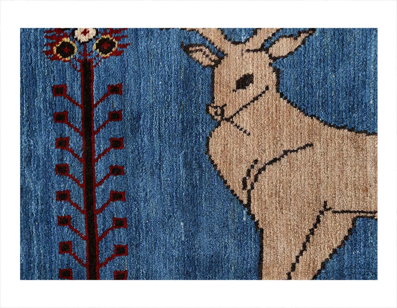 This tribal provenance is one of the most primitive, and collectible shabby-chic styles in handmade nomadic rugs. Exceptional Gabbehs like this are known for thick, lush pile, refreshing colors and bold geometric patterns. This particular design enjoys pictorial patterns, and emphasis on beige-blue, red in its distinguished, warm style. Keen-eyed connoisseurs will admire deer depictions in the field, uncommon for this provenance and lending a charm like that of folk art to this collectible.