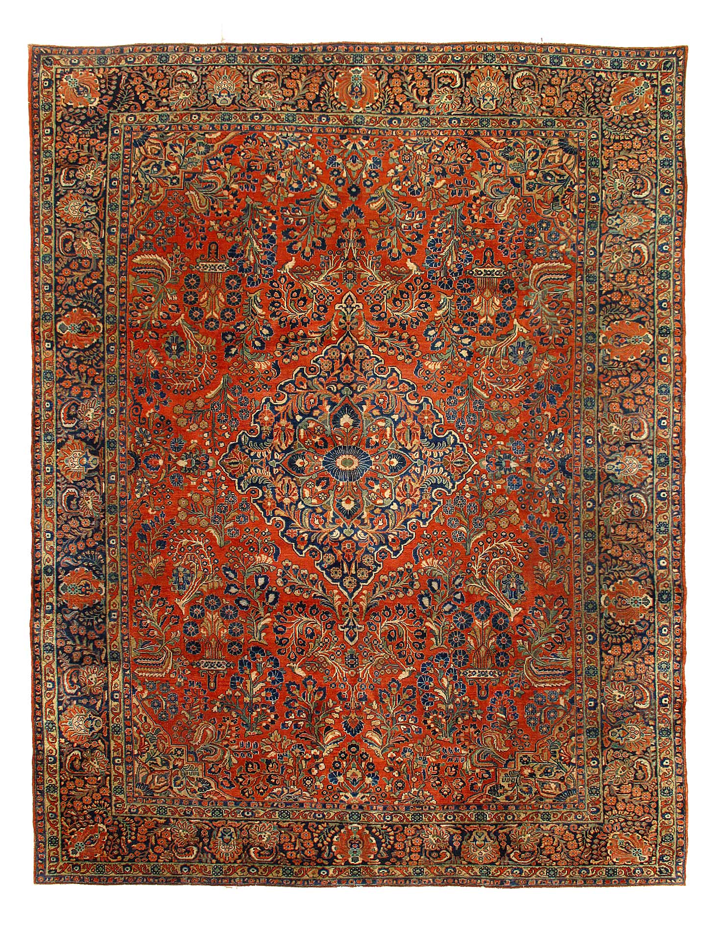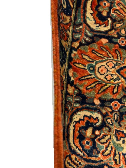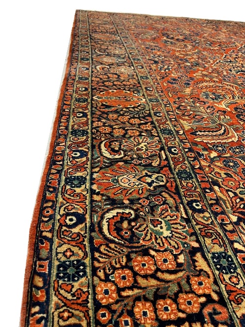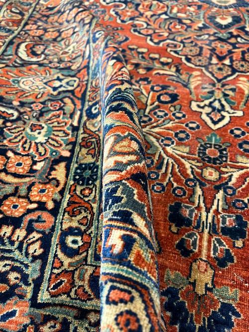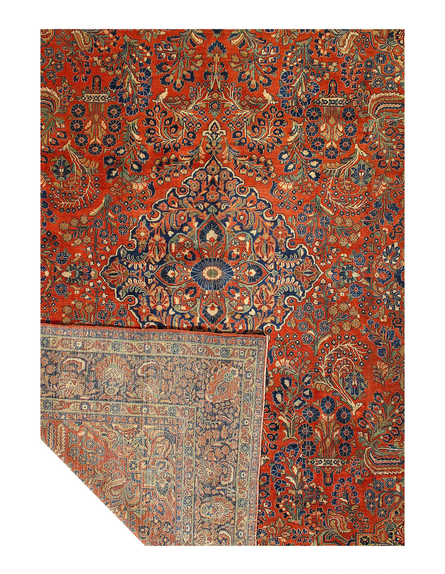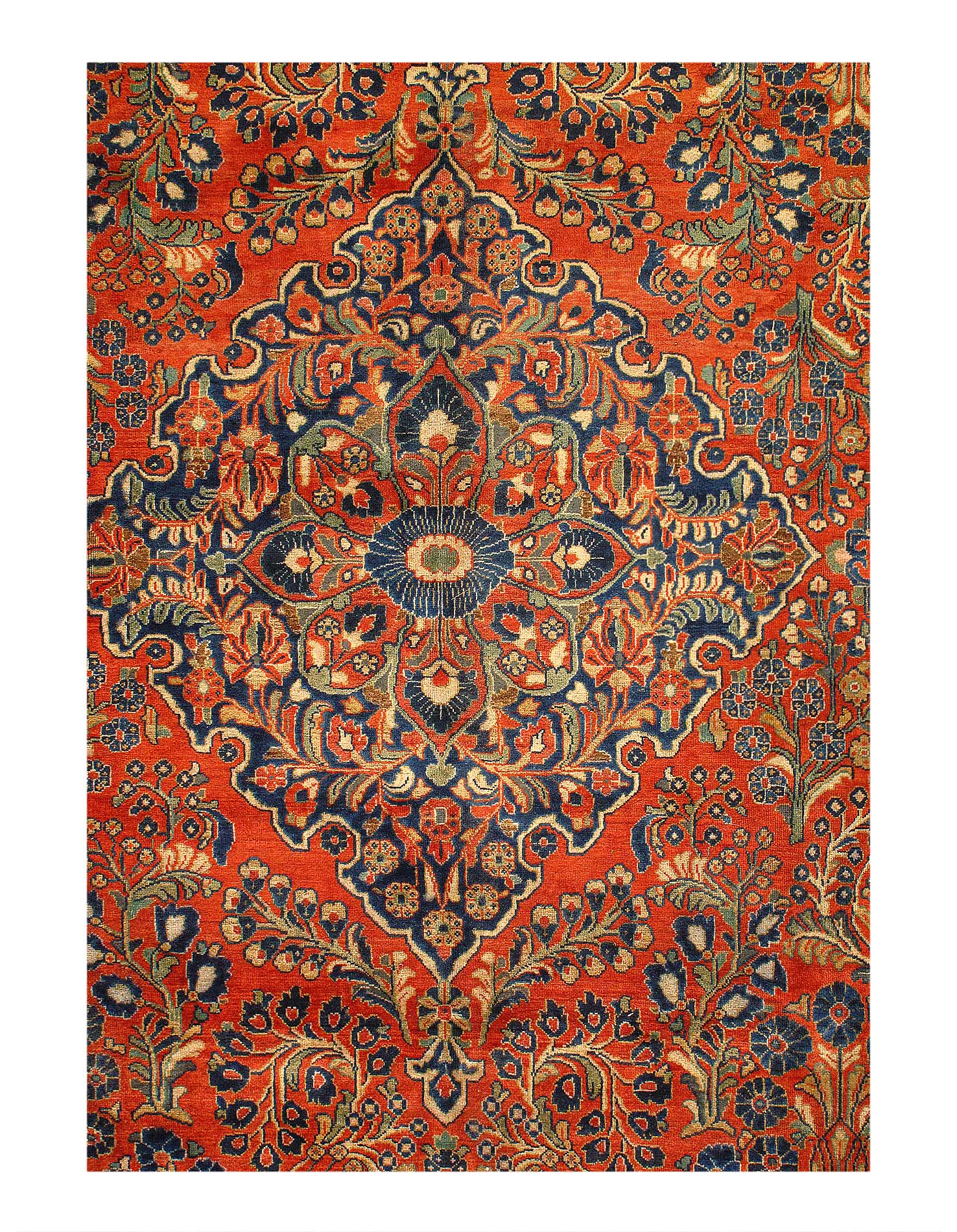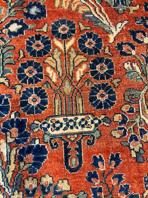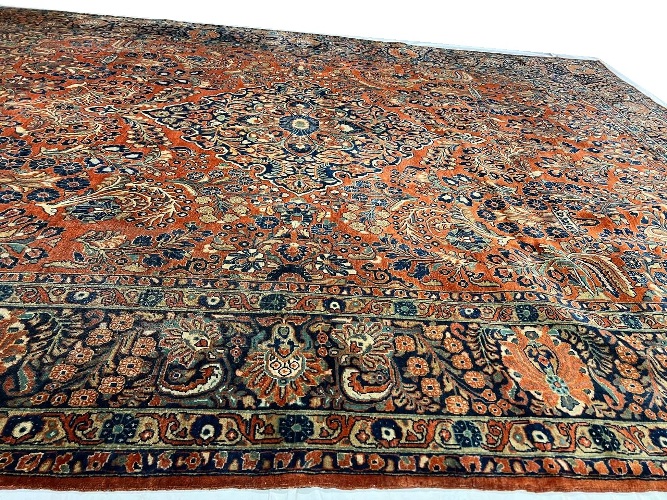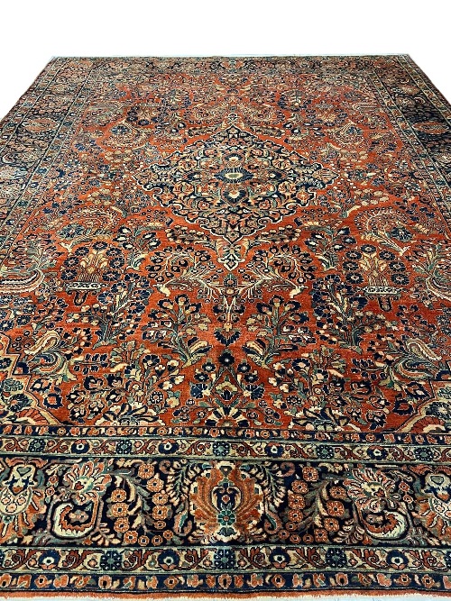 Sarouk rugs are among the most luxurious classically derived, room-sized Persian carpets. They were produced in the Arak region, not far from where Fereghans and Sultanabads were made. Some of the early examples were so closely related to Fereghans that they have been designated as Sarouk-Fereghans. While the latter tend to have medallion designs, Sarouk carpets from about 1900 onward were mostly produced in an allover format, with dense sprays or bouquets of flowers and vines arrayed across the carpet symmetrically, on a deep blue or burgundy ground. This latter type is known for its soft, velvety wool and fairly thick pile.