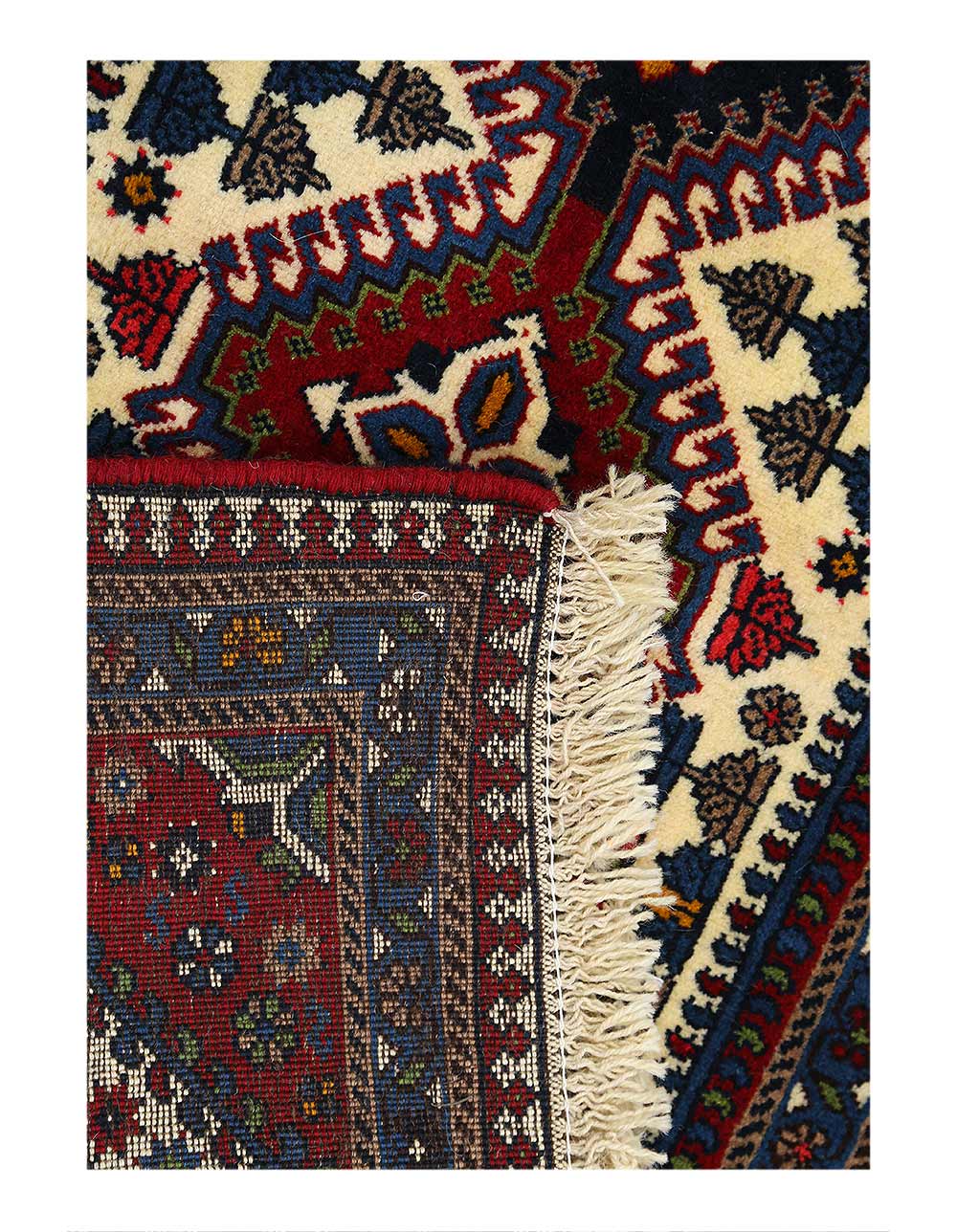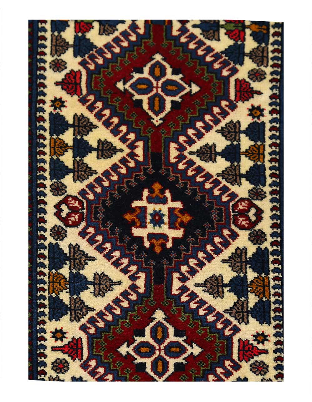 The pile used in Yalameh rugs is very fine, particularly in comparison to other tribal designs, using soft wool based on a Wool foundation. The pattern is distinctive with large repeated diamonds in a straight line down the carpet, often with geometrical animal or human prints scattered across the field. Dark red or light brown on a blue or orange background is most common for Yalameh, similar to Shiraz rugs, the rugs compliment modern or minimalist furniture beautifully, giving the living space an aura of luxurious style and warm.