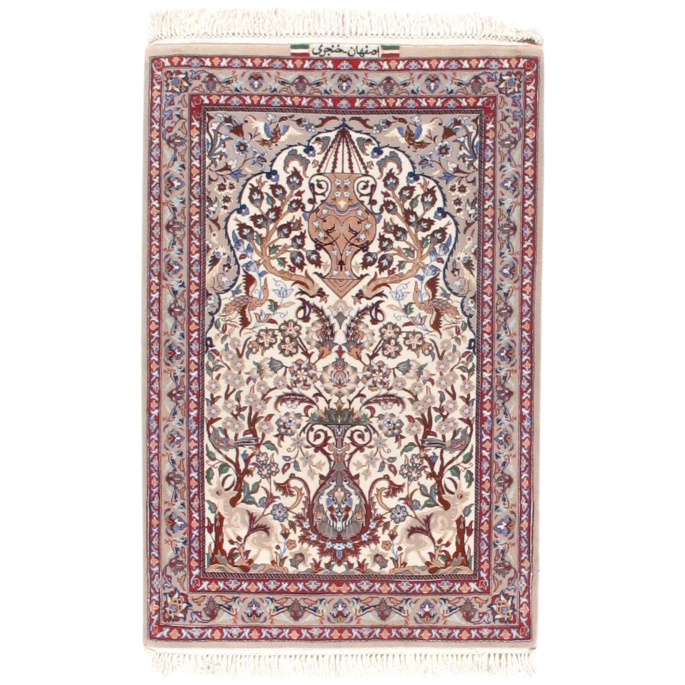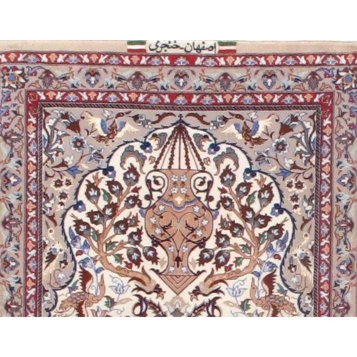 Original Fine Persian Isfahan Rug Tree of Life Handmade Hand-knotted KHANJARI Signed Silk & Korker Wool on a Silk Foundation Vegetable Dyed This rug has a dense, soft pile, and excellent quality, to ensure that you will enjoy the look and feel of your rug for years to come.