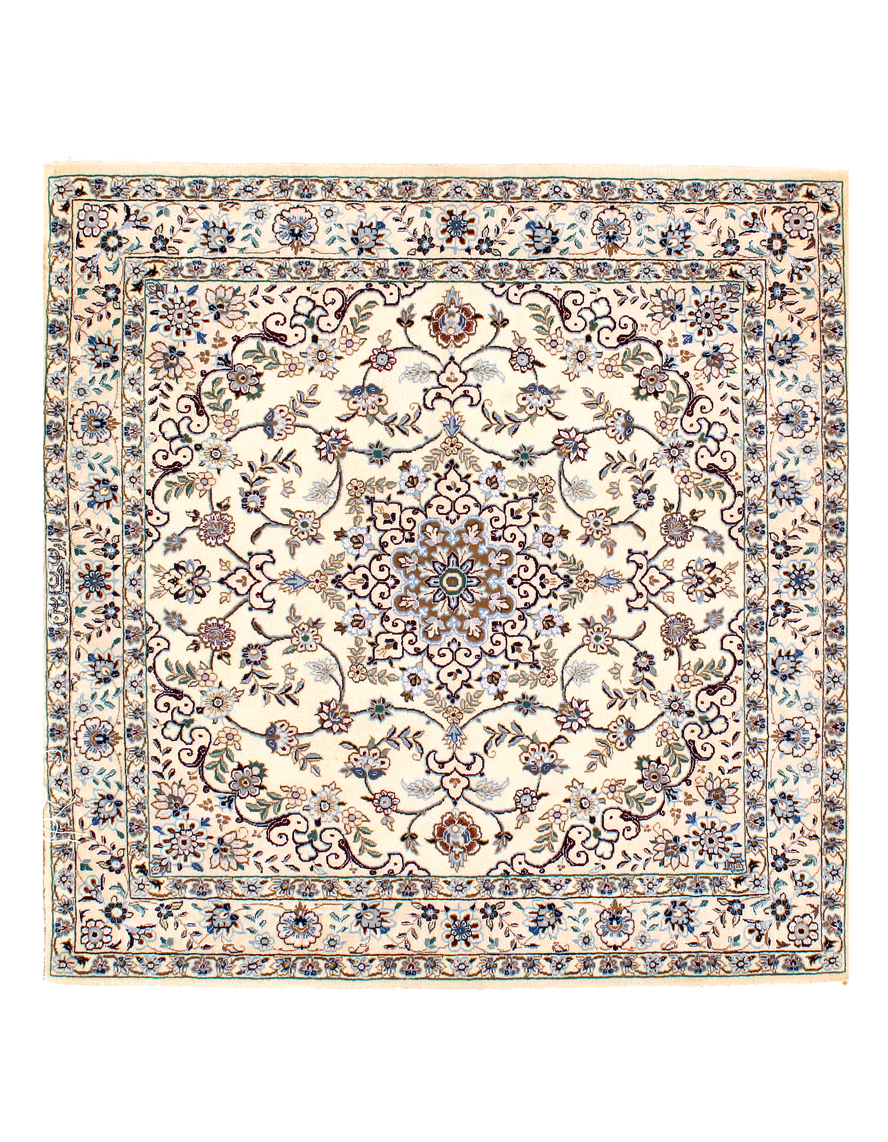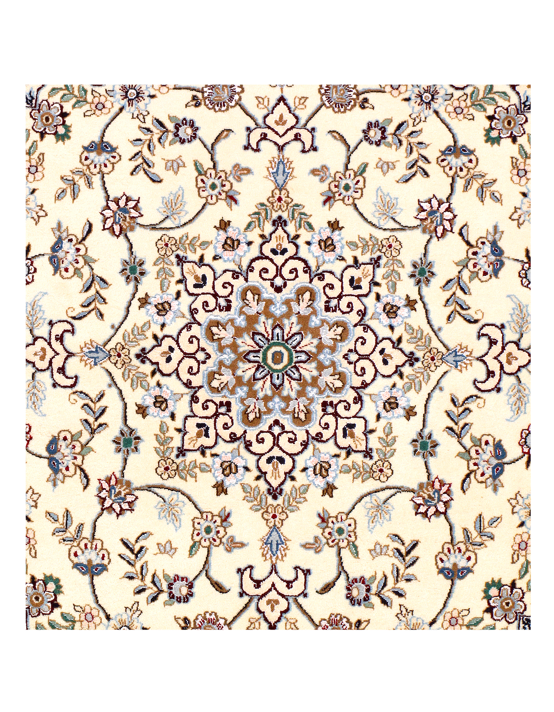 Persian Nain rugs are renowned for their detail and fine use of outlining along the central motifs. Breaking from the classical style of many vintage rugs produced around central Iran, Persian Nain rugs became renowned for their modern appeal and personal style, establishing the classical motifs of many other regional rugs, only through a more precise lens. In this striking piece, the precision is particularly visible along the heart of the vintage Persian rug, where the attention to detail allows each individual color to stand out as a unique part of the whole. The surrounding borders help ground the masterpiece and add horizontal intrigue to the natural elements within, which are arranged vertically to establish a cascading effect.