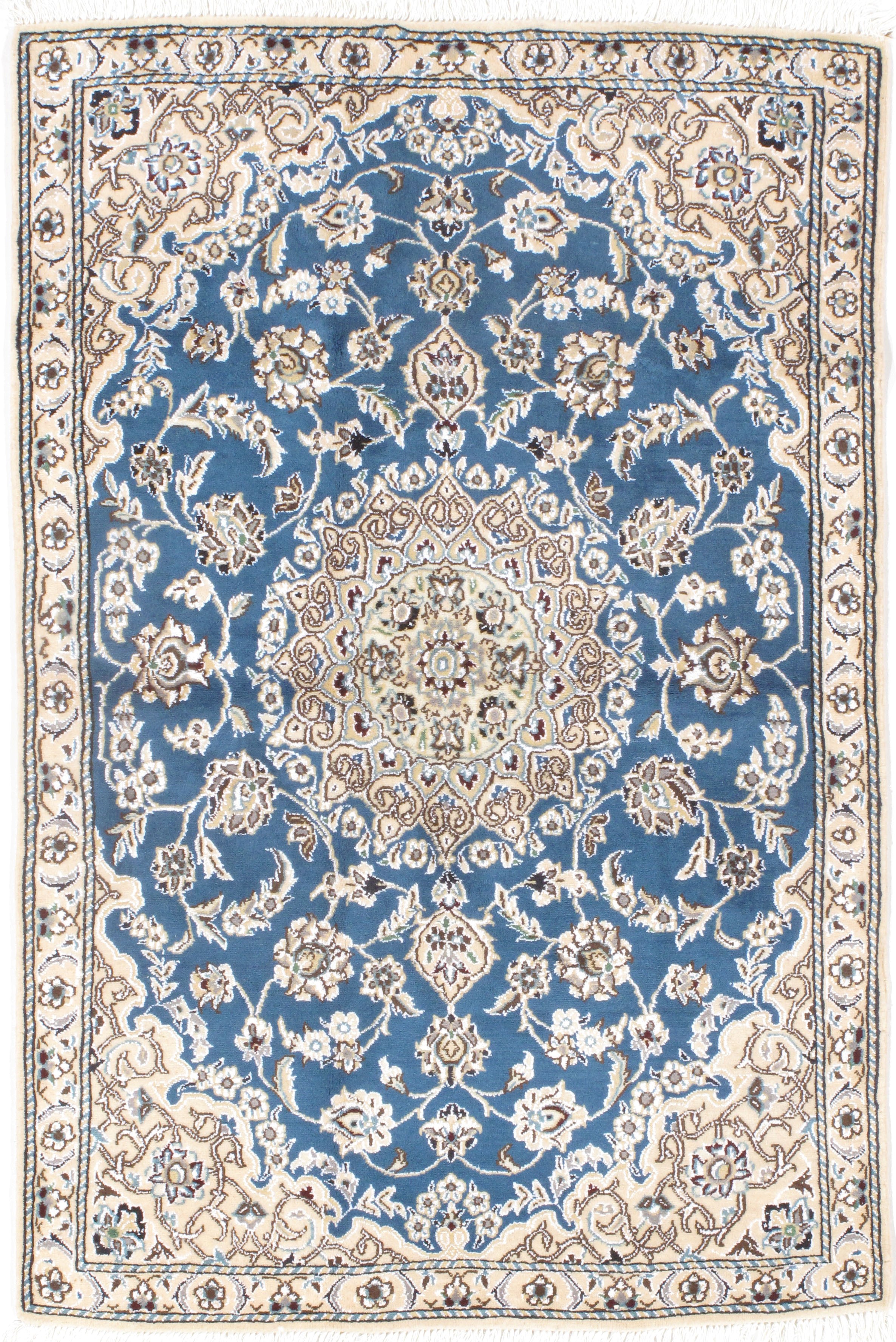Beautiful hand knotted Nain rug from Persia. Original Fine Persian Rug. Handmade Hand-knotted Silk & korker wool on a Silk .Classical combination of colors: blue ground with cream border.