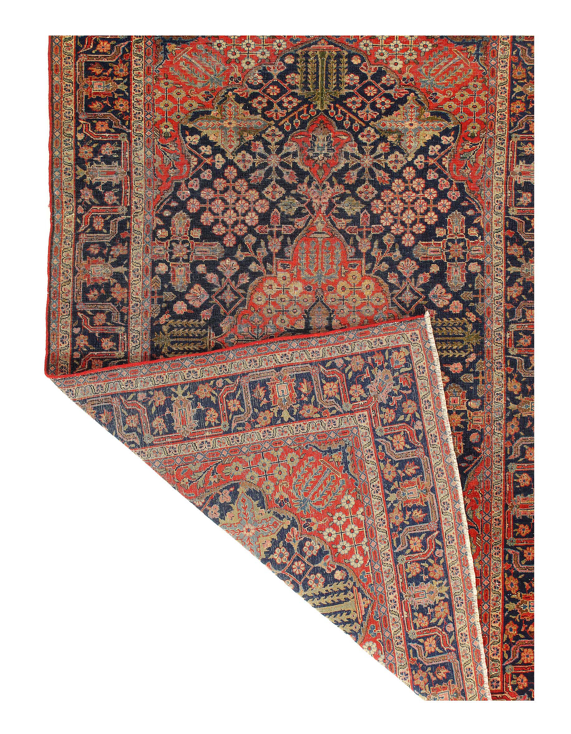The rich brick red colored central medallion is set against the light creamy white color of central field. This creates a magnificently exciting juxtaposition which also helps to showcase the beautiful intricacy of the design patterns.