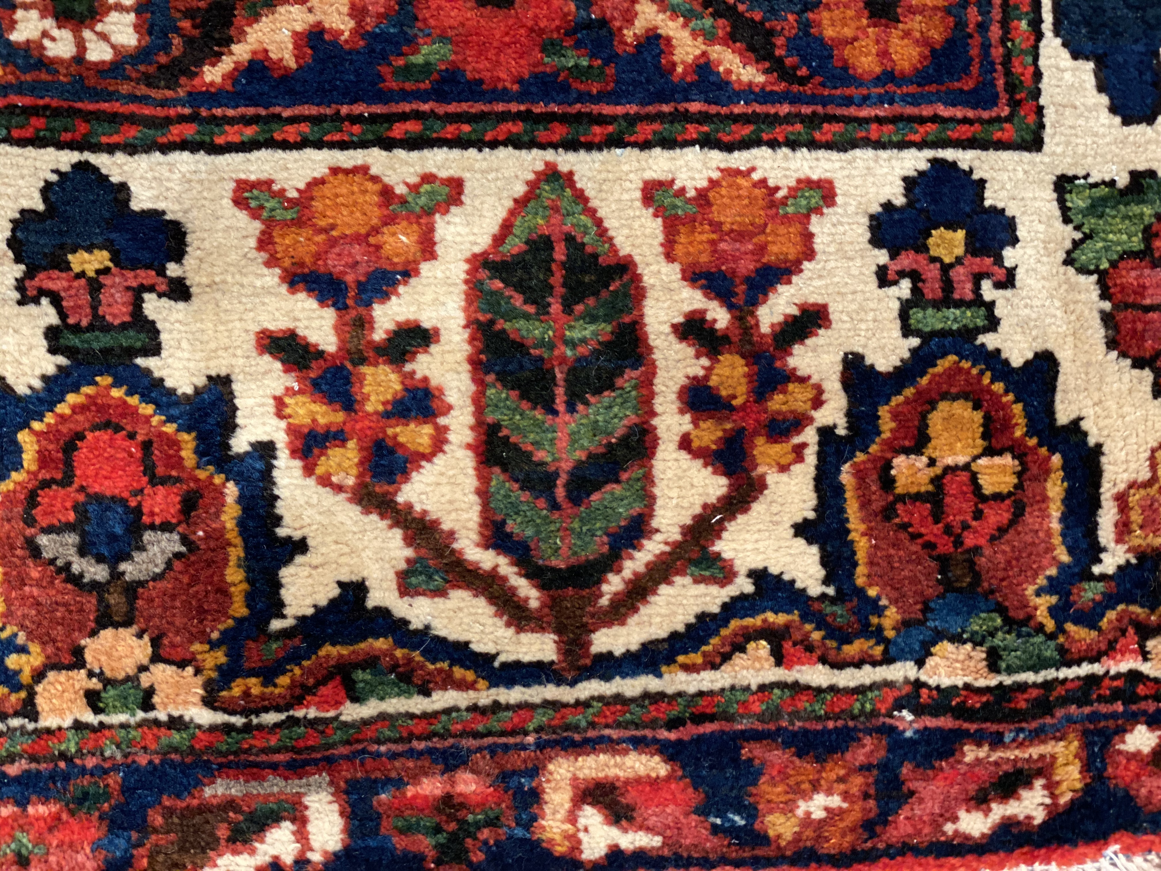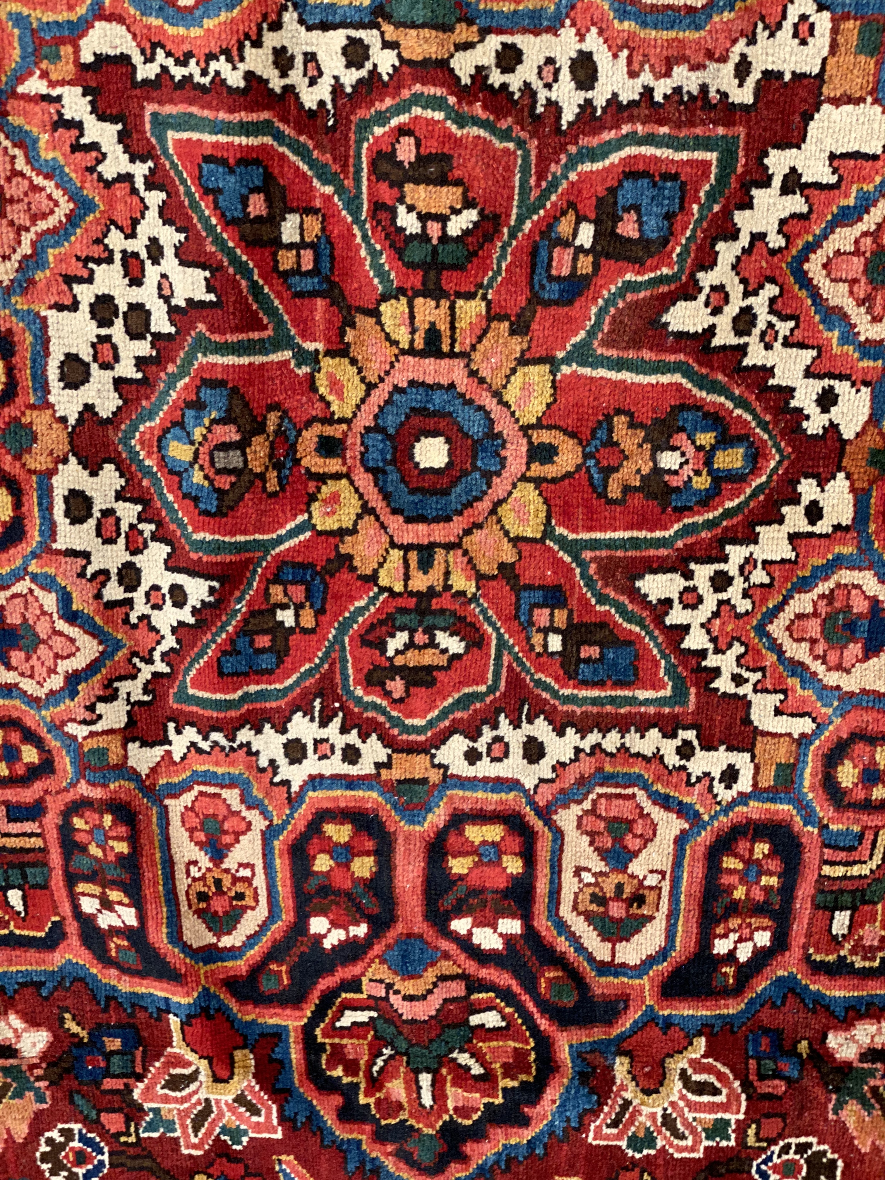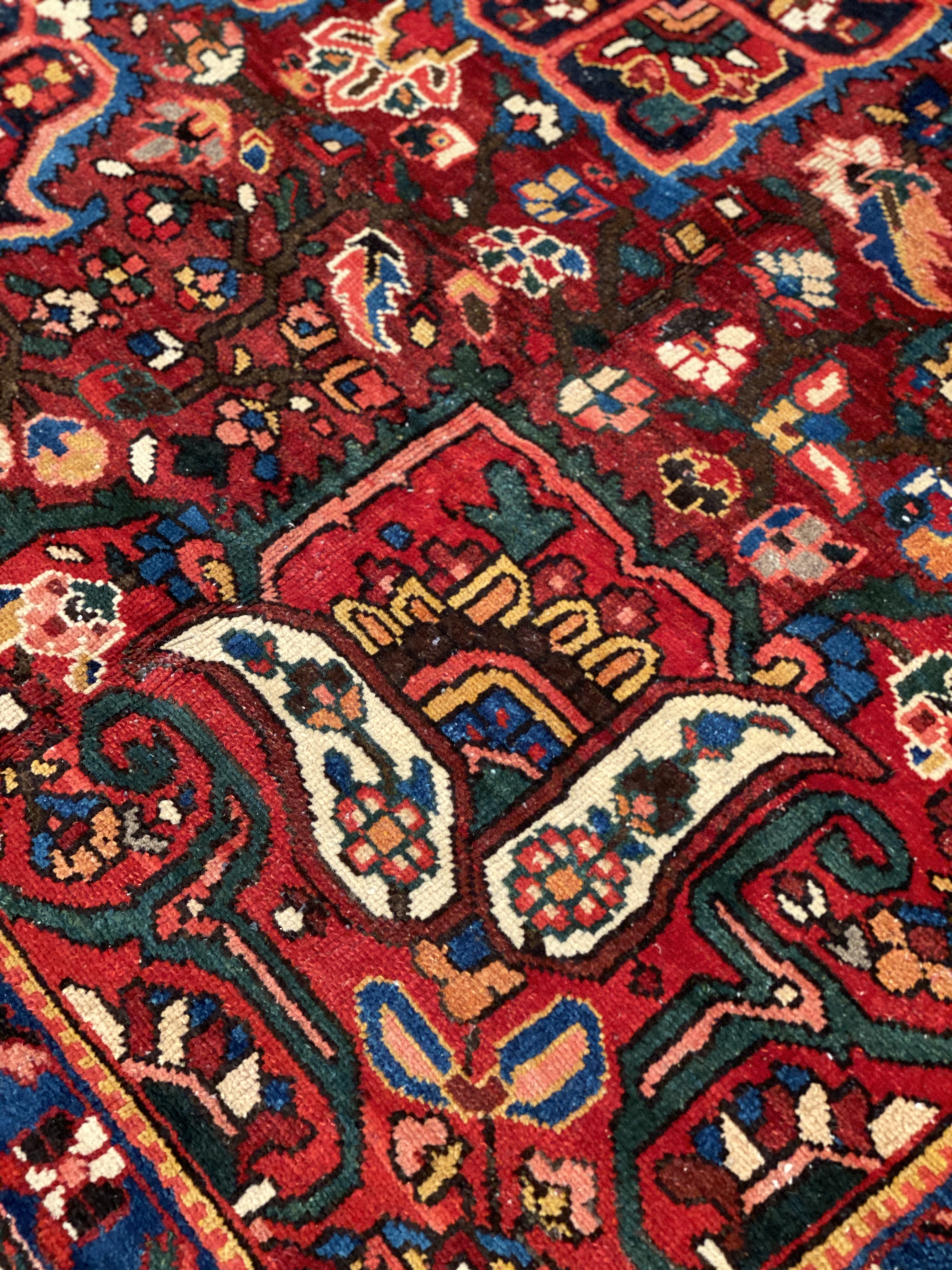 The luxurious hand-knotted pile is made from very fine lamb's wool and features a traditional Bakhtiari motif throughout. Handmade hand-knotted lamb's wool on a cotton foundation. This rug has a dense, soft pile, and excellent quality, to ensure that you will enjoy the look and feel of your rug for years to come.