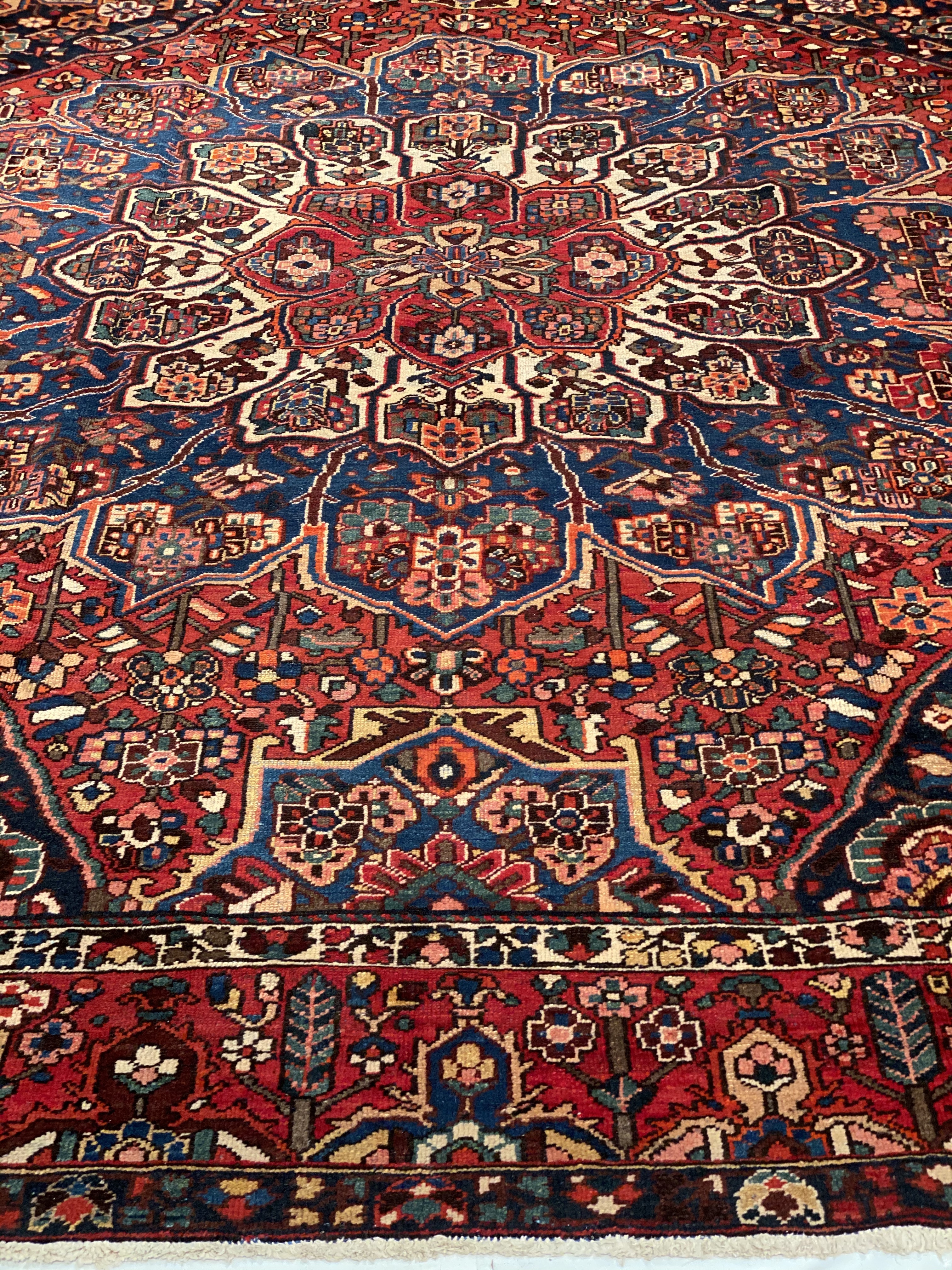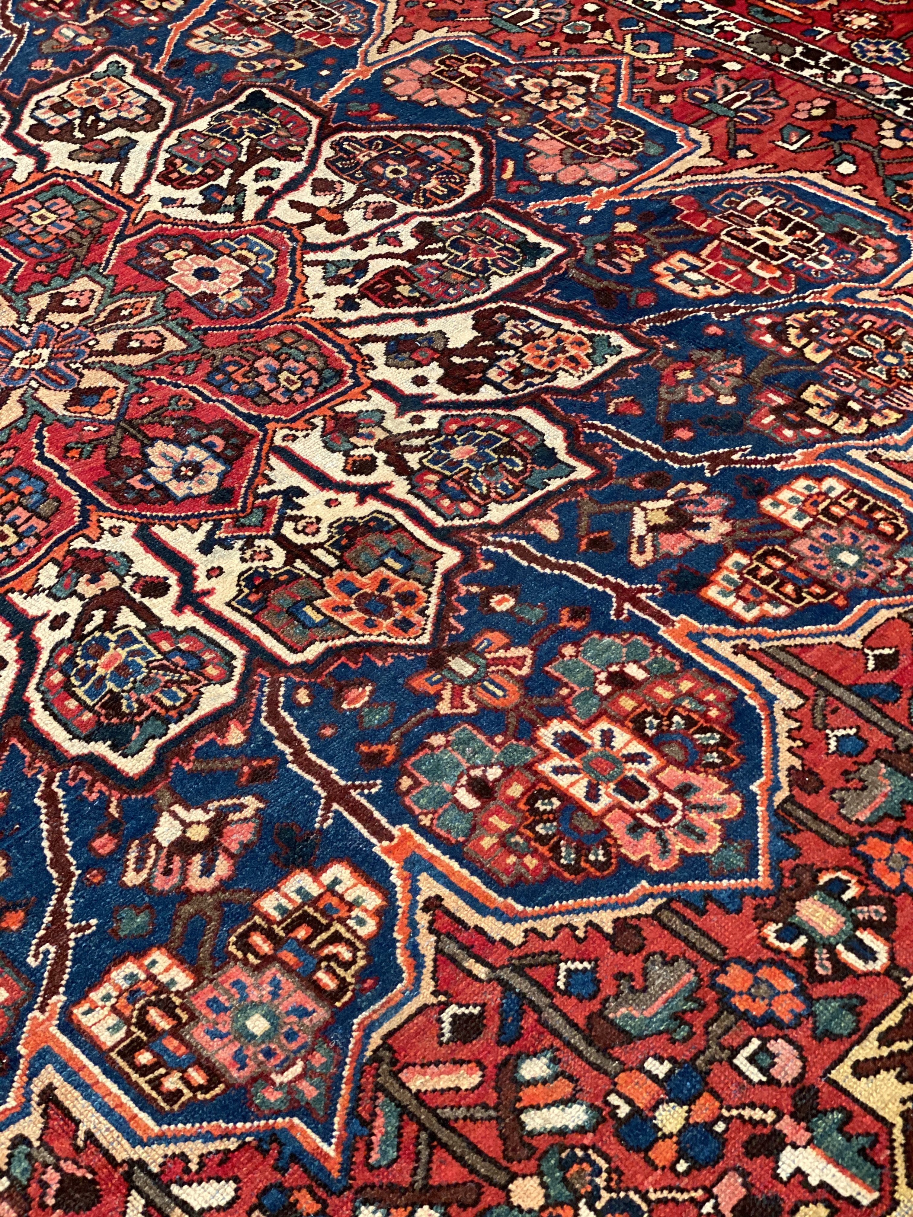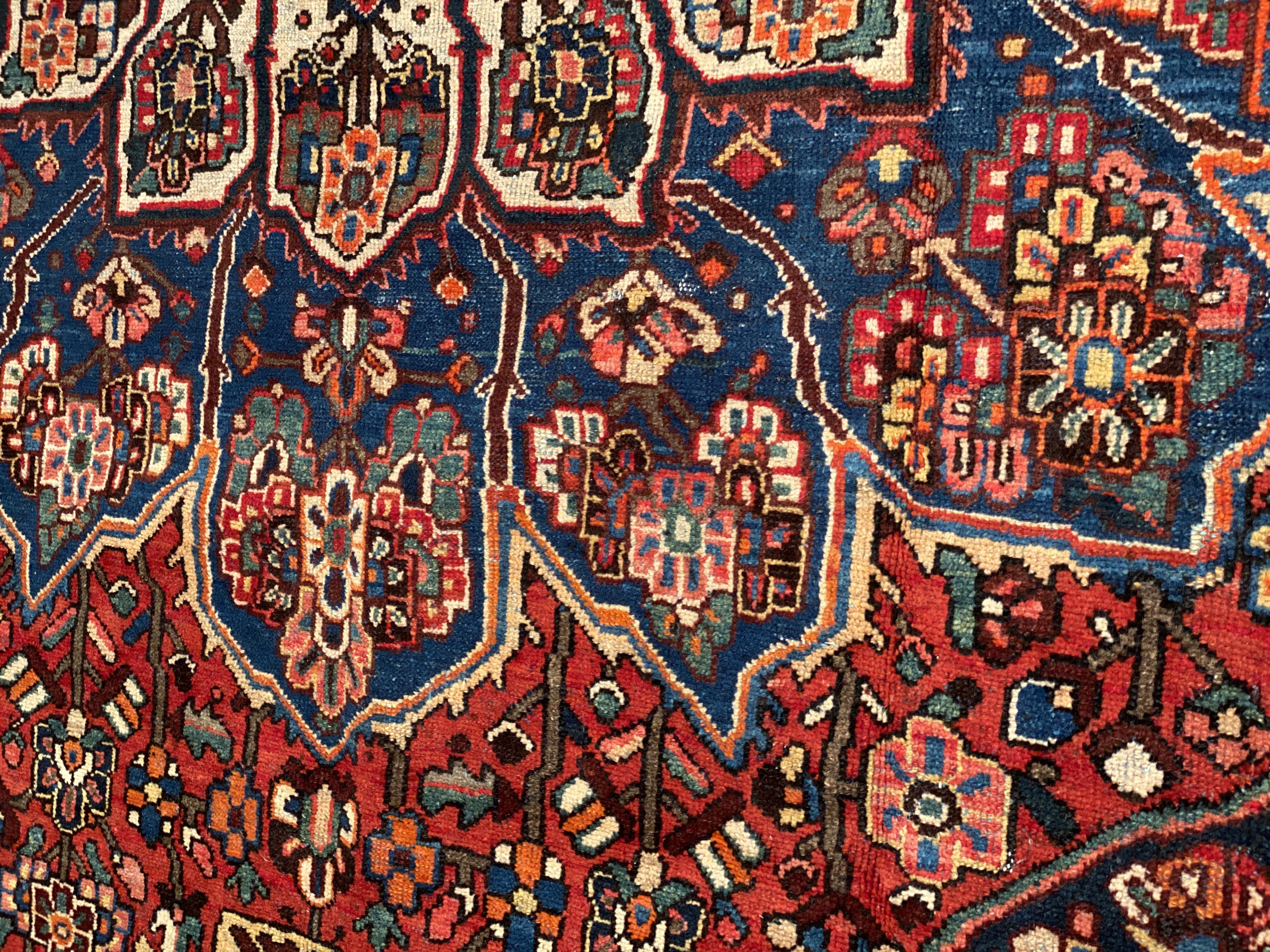 Persian Bakhtiari area rug. The luxurious hand-knotted pile is made from very fine lamb's wool and features a traditional Bakhtiari motif throughout. Handmade hand-knotted lamb's wool on a cotton foundation. This rug has a dense, soft pile, and excellent quality, to ensure that you will enjoy the look and feel of it for years to come.