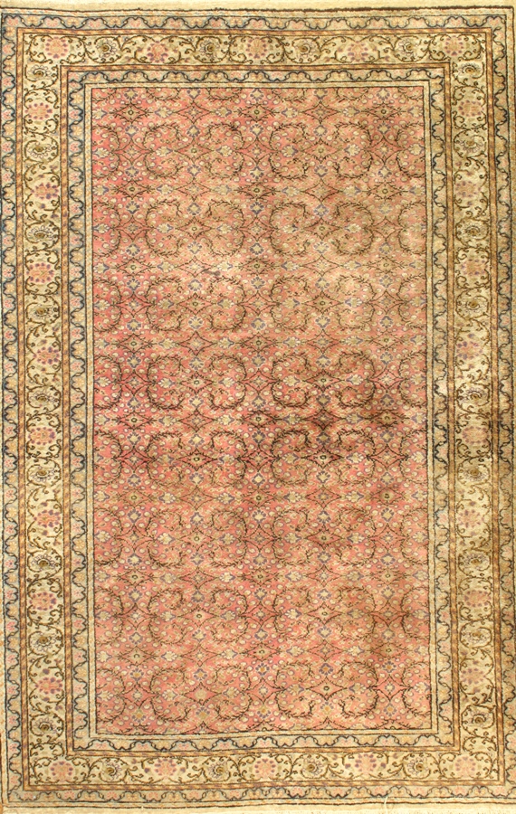 This magnificent Turkish carpet. Produced in the balmy coastal city of Hereke, this beautiful piece displays the rich softness and exquisite artistry unique to the textiles of Hereke. Florals dominate the richly colored designs of this stunning work. The carpet begins with a pale Gold border patterned with exquisitely rendered floral motifs. These vivid symbols surround a soft pink background patterned with exquisite blossoms, the delicacy of which is emphasized by soft flourishes of green and blue. This frames a beautifully contrasting midnight border patterned with exquisitely detailed, vividly rendered motifs of the lotus and the lily. A mirrored pink color frame follows, framing the warm, exquisite heart of this stunning work of art. Intricacy defines the tightly woven flower vines, themselves forming soft, curved designs of astonishing delicate beauty. provide a warm and richly bright contrast against the earthy pink of the base. Stunning, intricate, and breathtakingly lovely, this exquisite antique carpet is a truly singular work of art.