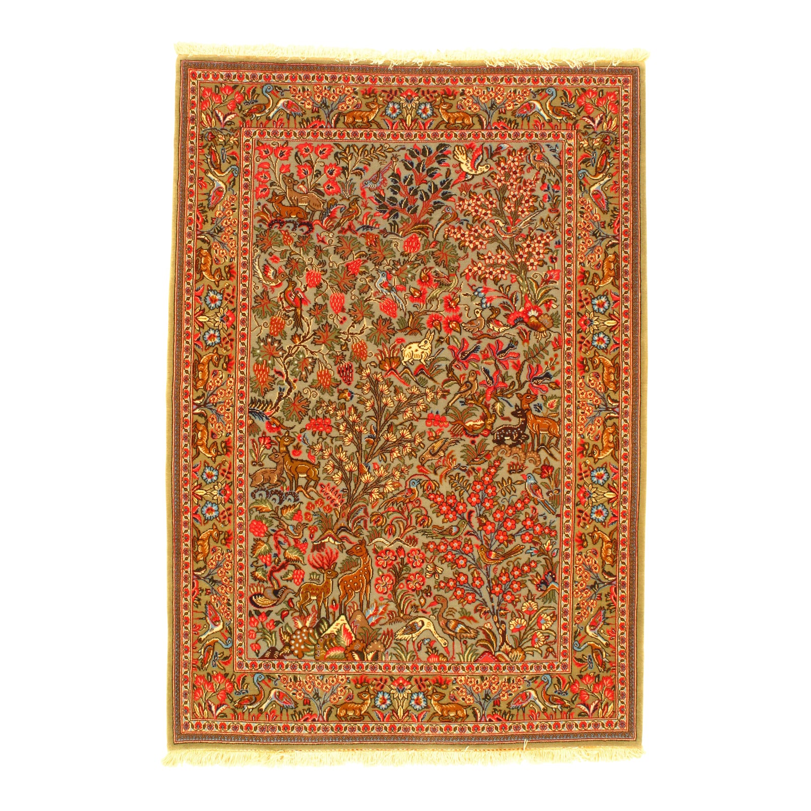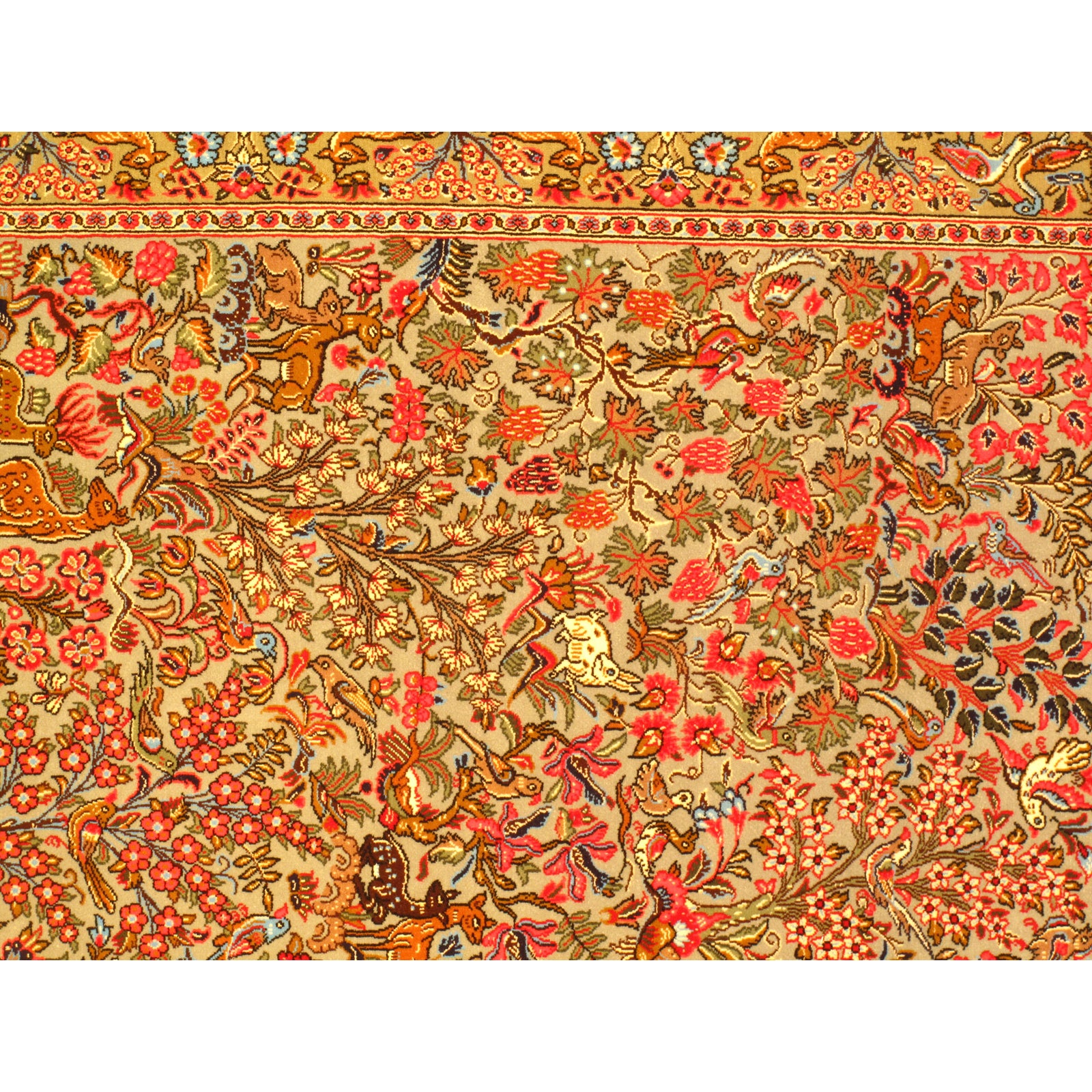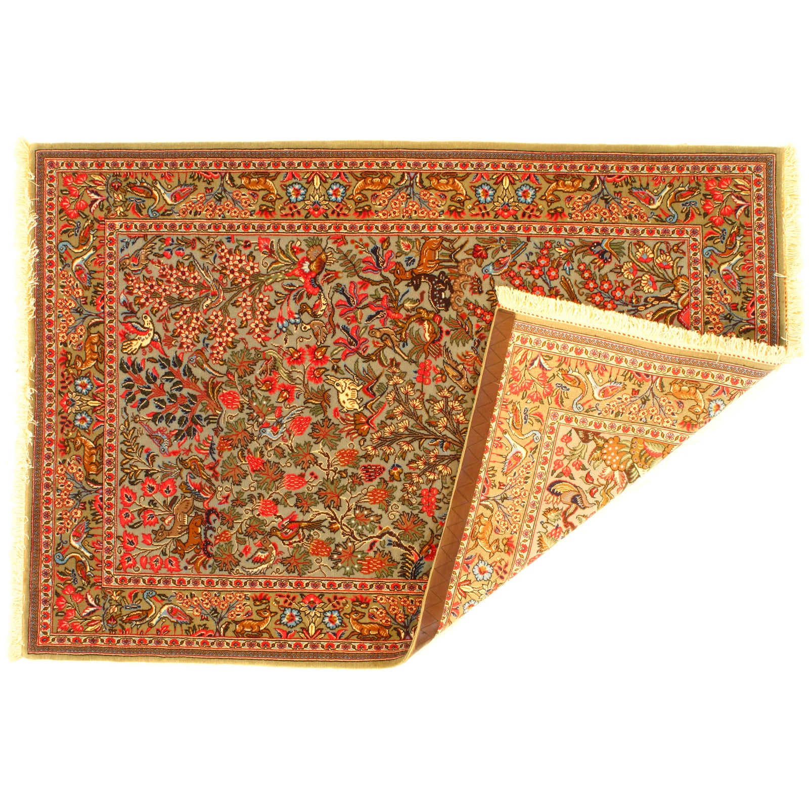 Fine Persian handmade hand knotted in Qum Iran Lamb's Wool on a Cotton Foundation Tree of life This rug is in excellent condition. This rug has a dense, soft pile, and excellent quality, to ensure that you will enjoy the look and feel of your rug for years to come.