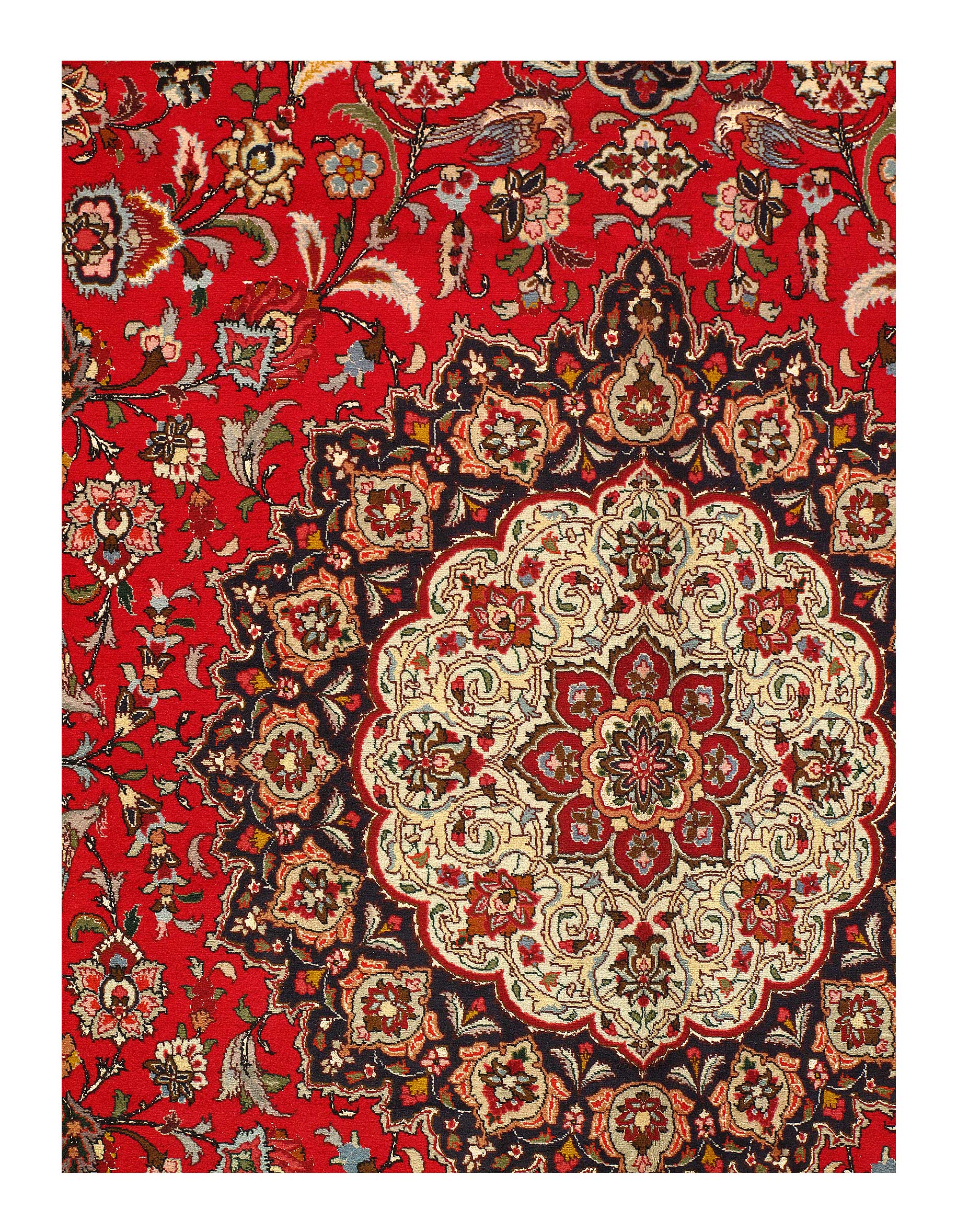 During the great revival of rug weaving in the nineteenth century Tabriz still had its master rug weavers designers like the famed Haji Jalili. Given this long and distinguished tradition, it comes as no surprise that no other Persian center of rug weaving can demonstrate such a wide range of designs or pattern types. The Tabriz design repertory is in fact so varied and extensive, that its products cannot be identified according to the rug’s design pattern or motif, but rather through the distinctive combination of refined classical Persian motifs with a preference for symmetrical knotting, extra wefts, and dyed warps.