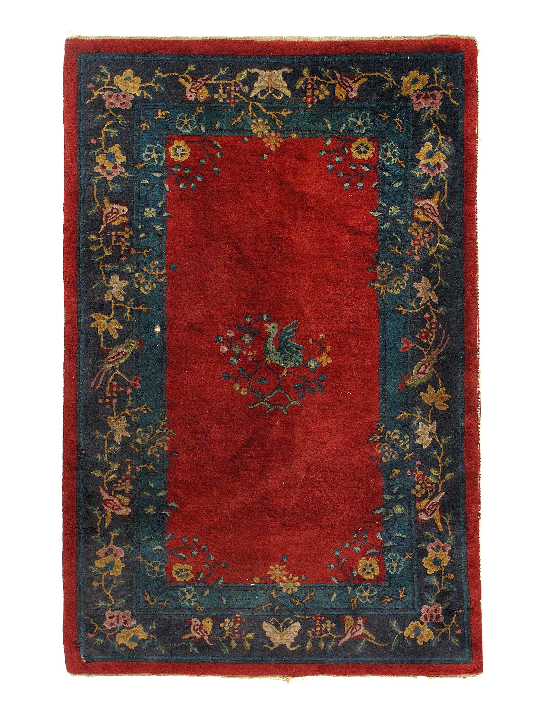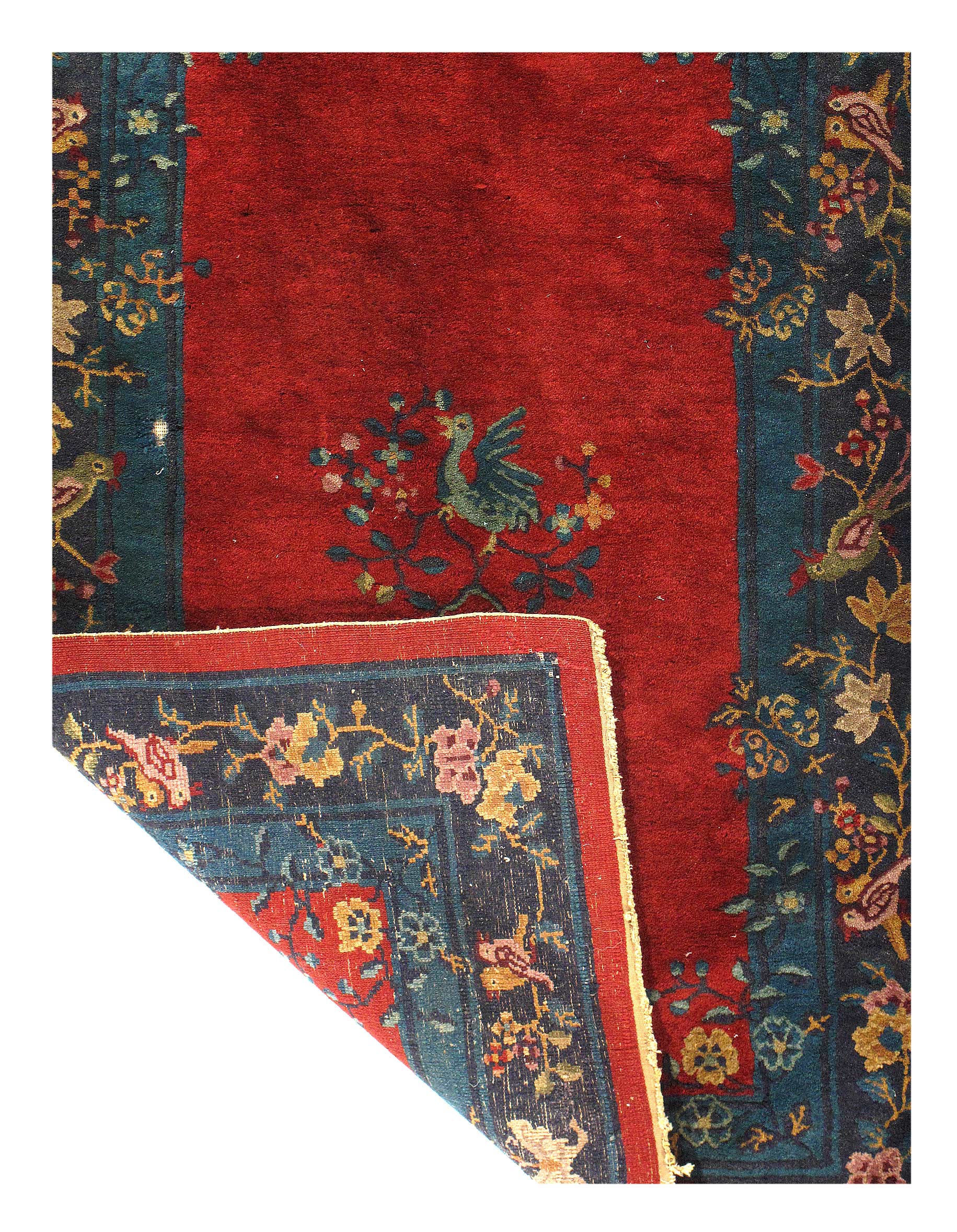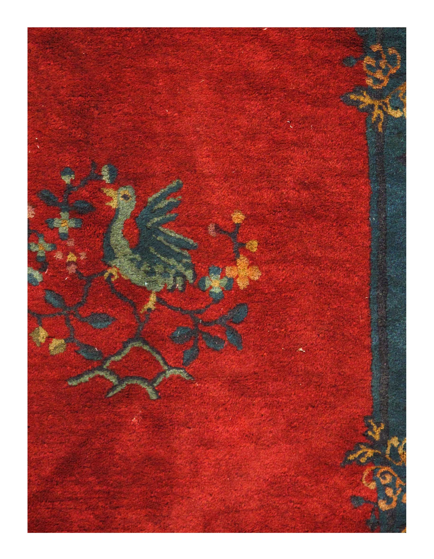 Chinese Deco Rug, Origin: China, Circa: Early 20th Century – Here is an exciting and appealing antique Oriental carpet – an antique Art Deco rug that was designed and woven in China during the early years of the twentieth century. Heavily informed by the aesthetic inclinations of the Art Deco period, this unique carpet is a compelling and thought-provoking example. A scalloped border of Blue encloses a Rose / Rust sand field on this exquisitely subtle and restrained antique Chinese Art Deco. At first the field appears empty or open, but it is actually covered by a tone-on-tone design of scrolls and cloud-bands emanating inward from the outer edges. In their sinuous rhythms they echo the scalloped forms of the border and continue its visual effects across the carpet in a more subdued manner. This carpet testifies to the masterful design sensibilities of Chinese weavers as they made the transition into the modern world. The Art Deco movement had an outside influence on the world of art and design, and some of the most important qualities and characteristics of that movement may be found in this fine rug.
