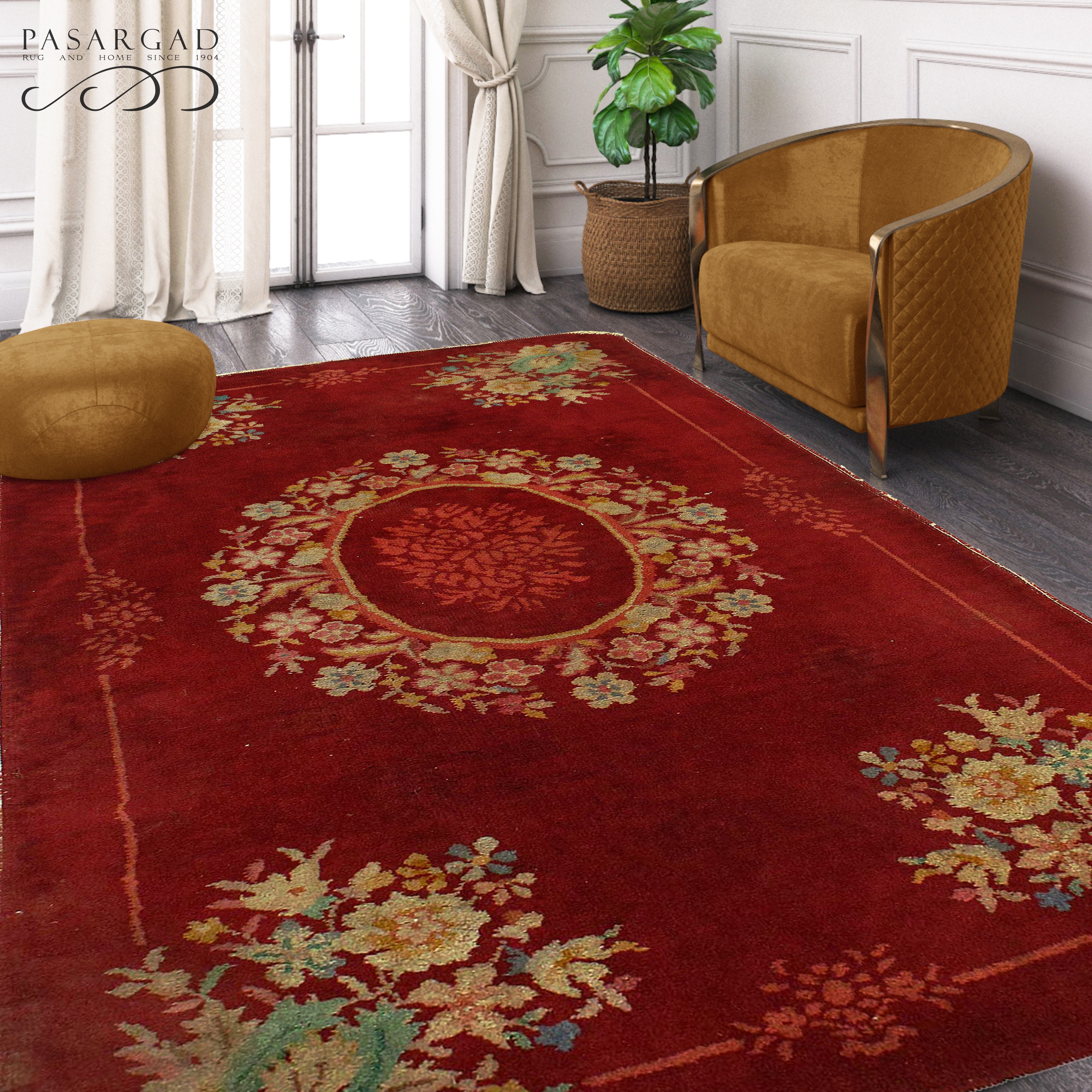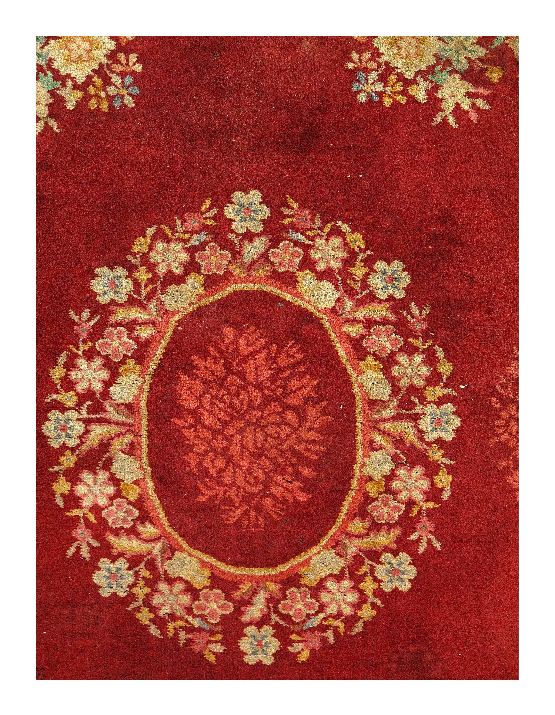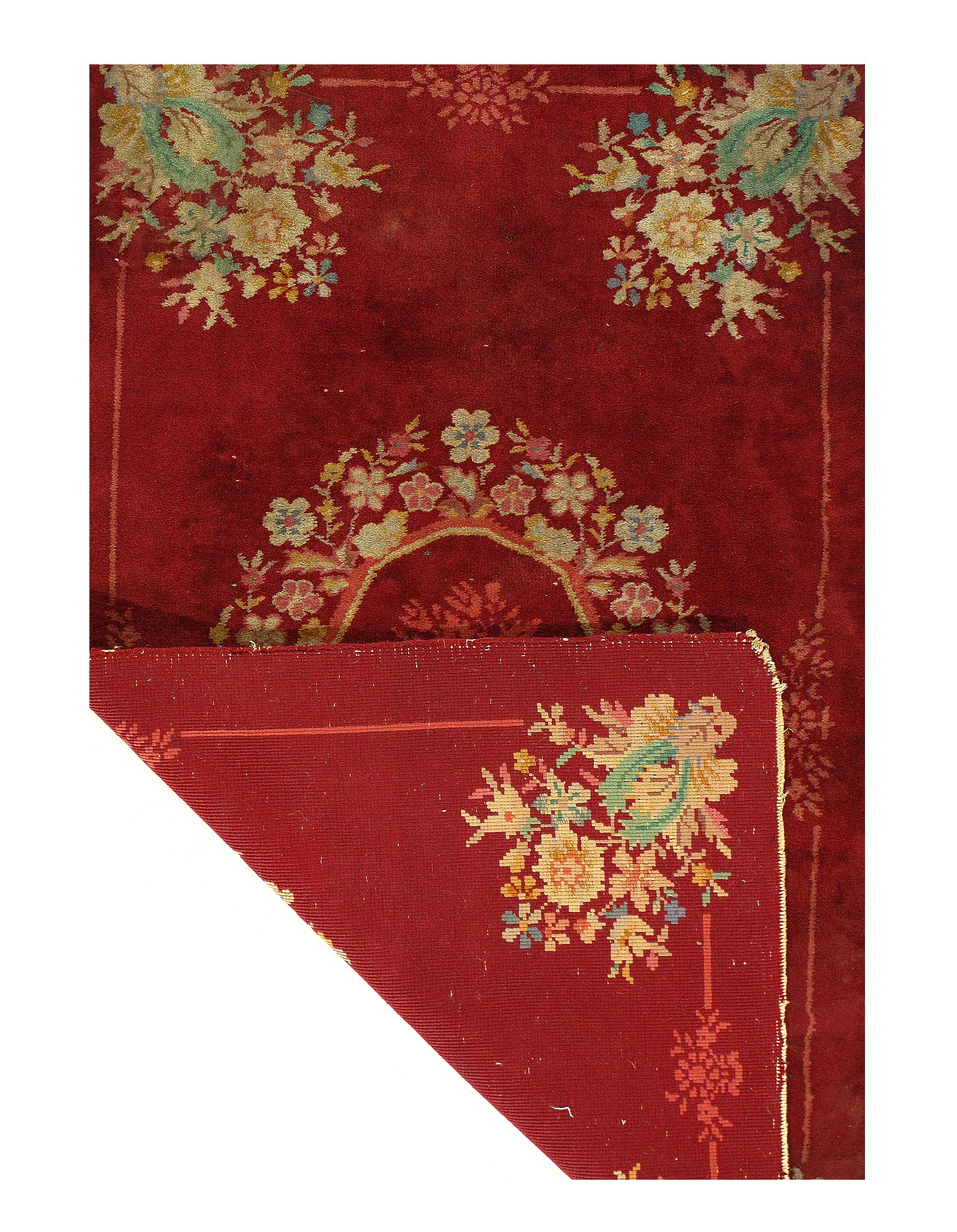 Antique Chinese Deco Rug, Origin: China, Circa: Early 20th Century – Here is an exciting and appealing antique Oriental carpet – an antique Art Deco rug that was designed and woven in China during the early years of the twentieth century. Heavily informed by the aesthetic inclinations of the Art Deco period, this unique carpet is a compelling and thought-provoking example. A scalloped Red encloses a Beige sand field on this exquisitely subtle and restrained antique Chinese Art Deco. At first the field appears empty or open, but it is actually covered by a tone-on-tone design of scrolls and cloud-bands emanating inward from the outer edges. In their sinuous rhythms they echo the scalloped forms of the border and continue its visual effects across the carpet in a more subdued manner. This carpet testifies to the masterful design sensibilities of Chinese weavers as they made the transition into the modern world. The Art Deco movement had an outside influence on the world of art and design, and some of the most important qualities and characteristics of that movement may be found in this fine small rug.