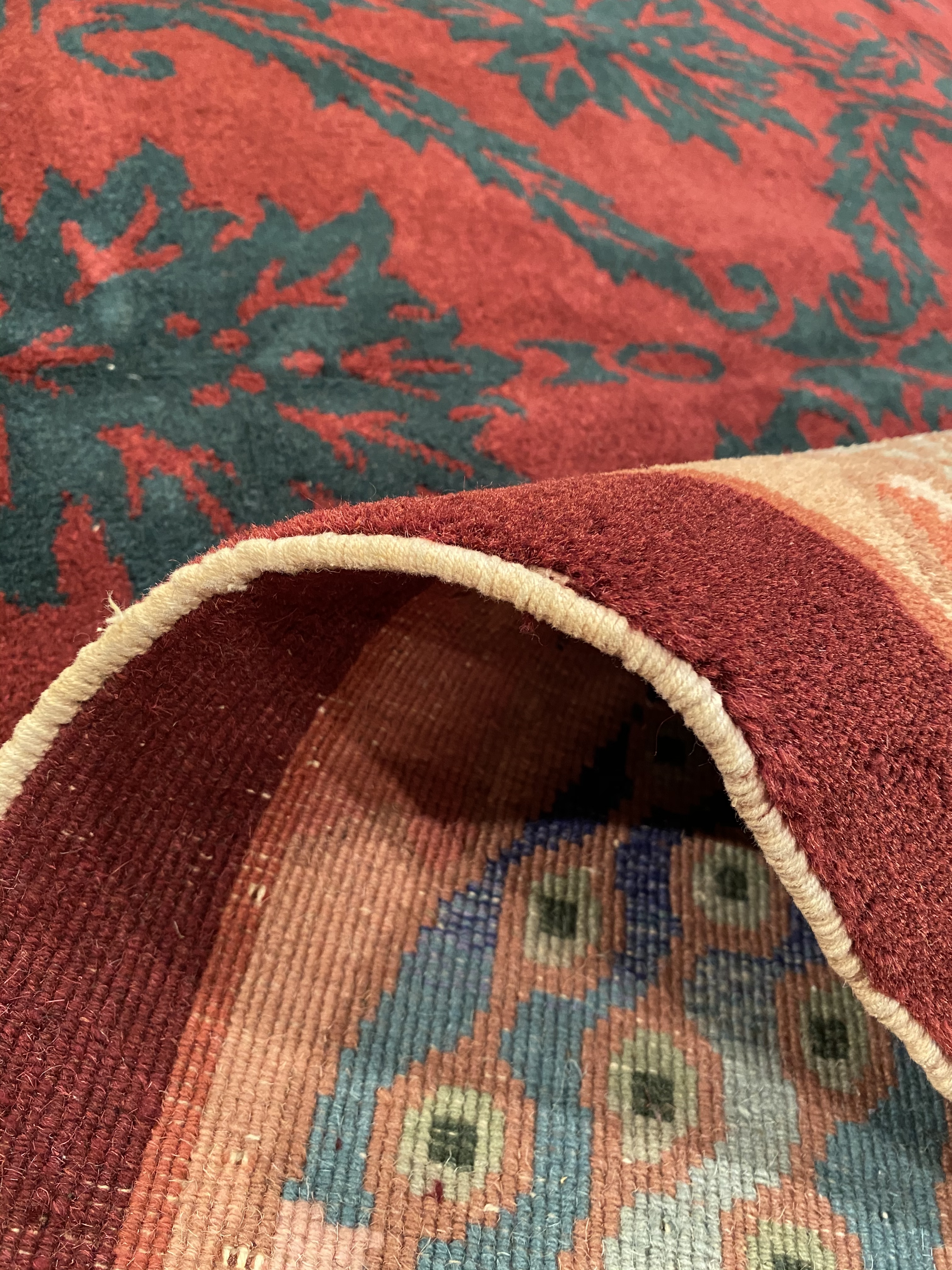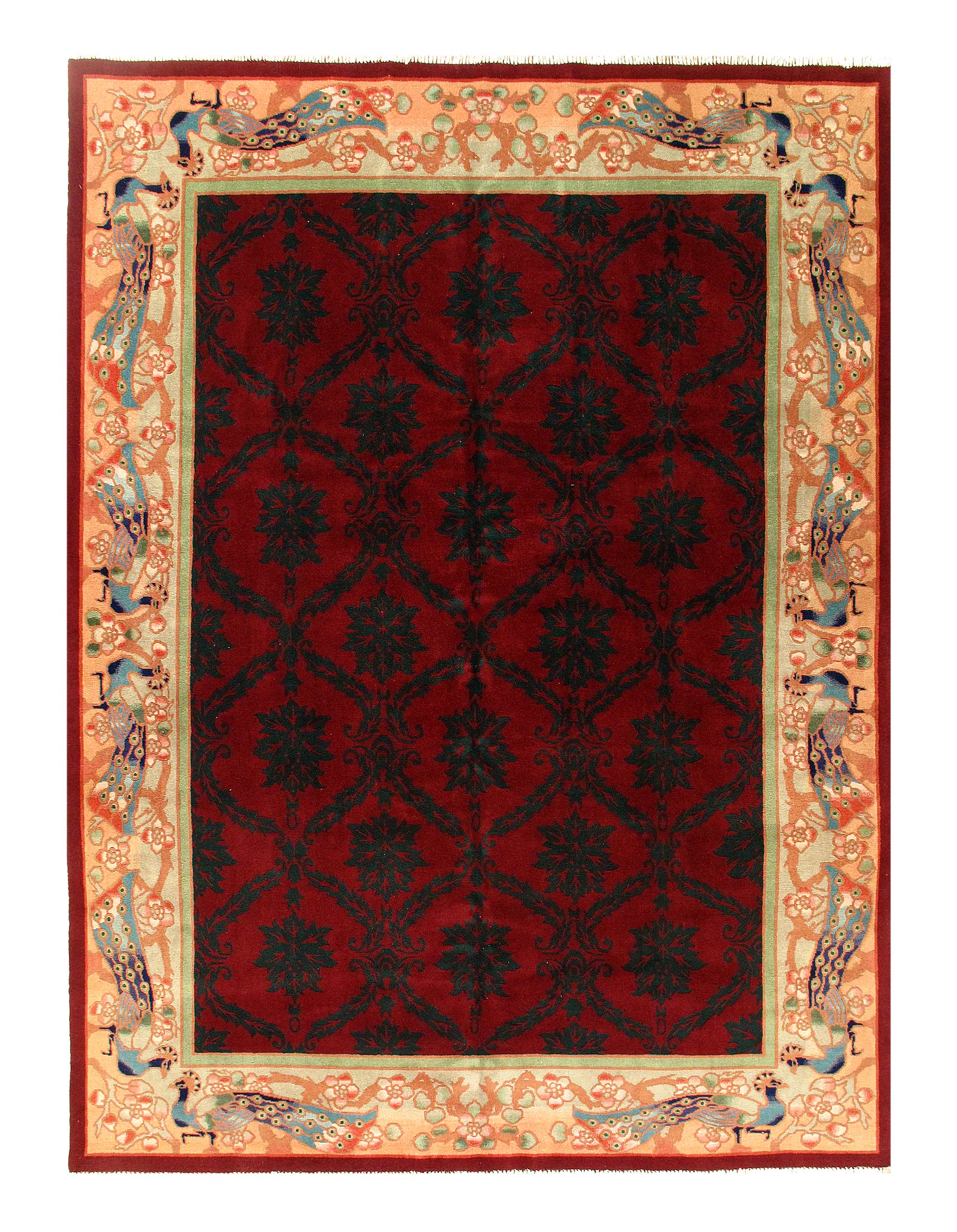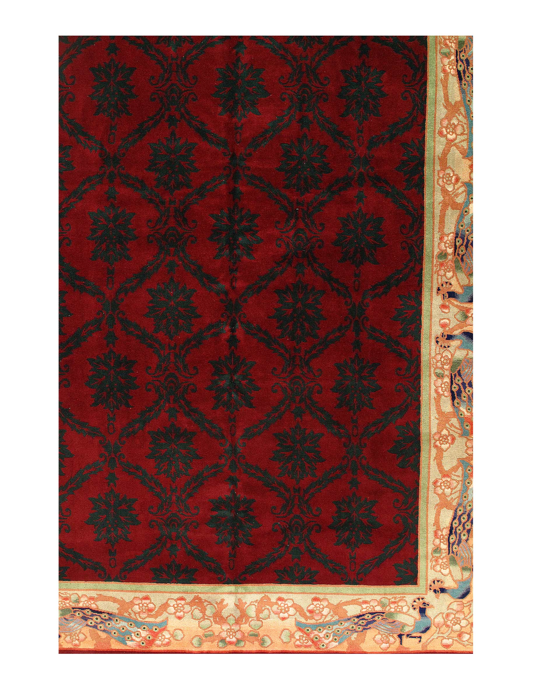 Chinese Deco Rug, Origin: China, Circa: Early 20th Century β Here is an exciting and appealing antique Oriental carpet β an antique Art Deco rug that was designed and woven in China during the early years of the twentieth century. Heavily informed by the aesthetic inclinations of the Art Deco period, this unique carpet is a compelling and thought-provoking example. A scalloped border of Beige encloses a Red sand field on this exquisitely subtle and restrained antique Chinese Art Deco. At first the field appears empty or open, but it is actually covered by a tone-on-tone design of scrolls and cloud-bands emanating inward from the outer edges. In their sinuous rhythms they echo the scalloped forms of the border and continue its visual effects across the carpet in a more subdued manner. This carpet testifies to the masterful design sensibilities of Chinese weavers as they made the transition into the modern world. The Art Deco movement had an outside influence on the world of art and design, and some of the most important qualities and characteristics of that movement may be found in this fine rug.