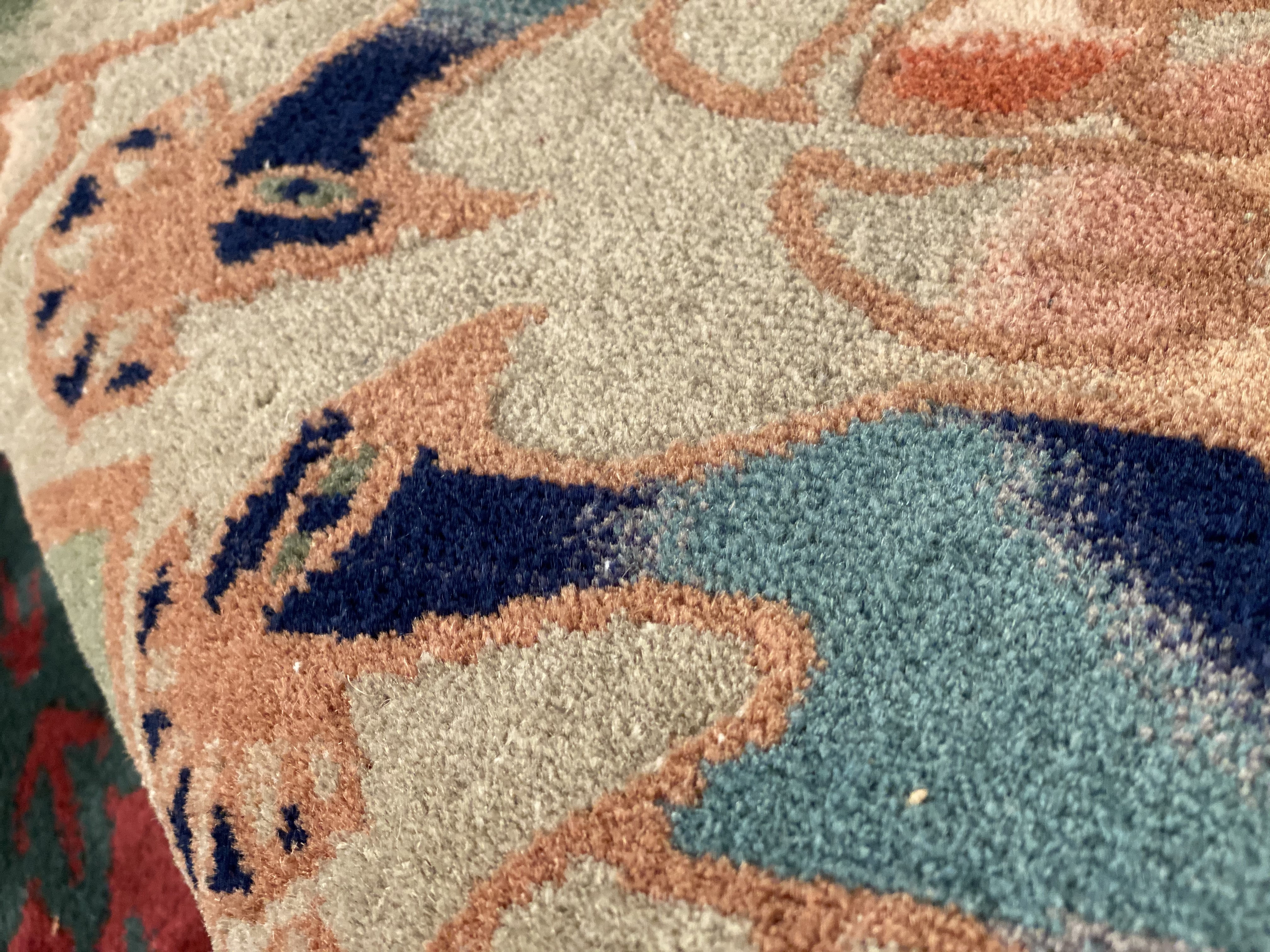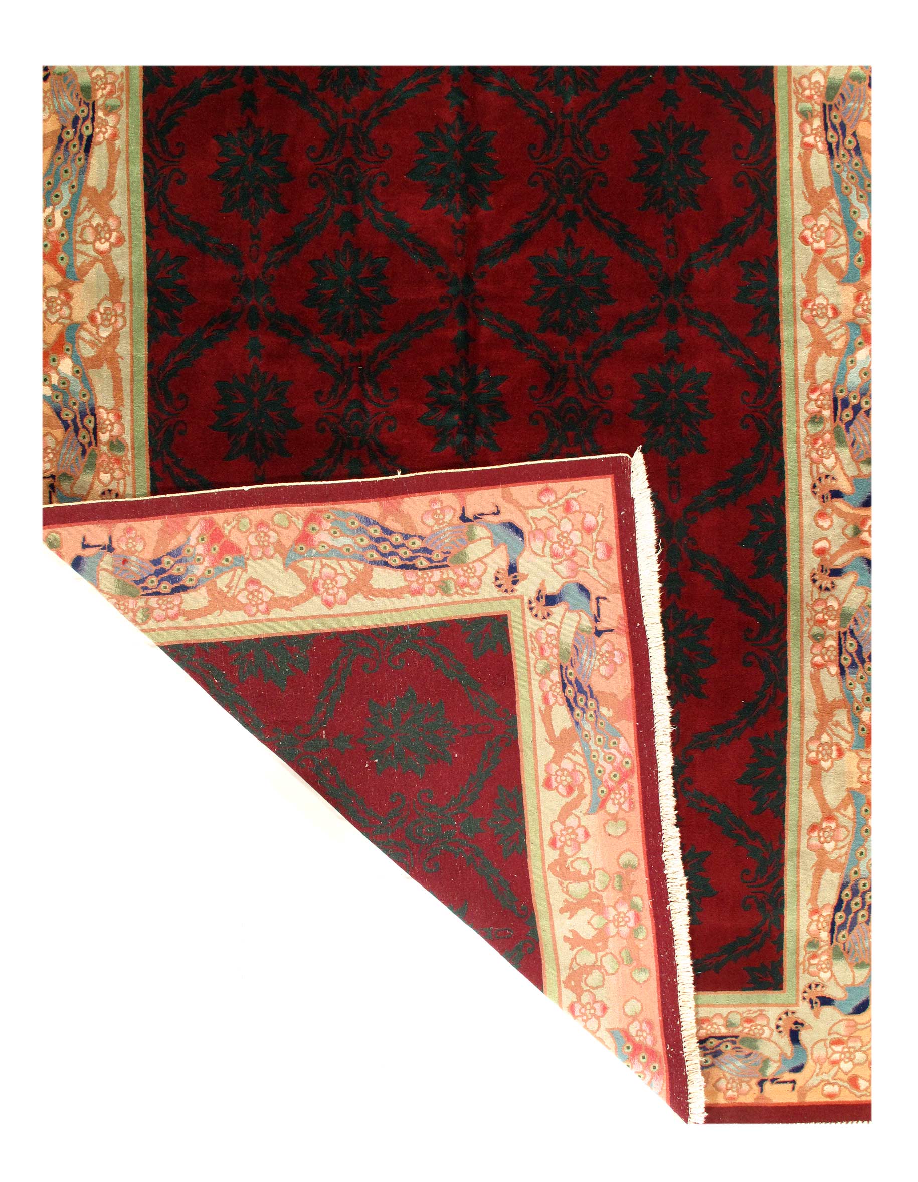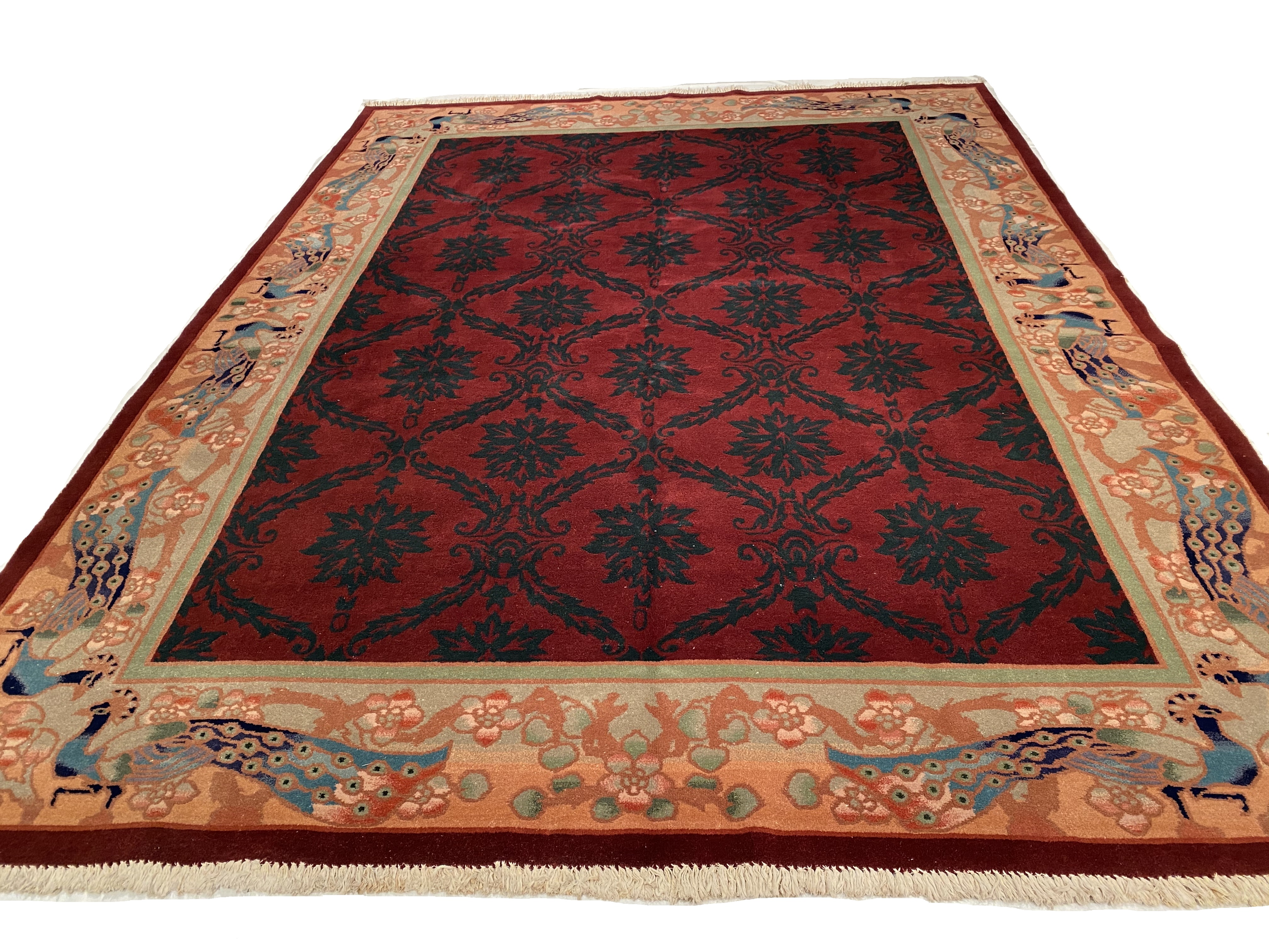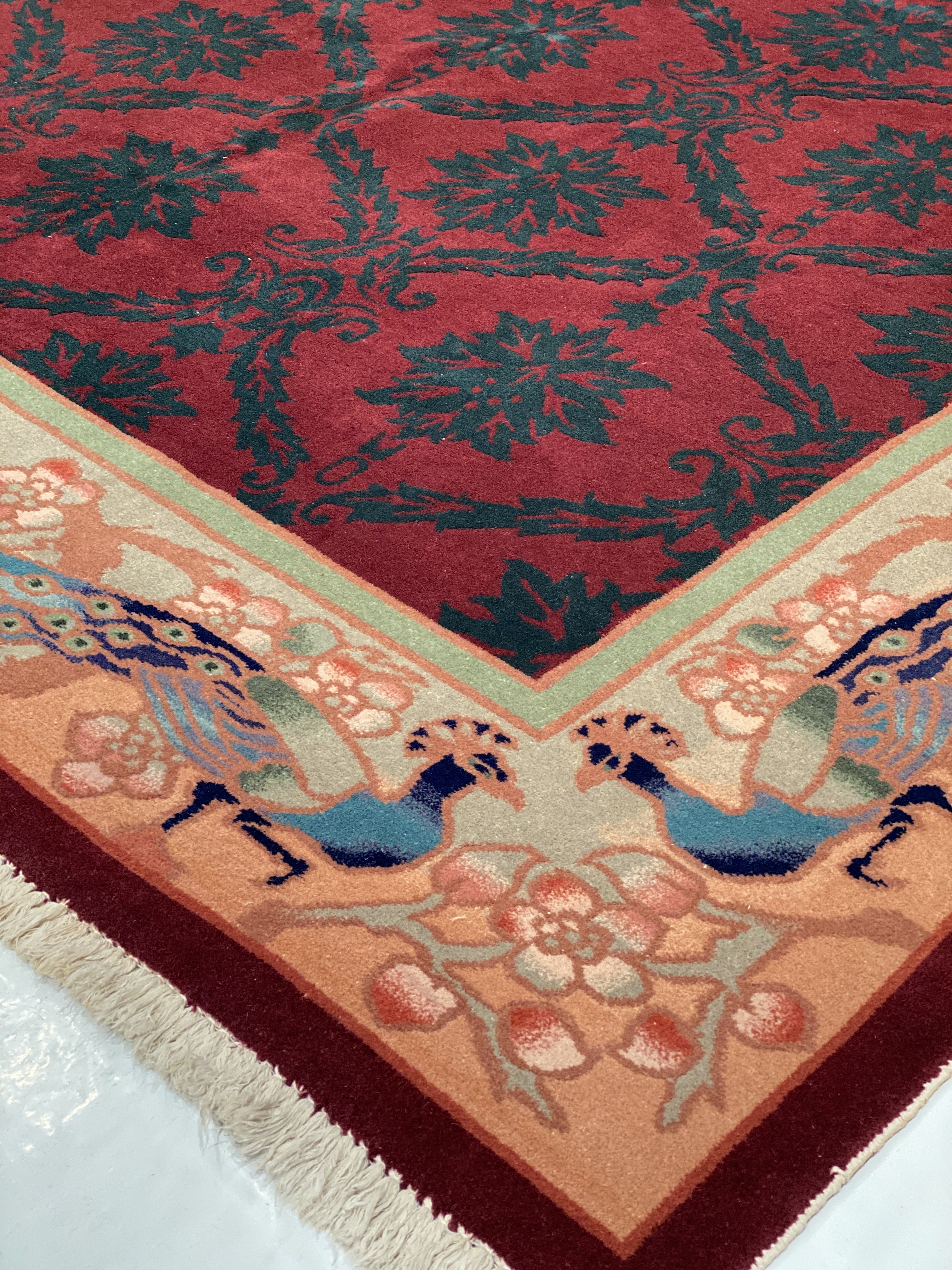 Chinese Deco Rug, Origin: China, Circa: Early 20th Century β Here is an exciting and appealing antique Oriental carpet β an antique Art Deco rug that was designed and woven in China during the early years of the twentieth century. Heavily informed by the aesthetic inclinations of the Art Deco period, this unique carpet is a compelling and thought-provoking example. A scalloped border of Beige encloses a Red sand field on this exquisitely subtle and restrained antique Chinese Art Deco. At first the field appears empty or open, but it is actually covered by a tone-on-tone design of scrolls and cloud-bands emanating inward from the outer edges. In their sinuous rhythms they echo the scalloped forms of the border and continue its visual effects across the carpet in a more subdued manner. This carpet testifies to the masterful design sensibilities of Chinese weavers as they made the transition into the modern world. The Art Deco movement had an outside influence on the world of art and design, and some of the most important qualities and characteristics of that movement may be found in this fine rug.
