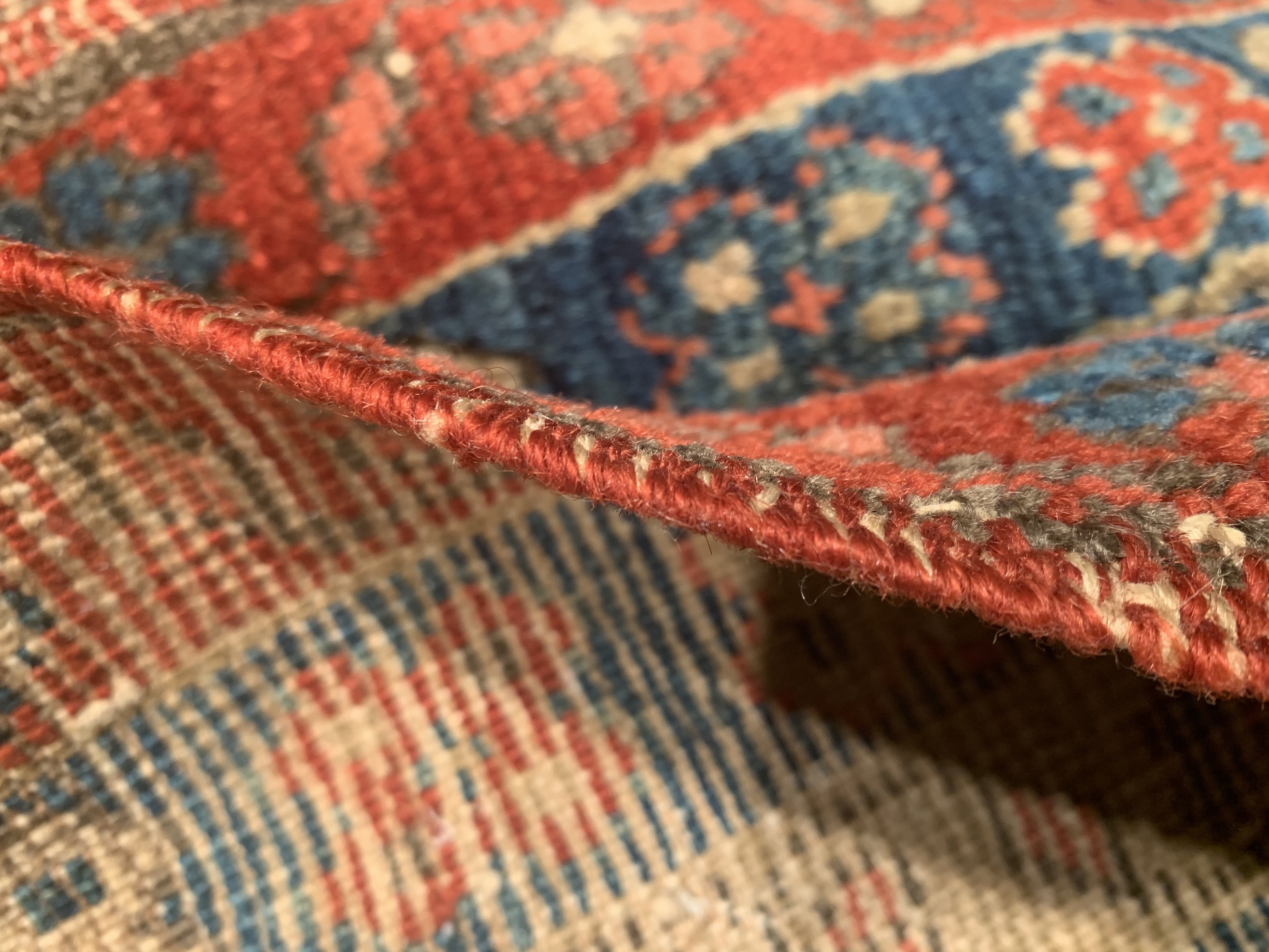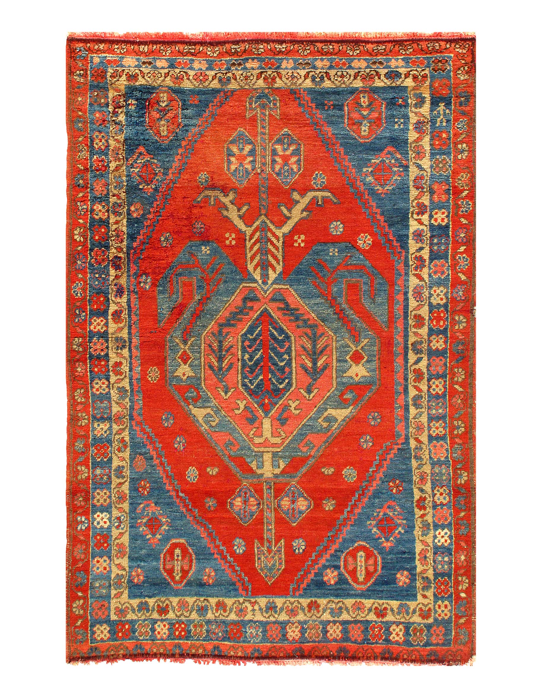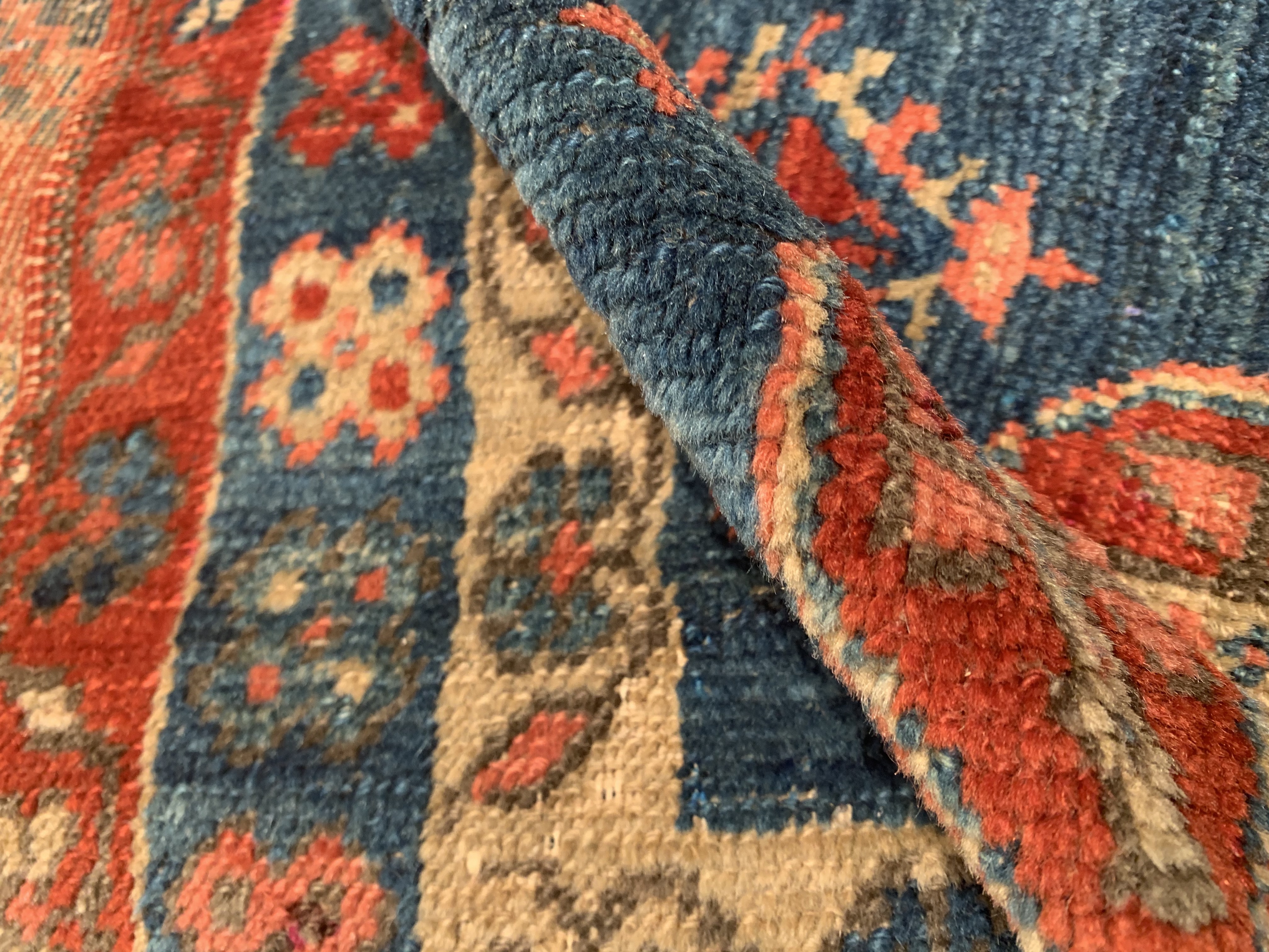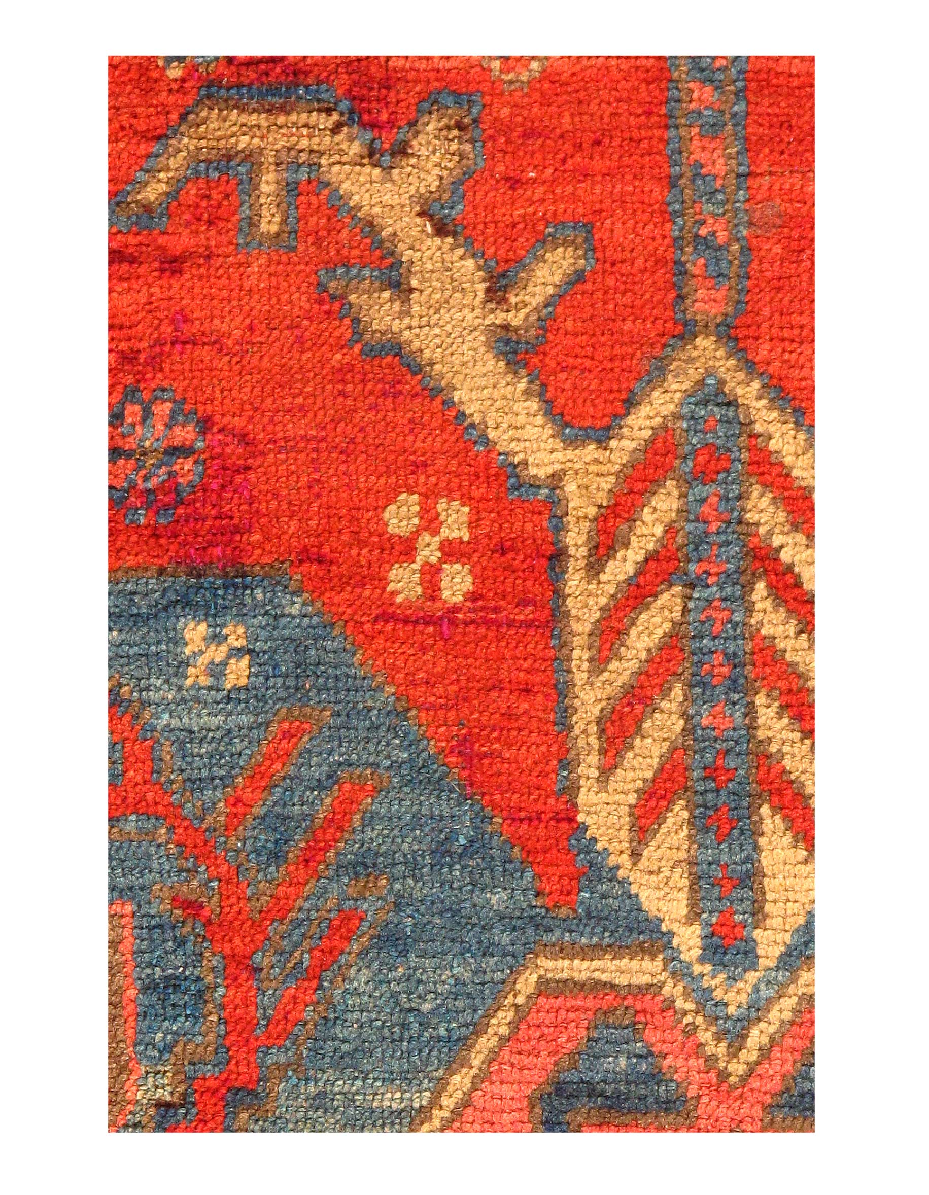 Kazak rug features a double large, bold, dominating geometric pattern with a smaller patterned within. The detailed borders and backdrop give it an edge that differentiates it from other rugs on the market. The colors used are vibrant via the rug’s denser dyes with several different vegetable dyed colors to create its elaborate effect. The heavy amount of color draws the observer’s eyes toward the Kazak’s emblazoned geometric patterns. Hand knotted wool on wool.