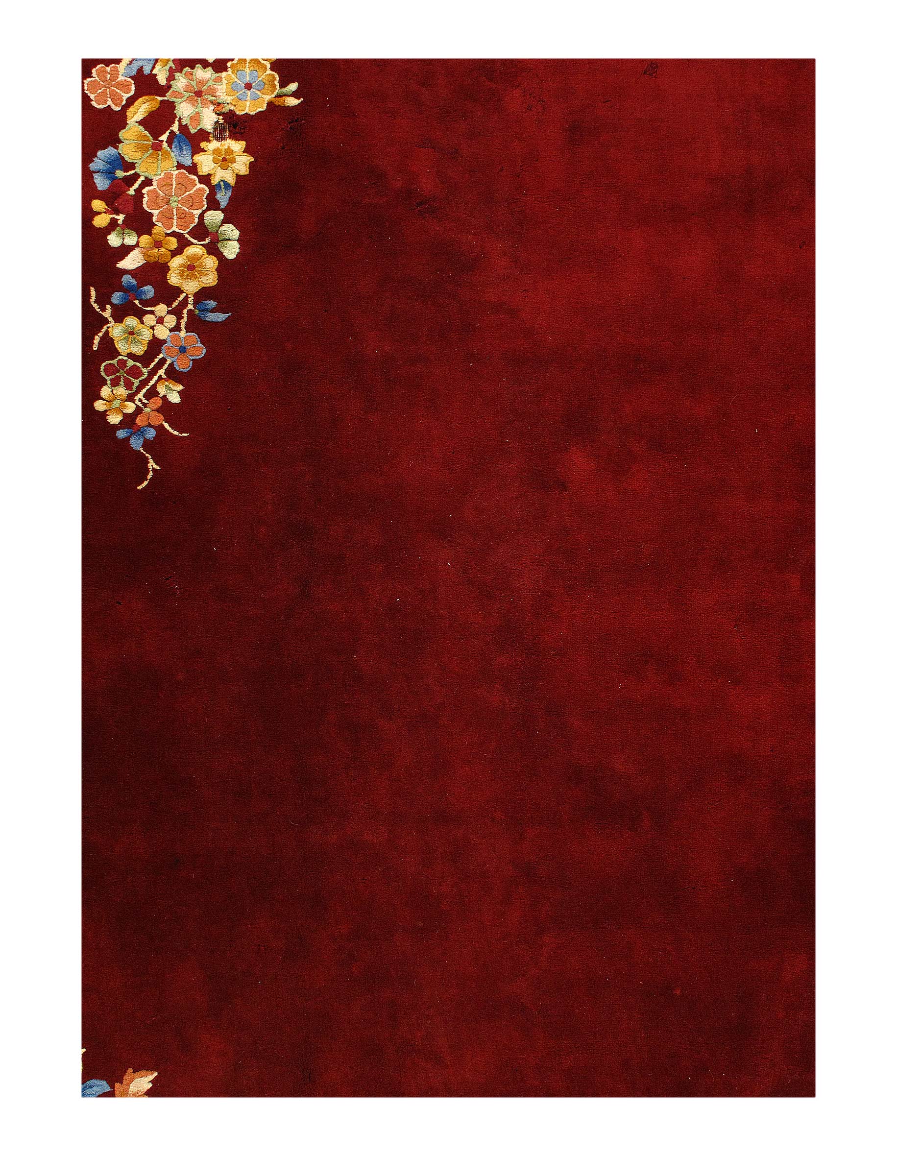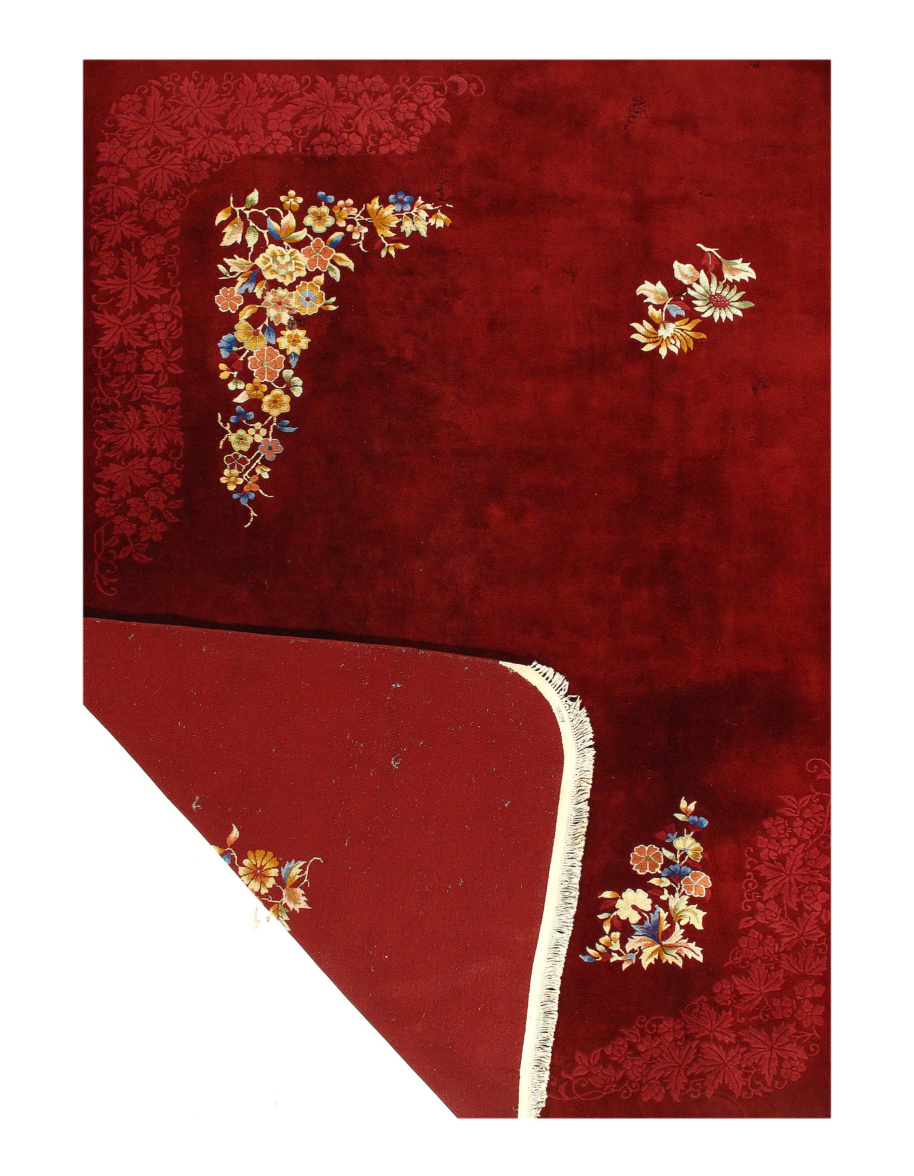 Beautiful antique Chinese Art Deco hand knotted wool rug with a red field. This Chinese rug has red color accents in a gorgeous all-over Classic Chinese floral design.