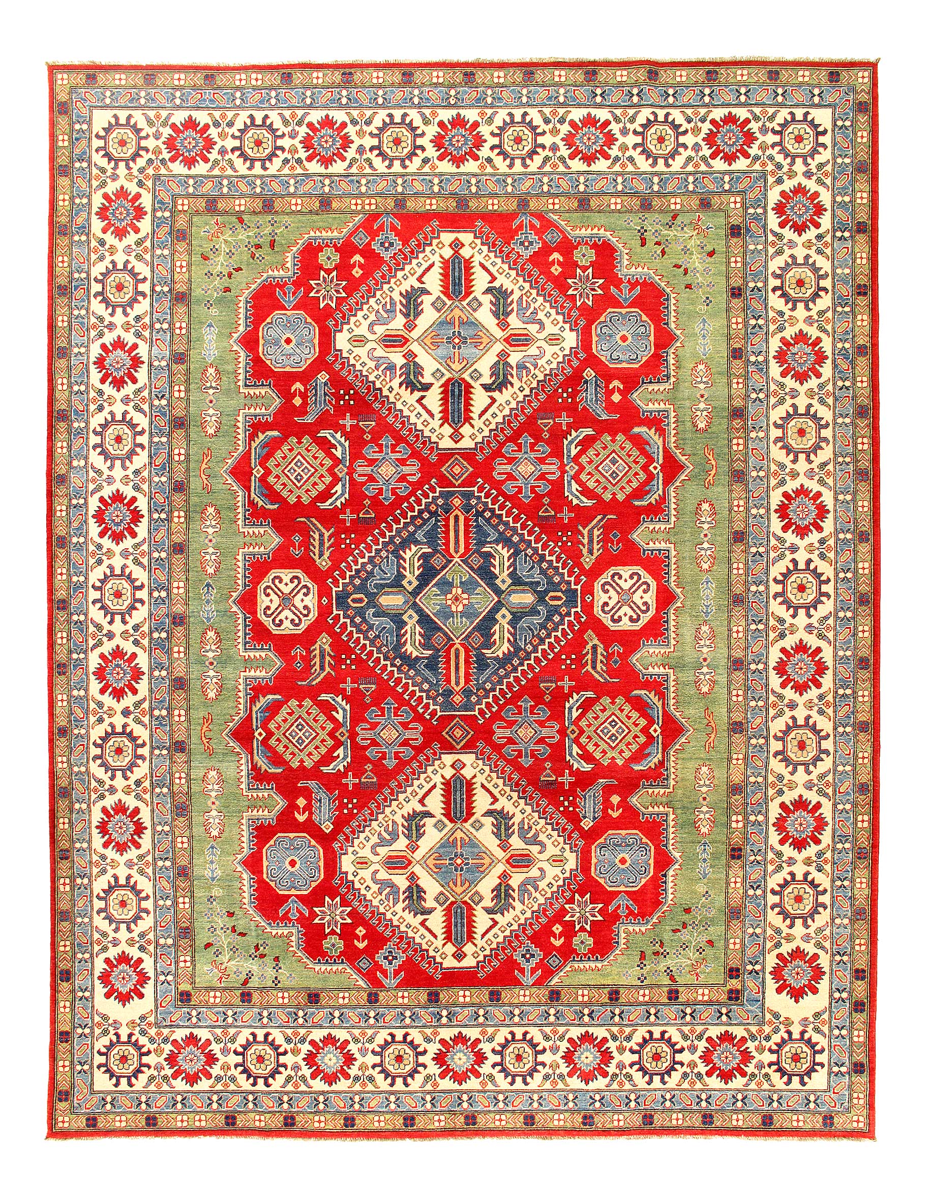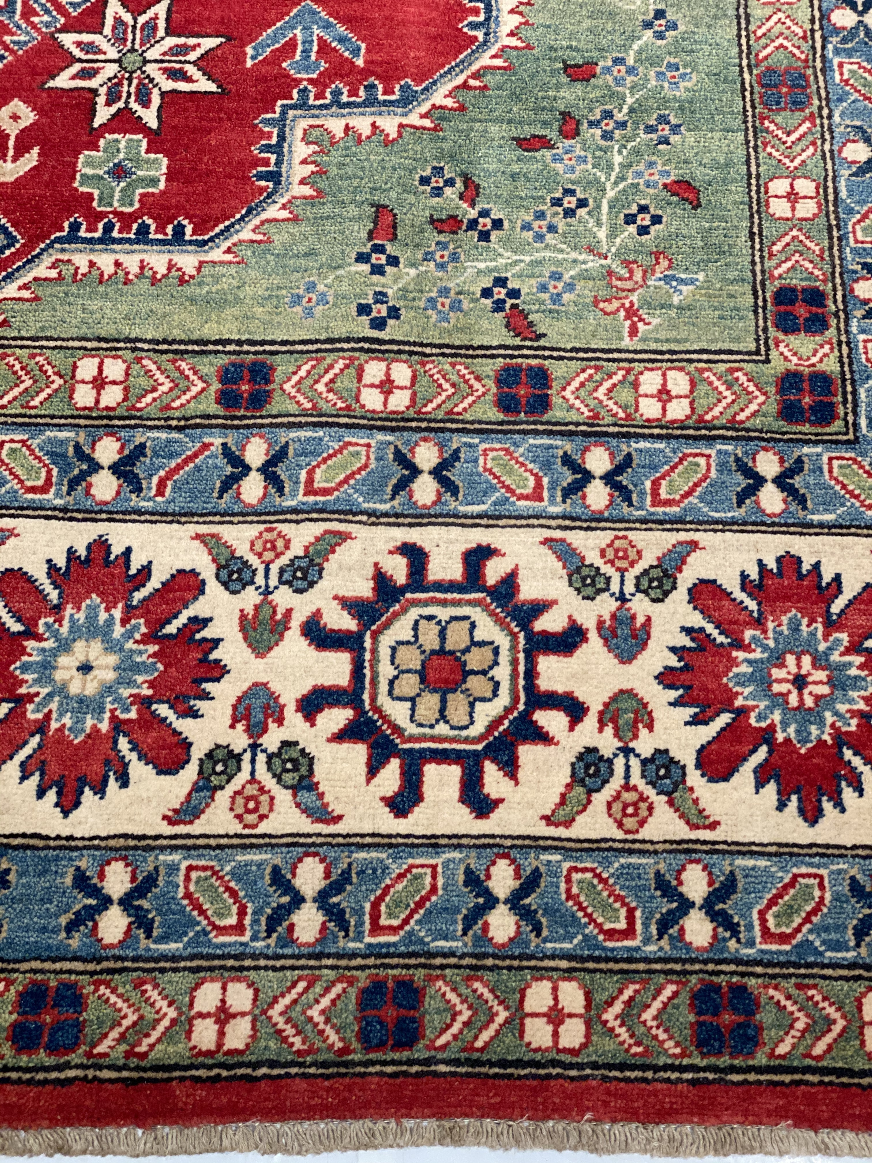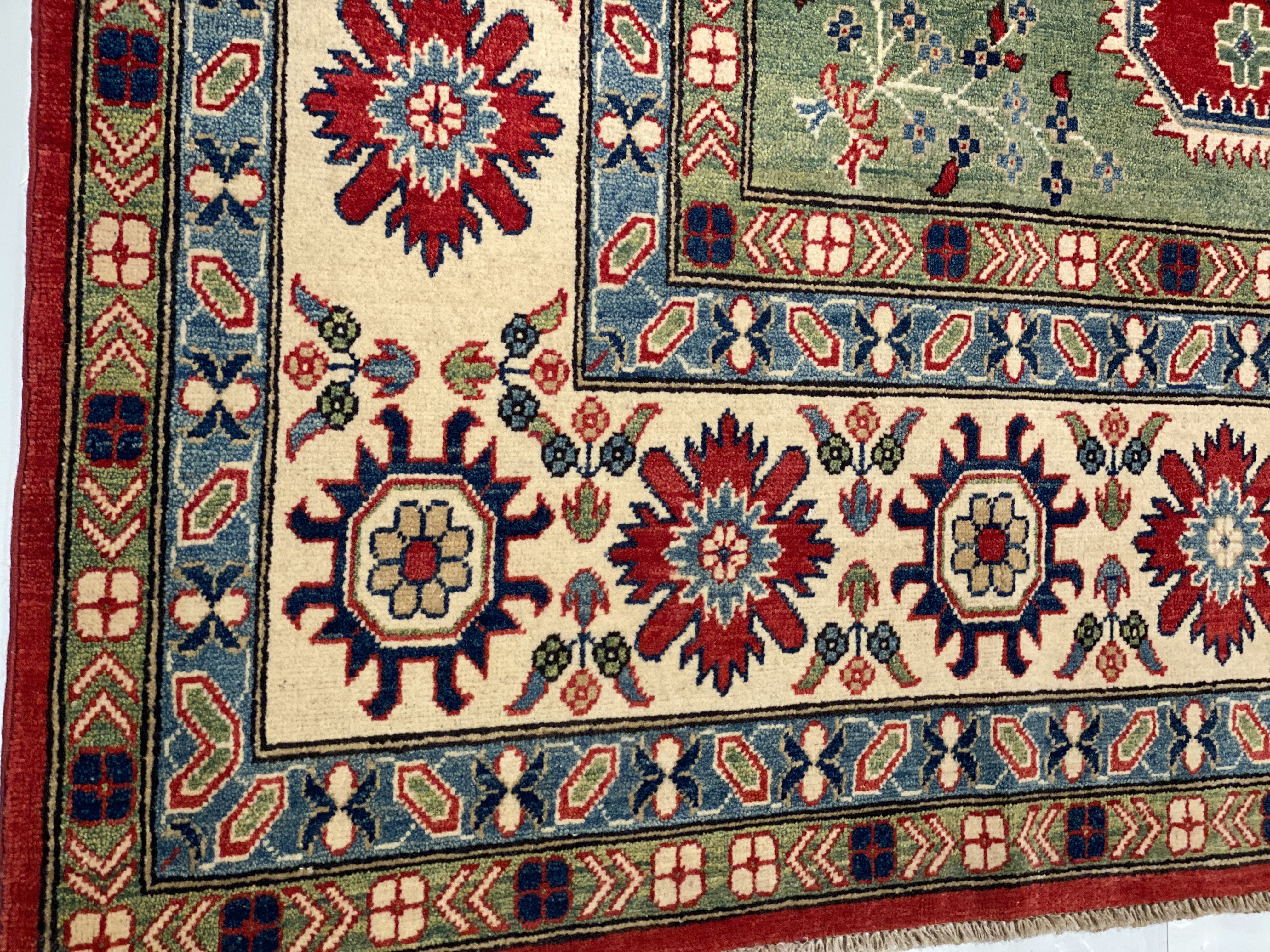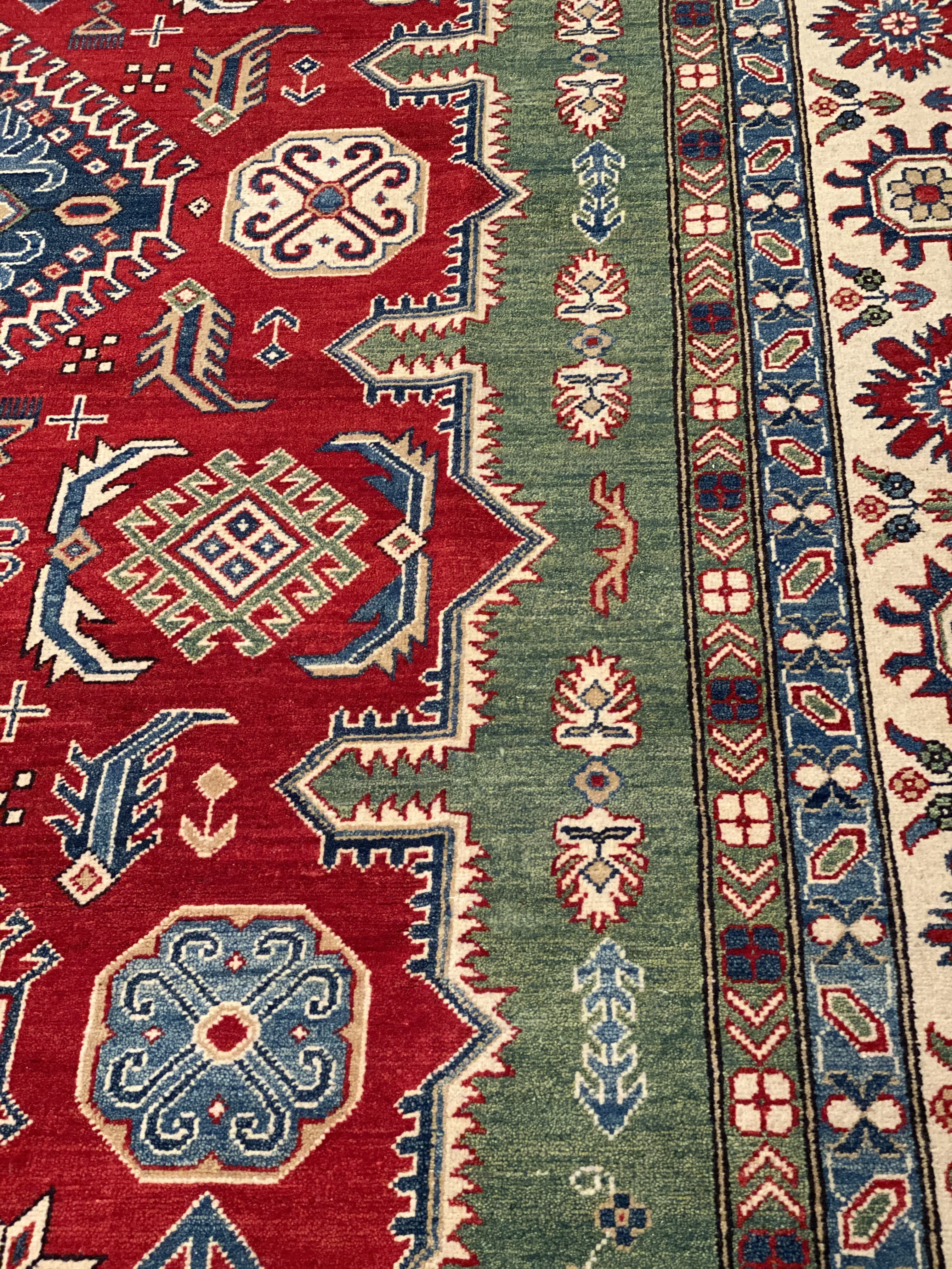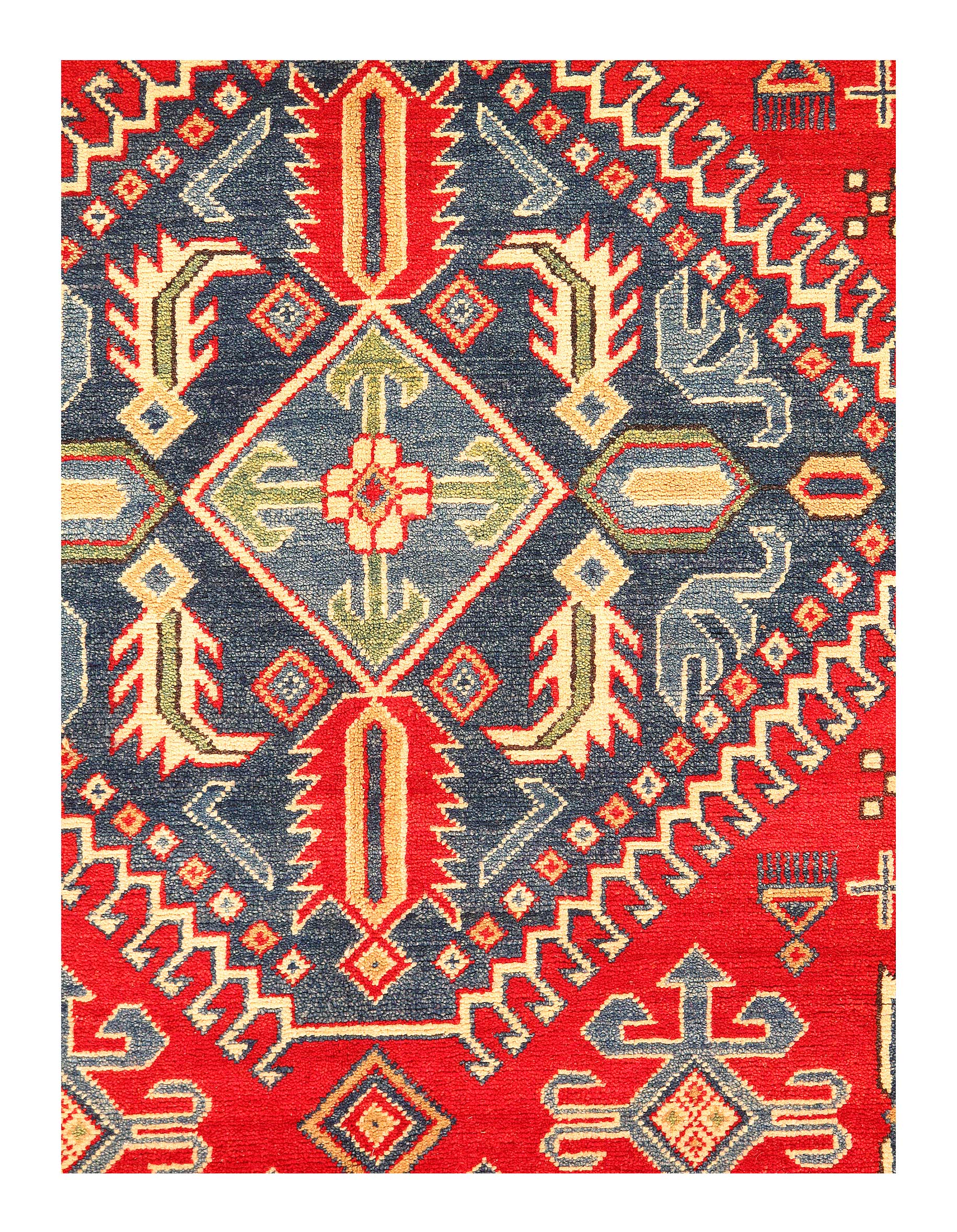Kazak is a modern shape of old Caucasian rugs which strictly adheres to traditional design elements of the Caucasus. It has elements such as the stepped hooked polygons, geometrical medallions and rosettes, presented in more stylized manner and with a new dimension. Natural dyes produce soft luminous shades and abrashes causing a beautiful sheen. Handspun wool yarn is normally used in the variety of vibrant warm colors. Kazaks rugs in our collection are all fine quality pieces from Pakistan made with Ghazni handspun wool and natural dyes.
