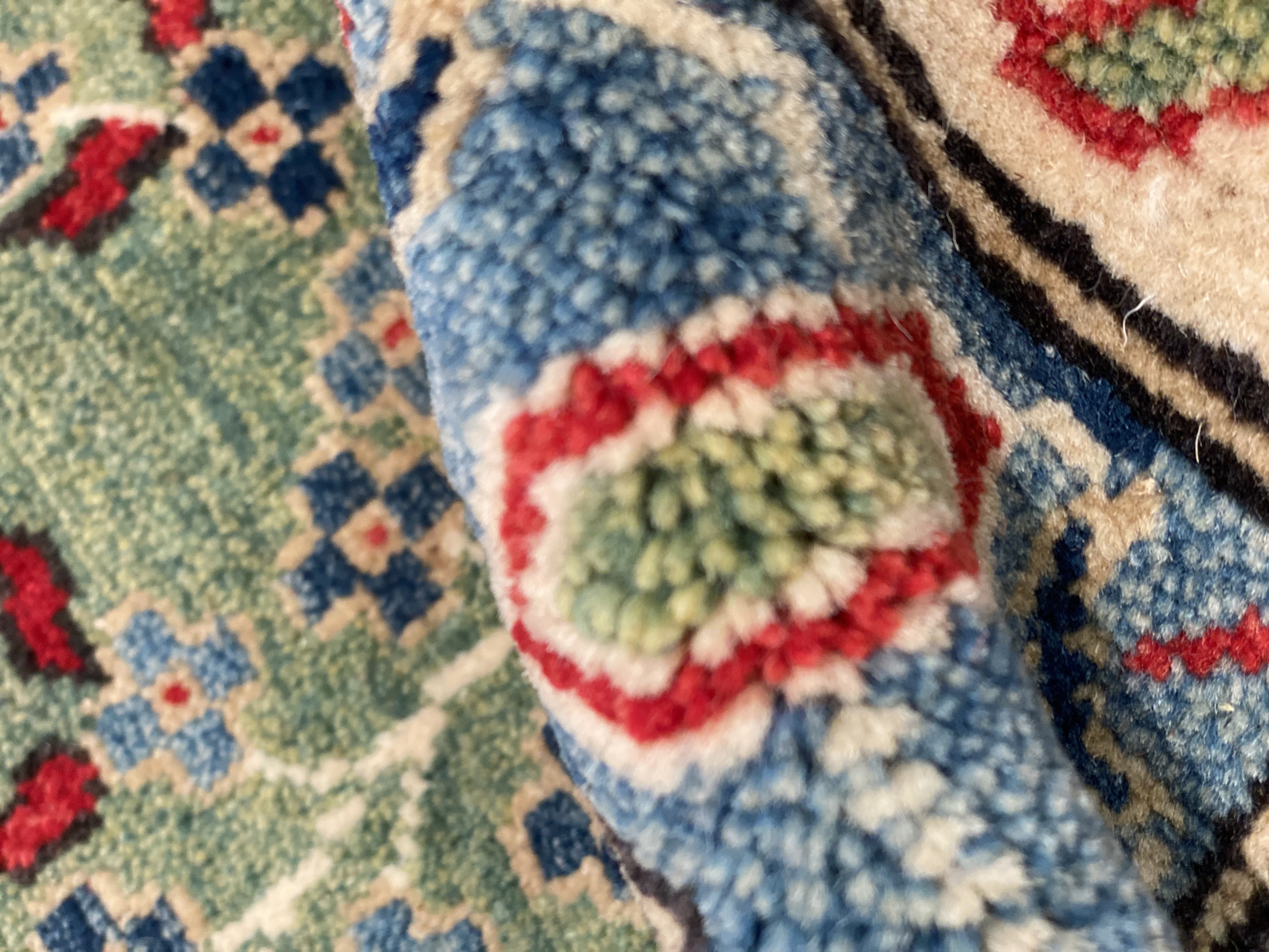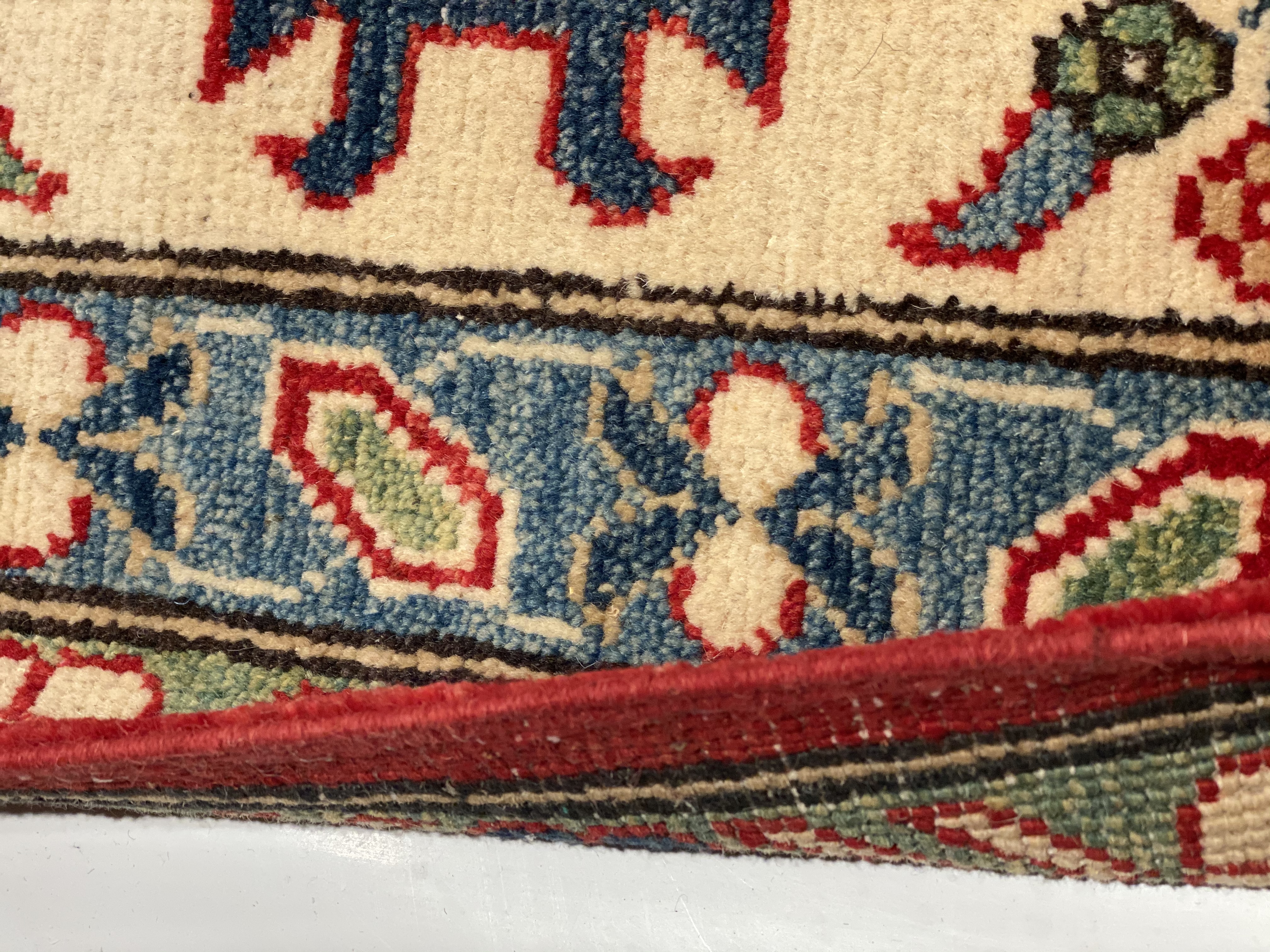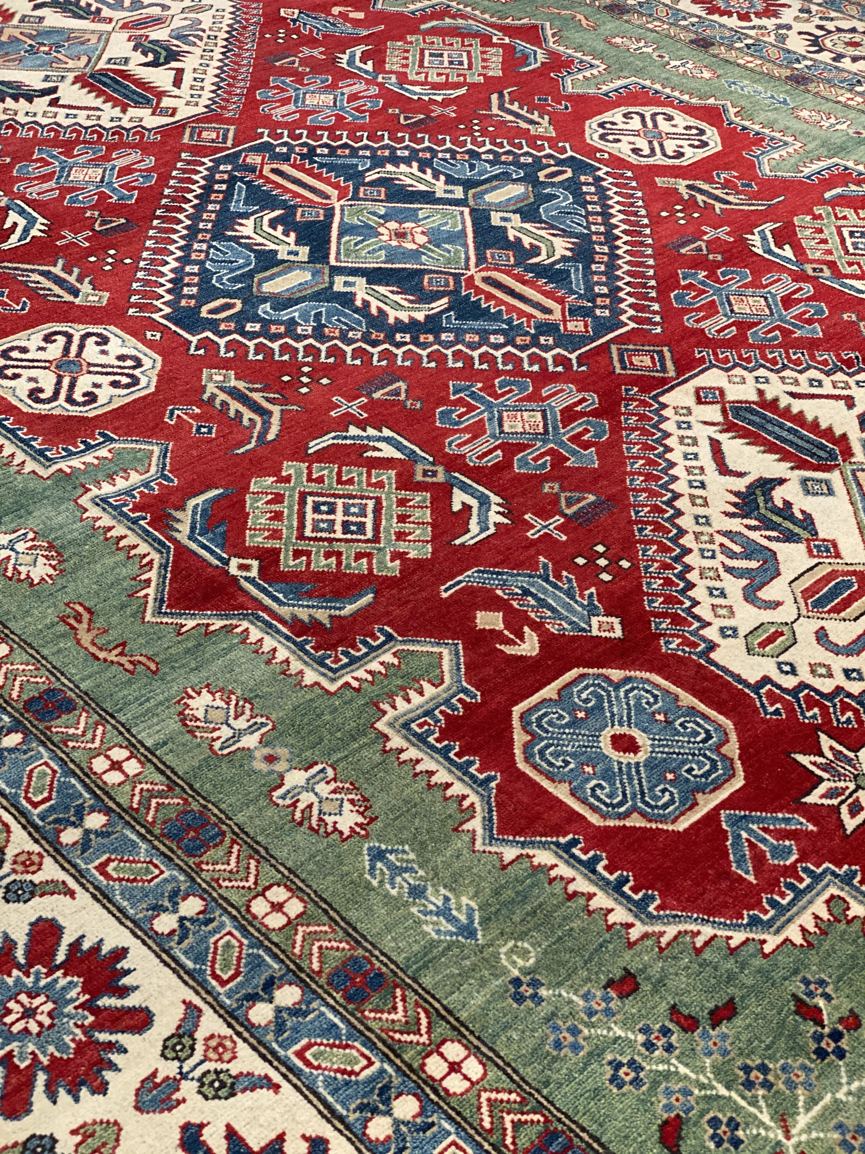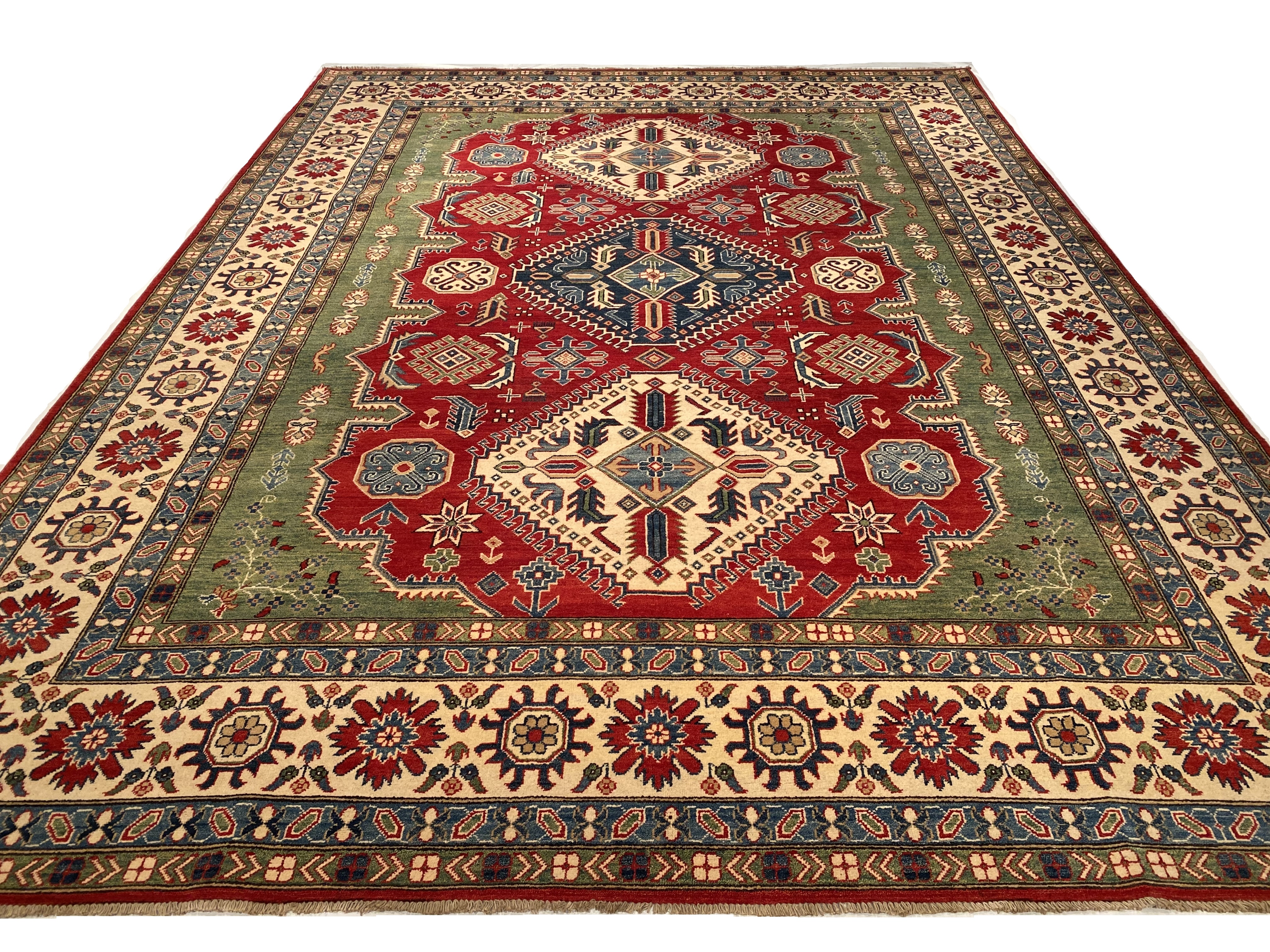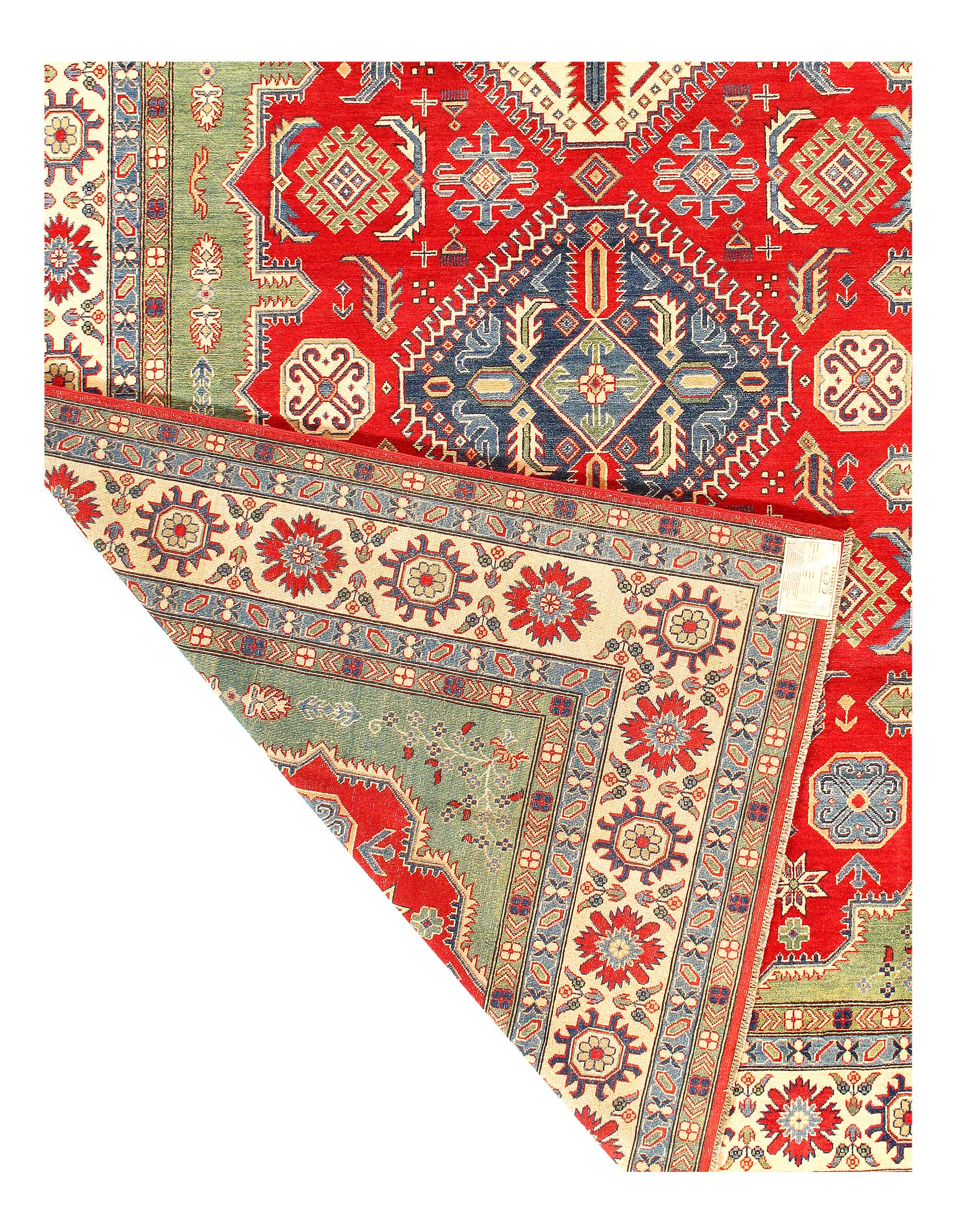 Kazak is a modern shape of old Caucasian rugs which strictly adheres to traditional design elements of the Caucasus. It has elements such as the stepped hooked polygons, geometrical medallions and rosettes, presented in more stylized manner and with a new dimension. Natural dyes produce soft luminous shades and abrashes causing a beautiful sheen. Handspun wool yarn is normally used in the variety of vibrant warm colors. Kazaks rugs in our collection are all fine quality pieces from Pakistan made with Ghazni handspun wool and natural dyes.
