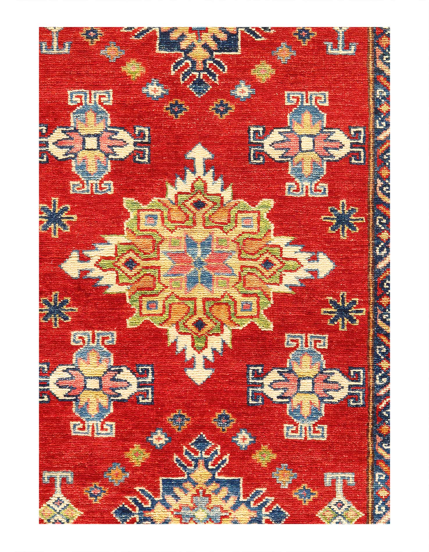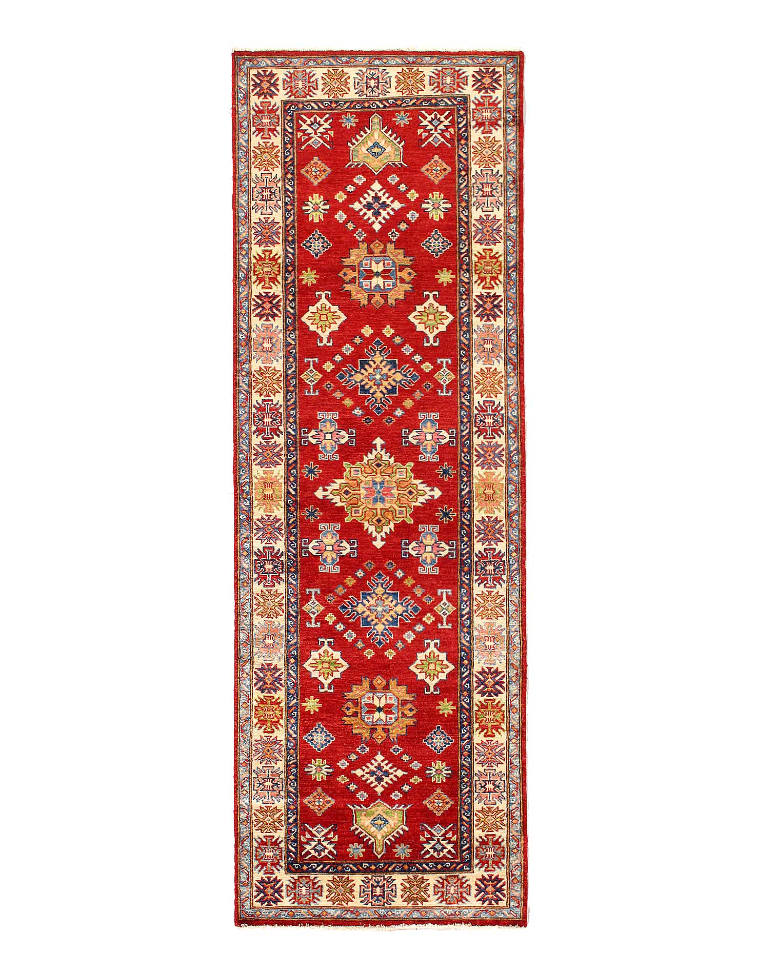 Kazak is a modern shape of old Caucasian rugs which strictly adheres to traditional design elements of the Caucasus. It has elements such as the stepped hooked polygons, geometrical medallions and rosettes, presented in more stylized manner and with a new dimension. Natural dyes produce soft luminous shades and abrashes causing a beautiful sheen. Hand spun wool yarn is normally used in the variety of vibrant warm colors. Kazaks rugs in our collection are all fine quality pieces from Pakistan made with Ghazni hand spun wool and natural dyes.