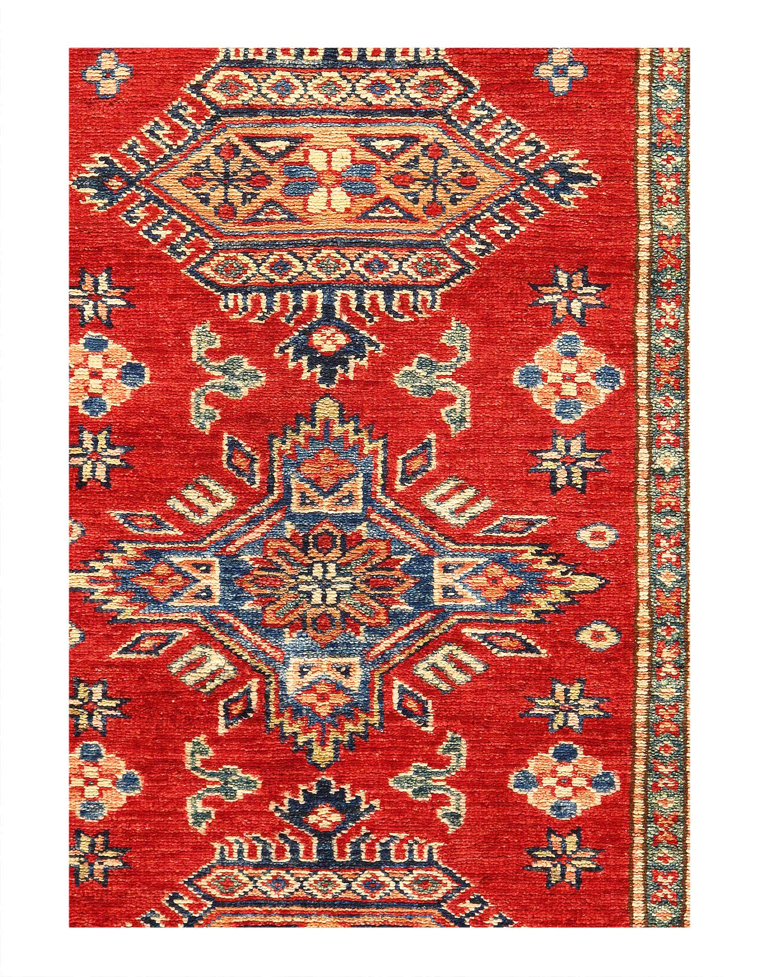 Original Super Kazak Rug.Handmade Hand-knotted,Very Practical for High Traffic,Hand-Spun Lamb's Wool on a Cotton Foundation,Vegetable Dyed,This rug is handmade from 100-percent premium, hand-spun wool, and employ ancient pot-dying techniques to give them their authentic look.This rug is handmade from 100-percent premium, hand-spun wool, and employ ancient pot-dying techniques to give them their authentic look.Kazak is a modern shape of old Caucasian rugs which strictly adheres to traditional design elements of the Caucasus. It has elements such as the stepped hooked polygons, geometrical medallions and rosettes, presented in more stylized manner and with a new dimension. Natural dyes produce soft luminous shades and abrashes causing a beautiful sheen. Hand spun wool yarn is normally used in the variety of vibrant warm colors. Kazaks rugs in our collection are all fine quality pieces from Pakistan made with Ghazni handspun wool and natural dyes.