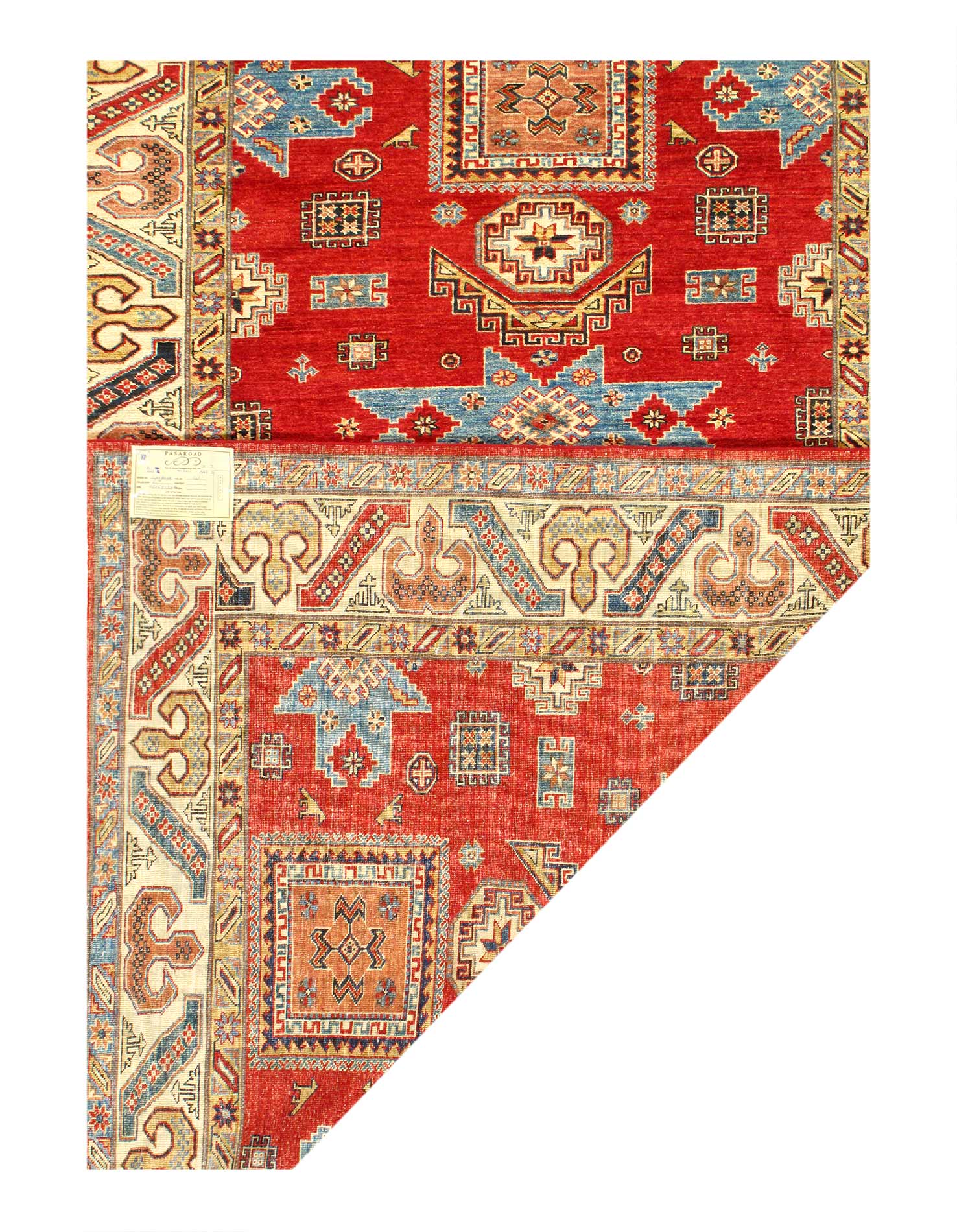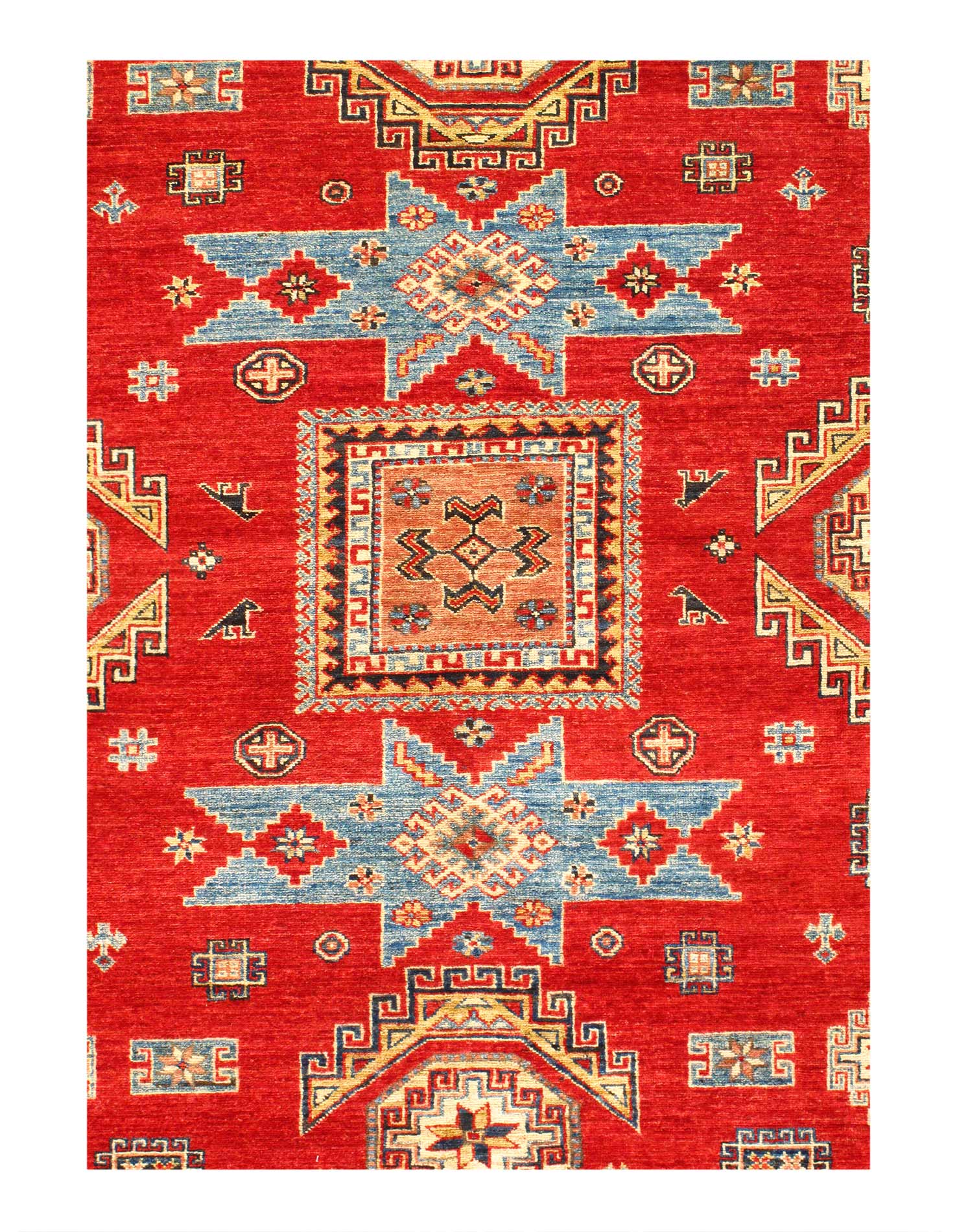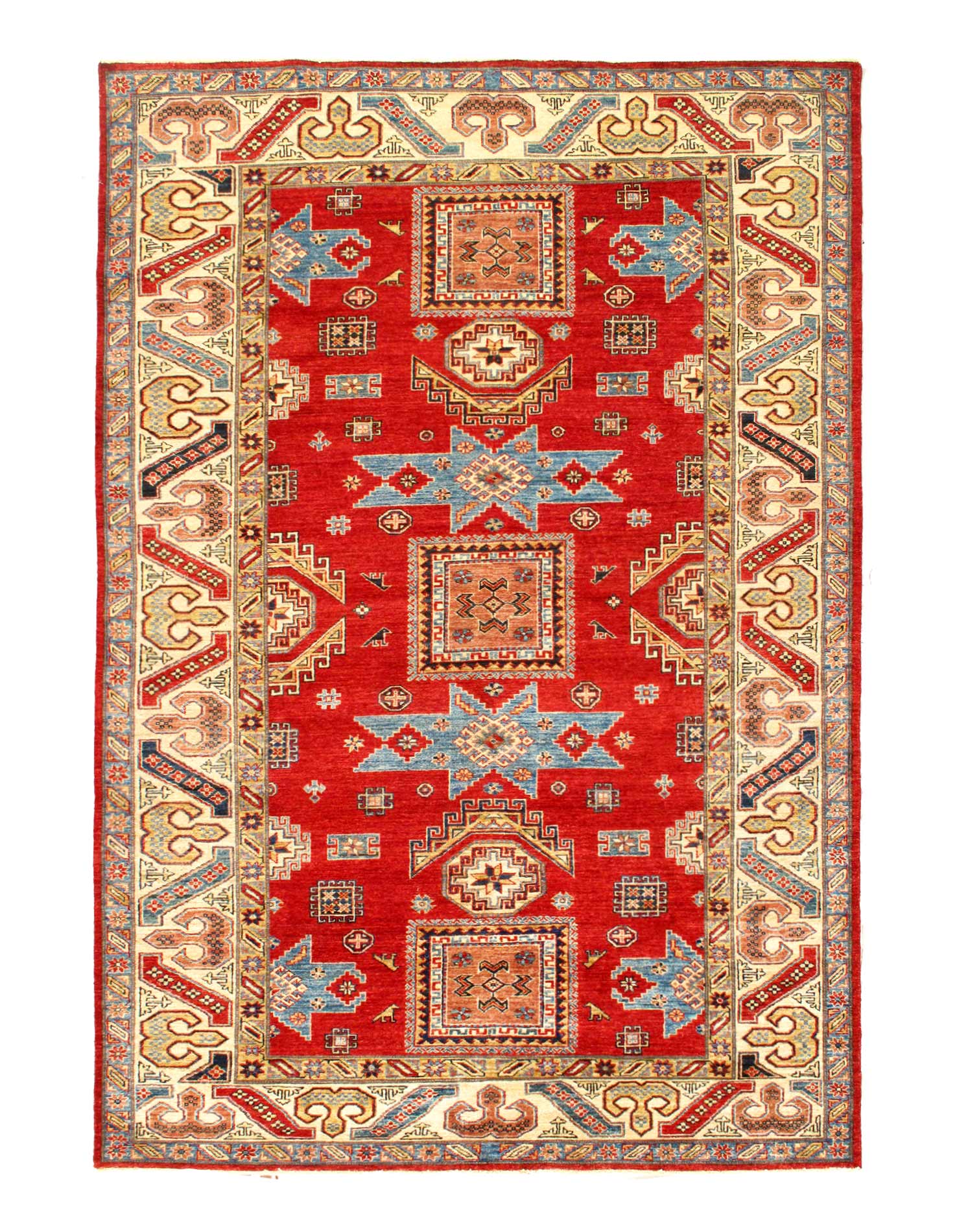 Kazak is a modern shape of old Caucasian rugs which strictly adheres to traditional design elements of the Caucasus. It has elements such as the stepped hooked polygons, geometrical medallions and rosettes, presented in more stylized manner and with a new dimension. Natural dyes produce soft luminous shades and abrashes causing a beautiful sheen. Handspun wool yarn is normally used in the variety of vibrant warm colors. Kazaks rugs in our collection are all fine quality pieces from Pakistan made with Ghazni handspun wool and natural dyes.