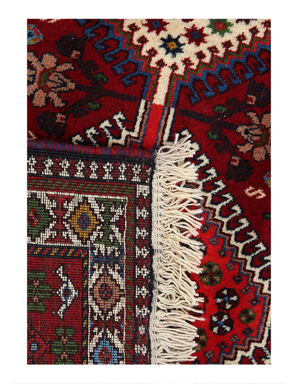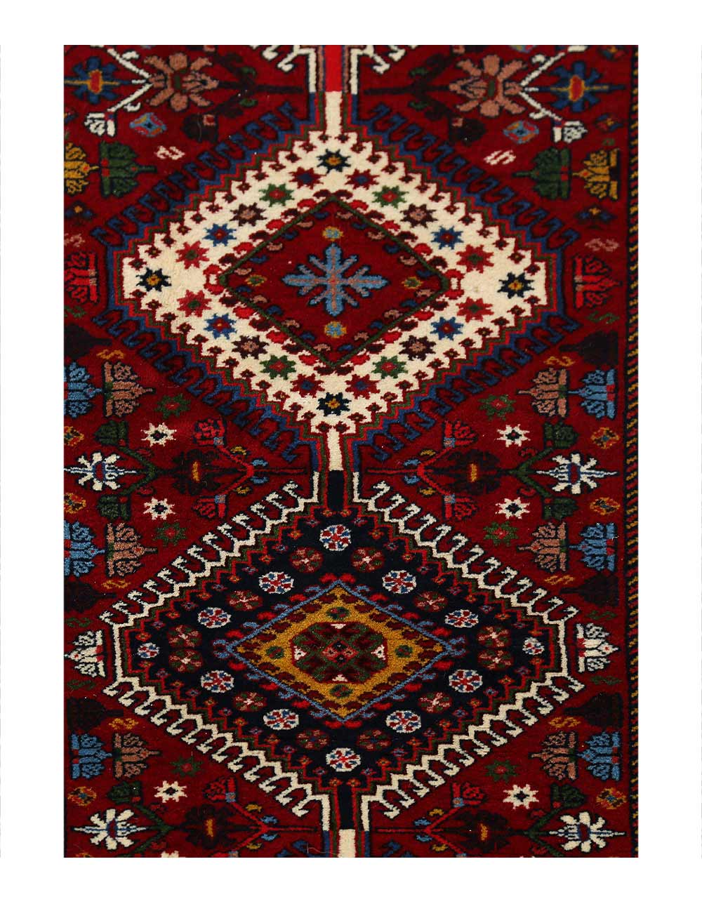 The pile used in Yalameh rugs is very fine, particularly in comparison to other tribal designs, using soft wool based on a Wool foundation. The pattern is distinctive with large repeated diamonds in a straight line down the carpet, often with geometrical animal or human prints scattered across the field. Dark red or light brown on a blue or orange background is most common for Yalameh, similar to Shiraz rugs, the rugs compliment modern or minimalist furniture beautifully, giving the living space an aura of luxurious style and warm.