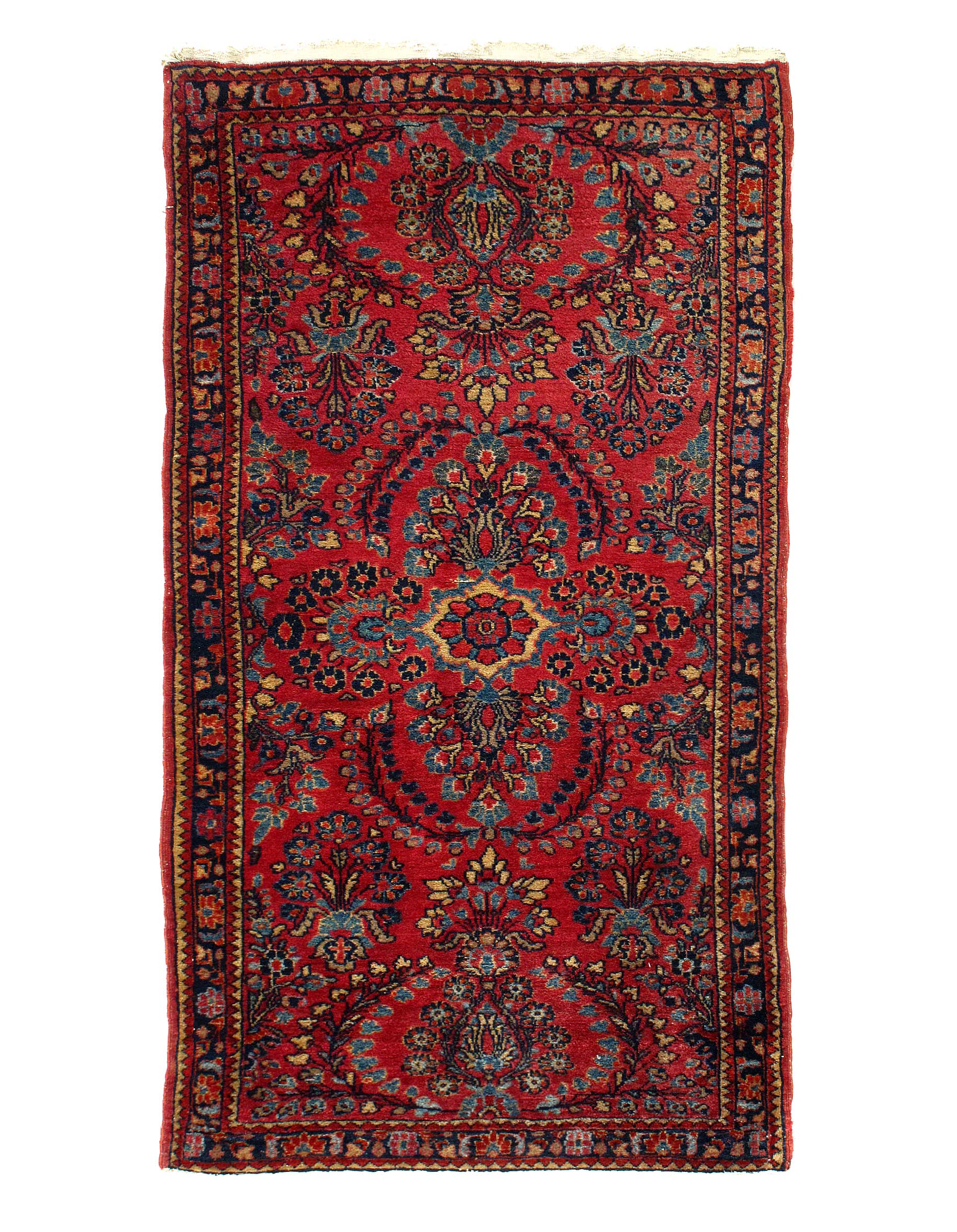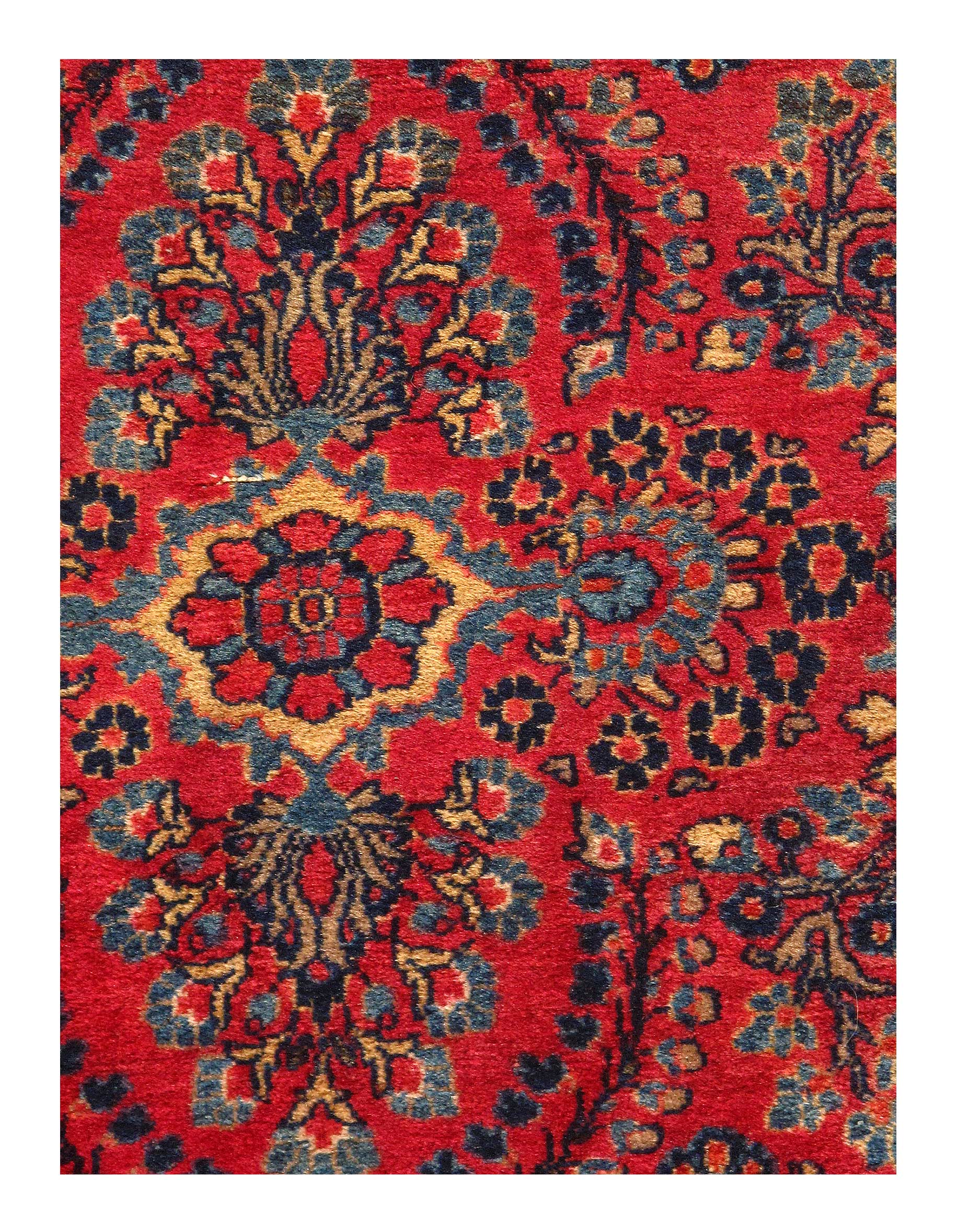 This is an antique handmade rug from the early 20th century. The piece was crafted from lamb's wool on a cotton foundation and was vegetable dyed. It has a dense, soft pile, and excellent quality, to ensure that you will enjoy it for years to come.