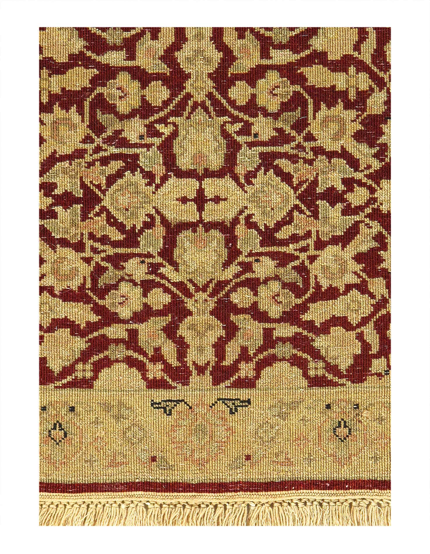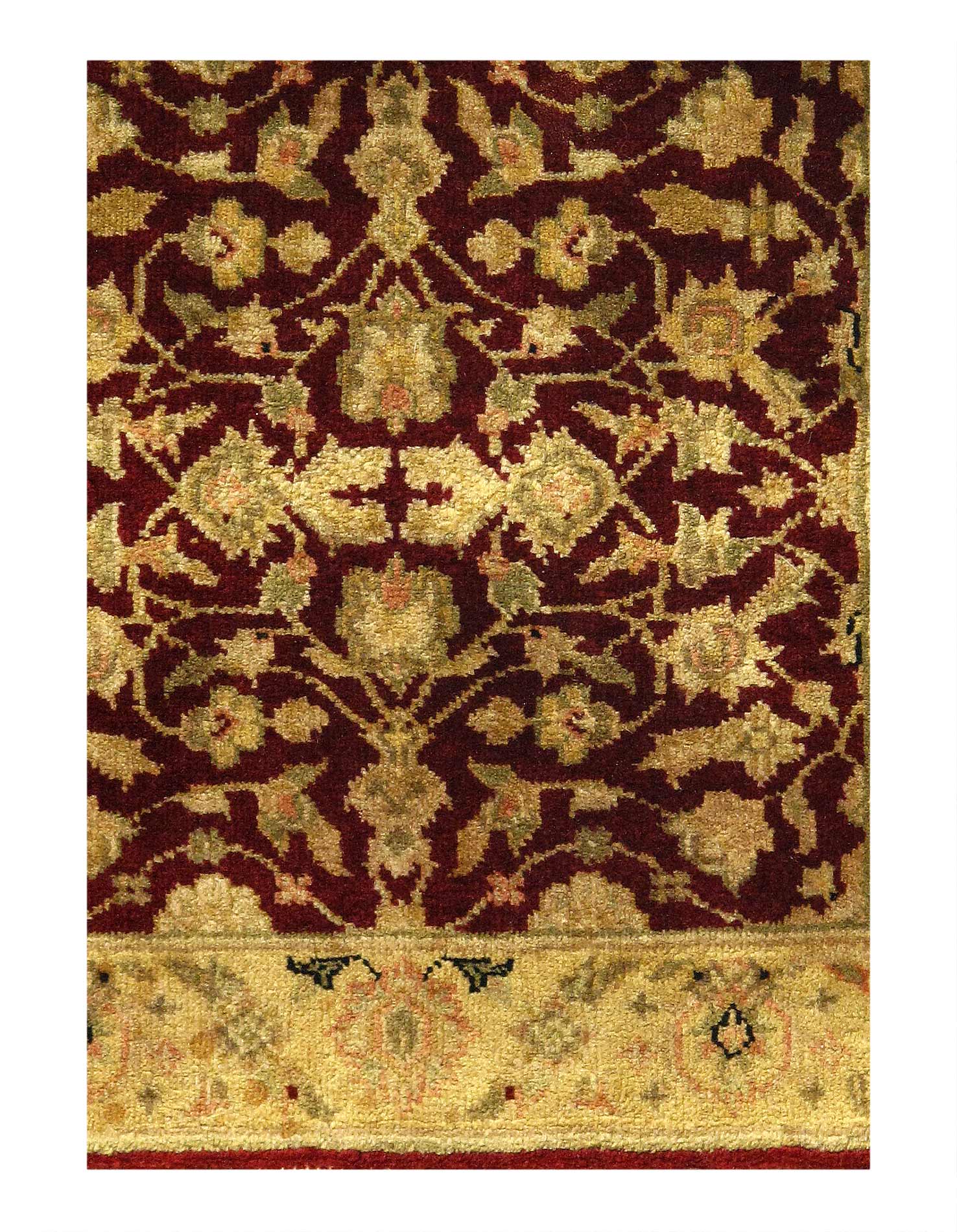 Augra rugs are distinguished by their excellent weave, they have the most diverse display of designs which often reflect scenes of falconry, and ferocious lions. Some of the most well know Augra rugs were inspired by hand painted covers of Ancient books. The dominant colors for these rugs tend to be, cream, red, navy blue, and many more. Their material is often woven with wool or silk. Augra rugs are not only one of the finest groups of Indian rugs but also the most decorative as well.