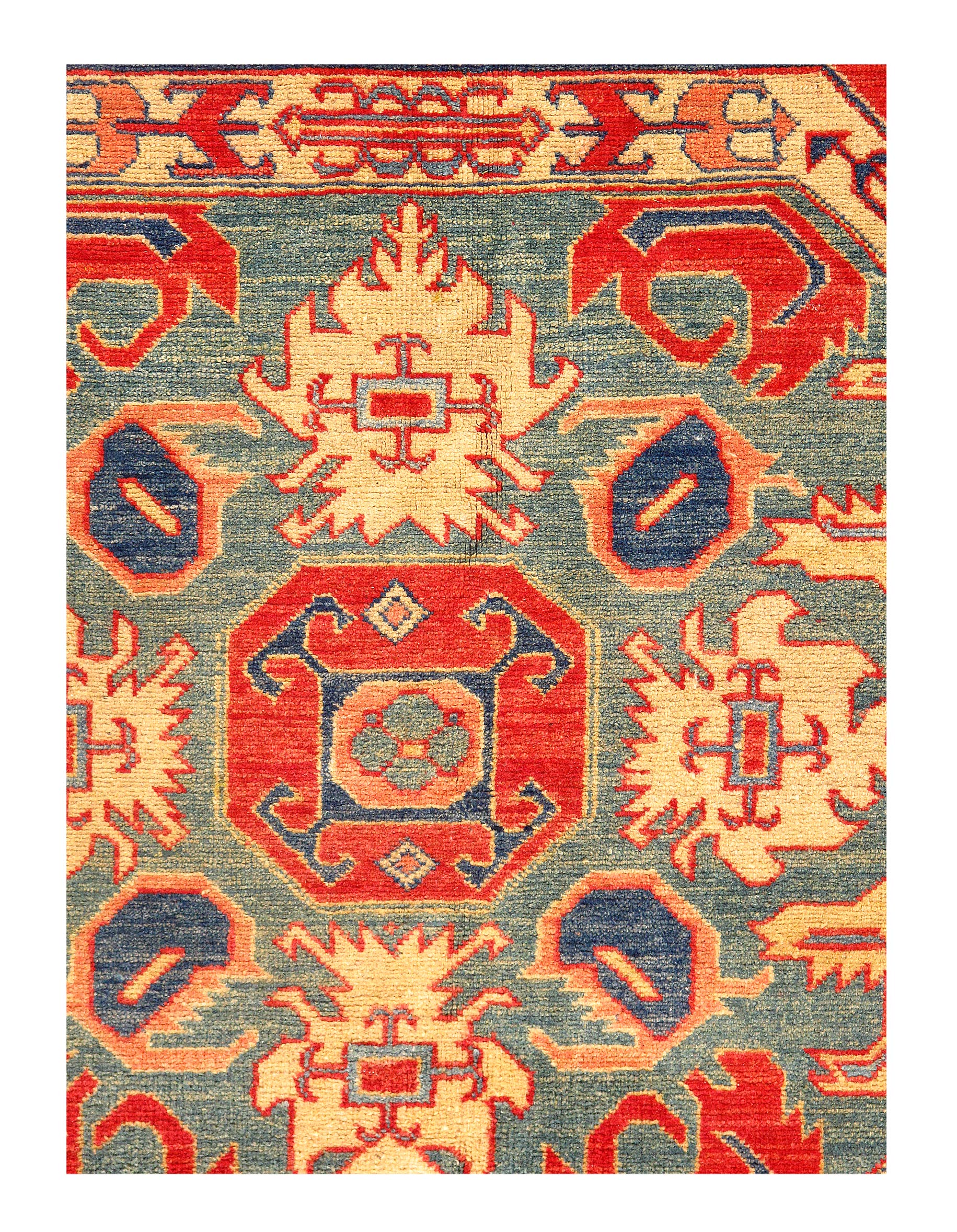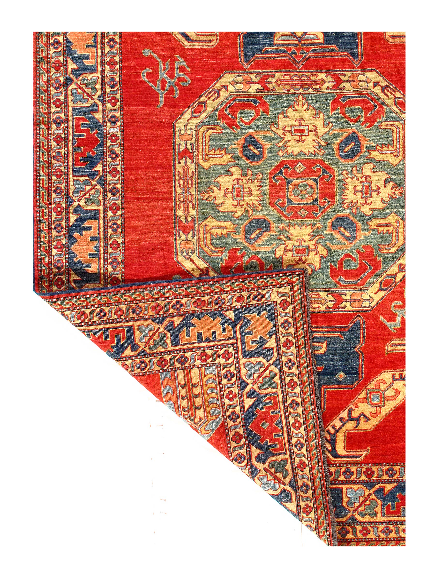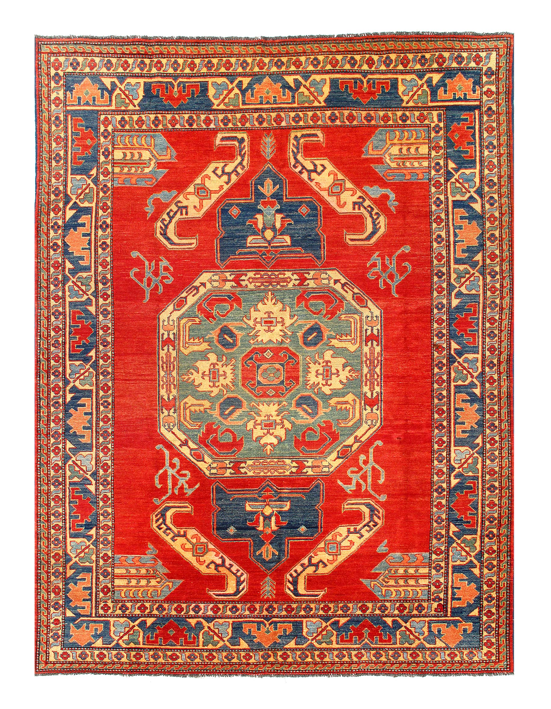 This is an original Kazak design rug. The piece was hand-knotted from hand-spun lamb's wool on a cotton foundation and vegetable dyed. This rug is handmade from 100-percent premium, hand-spun wool, and employ ancient pot-dying techniques to give them their authentic look.