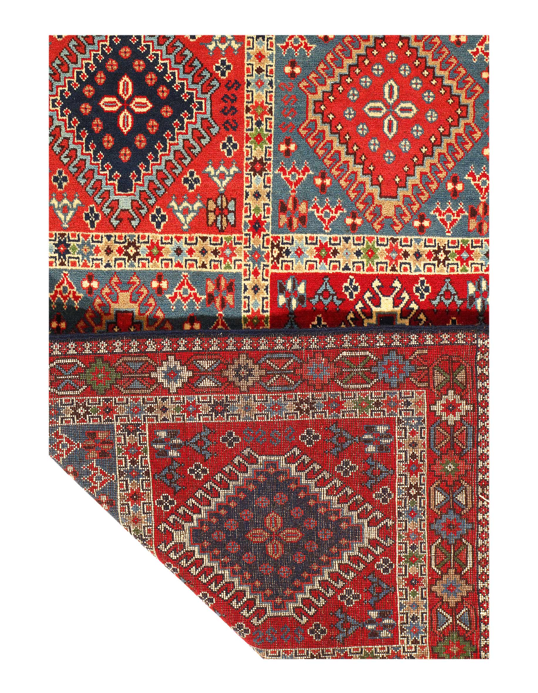 The pile used in Yalameh rugs is very fine, particularly in comparison to other tribal designs, using soft wool based on a Wool foundation. The pattern is distinctive with large repeated diamonds in a straight line down the carpet, often with geometrical animal or human prints scattered across the field. Dark red or light brown on a blue or orange background is most common for Yalameh, similar to Shiraz rugs, the rugs compliment modern or minimalist furniture beautifully, giving the living space an aura of luxurious style and warm