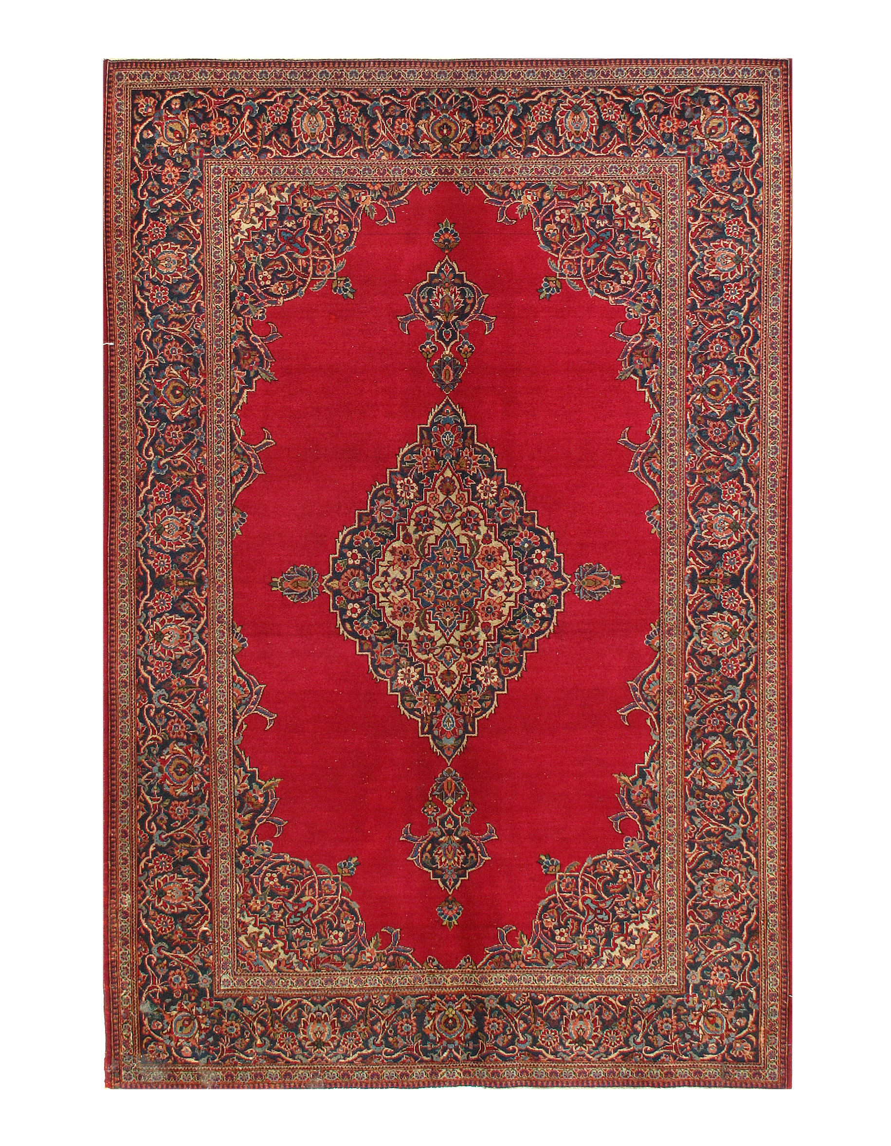 Most Kashan rugs are woven with a red field and a contrasting navy blue border. A Pistachio colour variation exists, featuring a soft green field with highlights of blues and Red - this soft colour palette is a favourite amongst Australian decors.