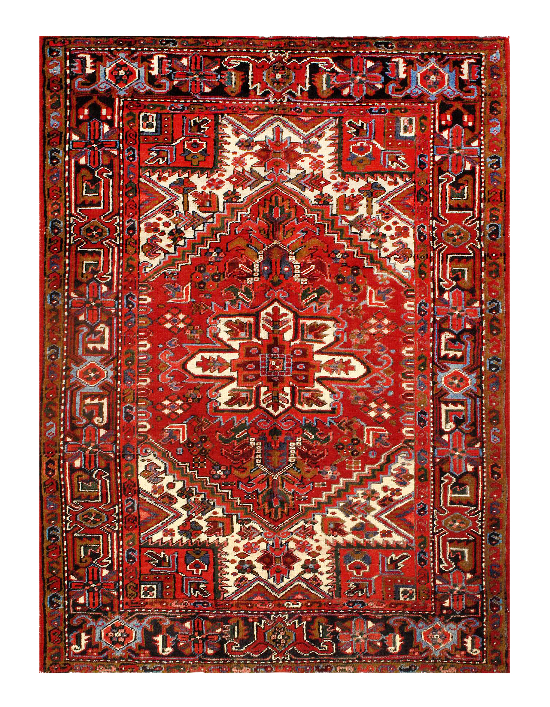 The brilliant rust field bears a central Ray of Life and many highly abstracted floral shapes in this fascinating antique Heriz rug. Four flower blossoms cluster at different points along the mid-lines, separated by riyu symbols in the shape of arrows. The patterns carry blue, pink and white colors. A broad navy border presents scrolled geometric shapes. Three separate, narrow guard borders frame the border, each carrying a geometric pattern. Heriz is a community in Northwestern Iran famed for producing extremely long lasting carpet and rugs, items that often pass down from one generation to another during many years. These antique rugs possess a coarse, durable consistency. The type of rugs made in Heriz are also sometimes produced in other places, including Bakhshaish and Gorevan. The highest grade of rug from the Heriz area is the Serapi, which was made around the turn of the Twentieth Century. Most Heriz rug contain prominent knots but the Serapi are describes as smoother.