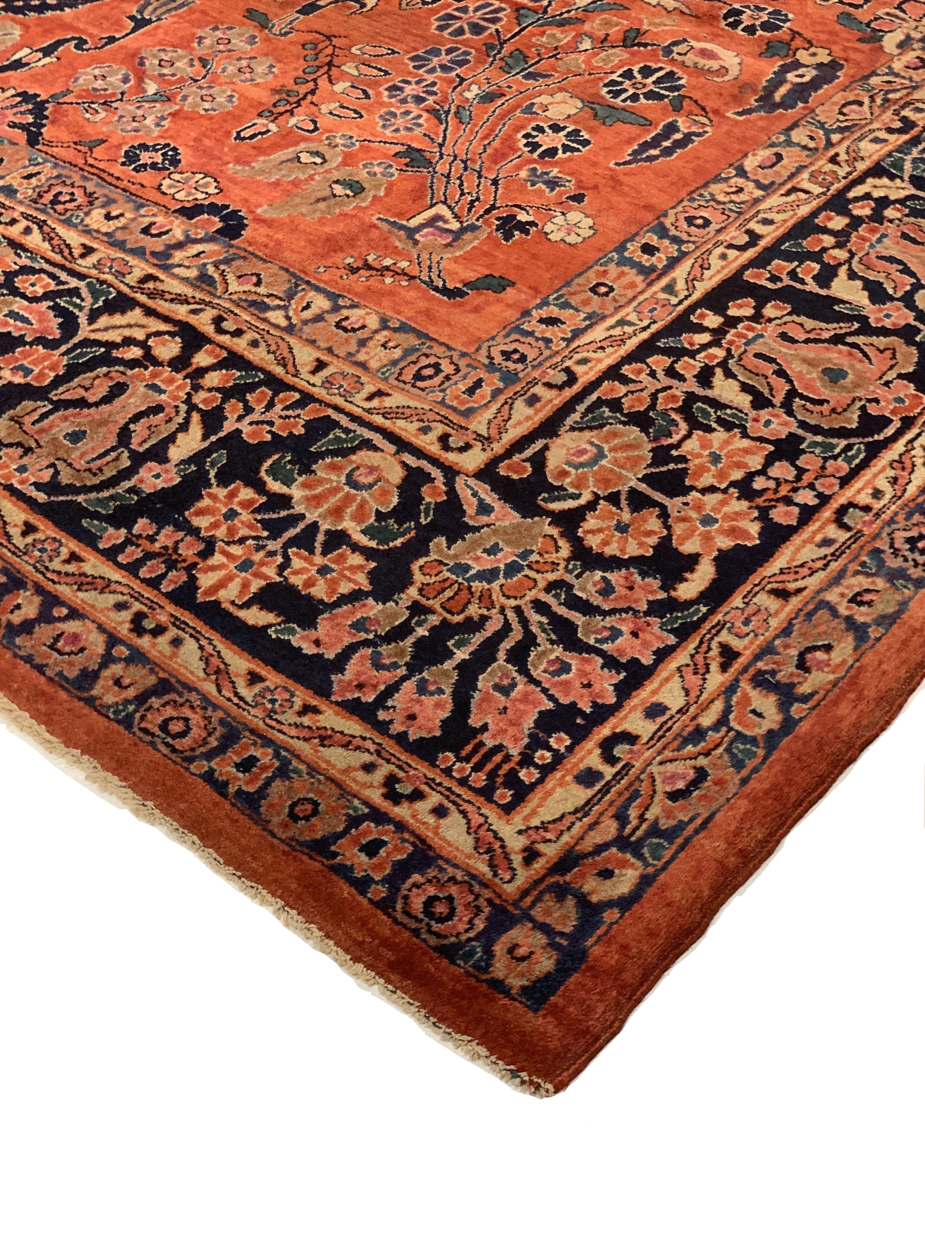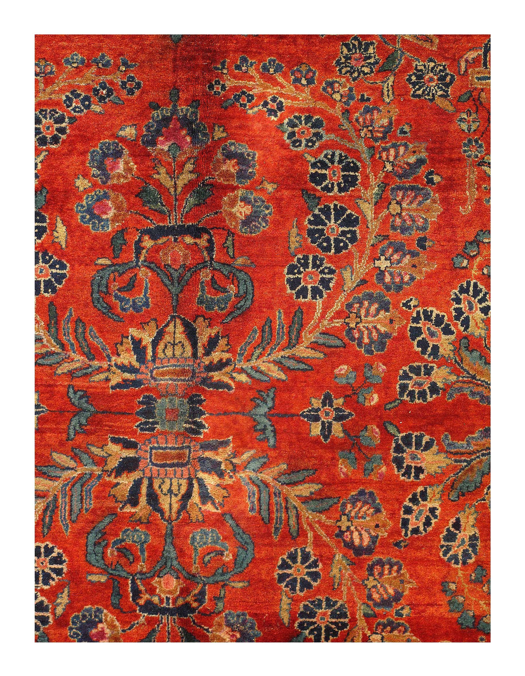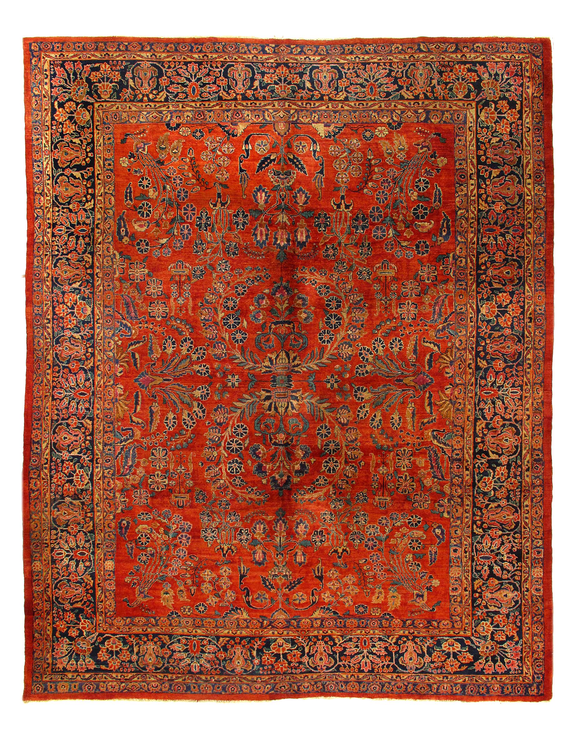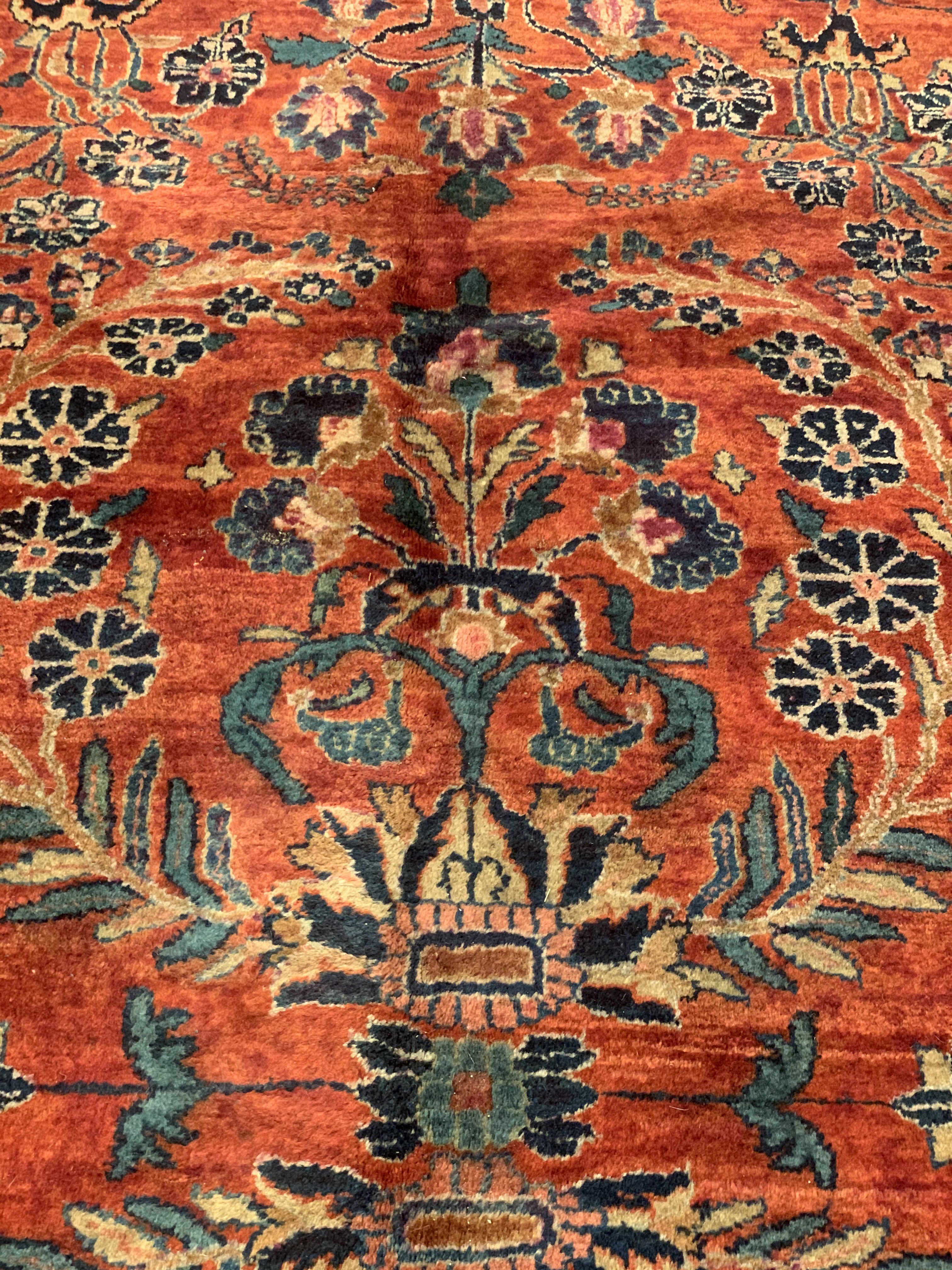 Palmettes, flowers, and sinuous vines wend their way in profusion across the rich red field of this luscious antique Sarouk. The design is carefully controlled in its layout and symmetry despite its dynamic freedom and exuberance. The field elements reappear in the main border as a continuous vinescroll, but set against a blue ground in framing contrast to the field. The meticulous drawing and uniform design texture create a harmonious decorative effect despite the richness of the color and complexity of the ornament.