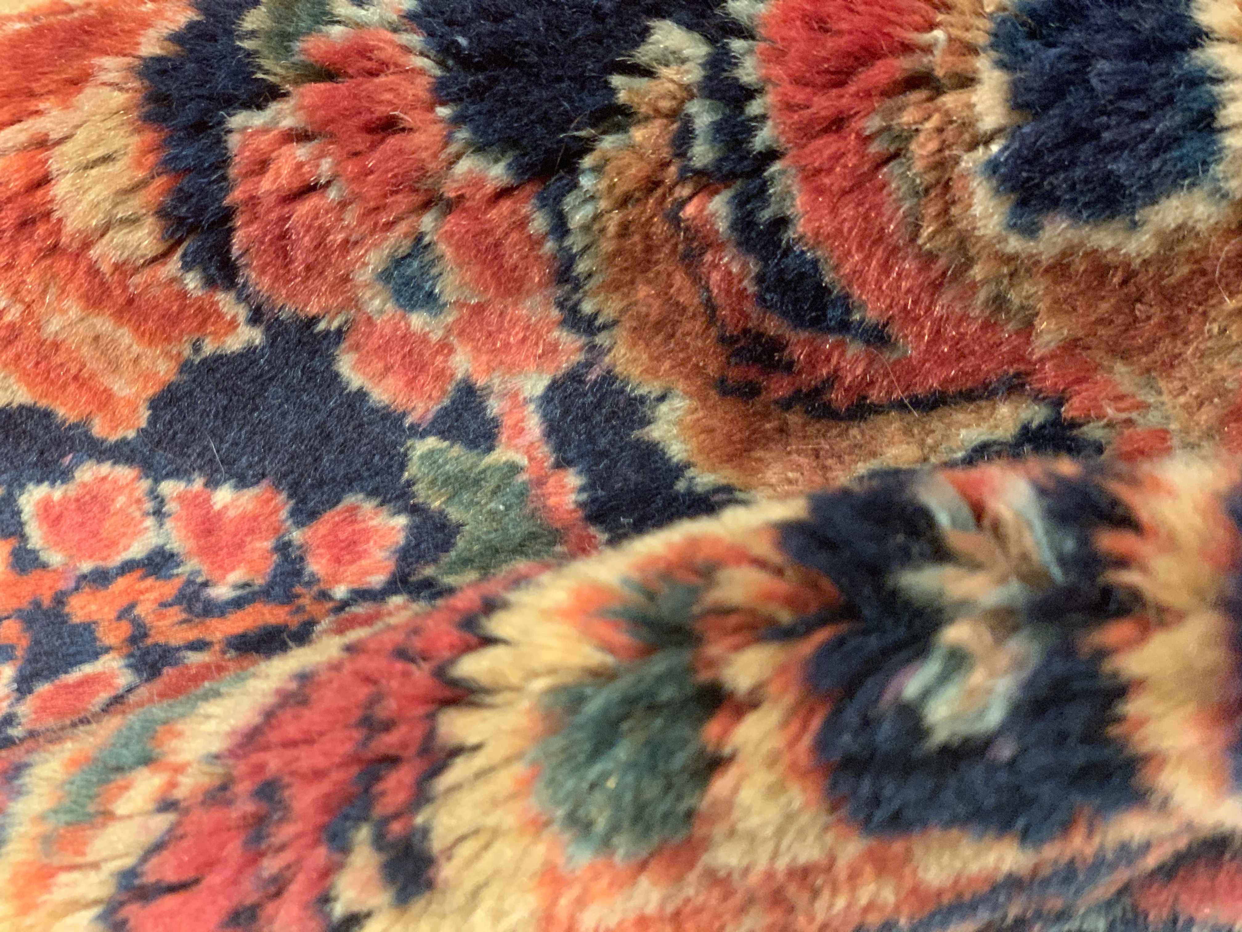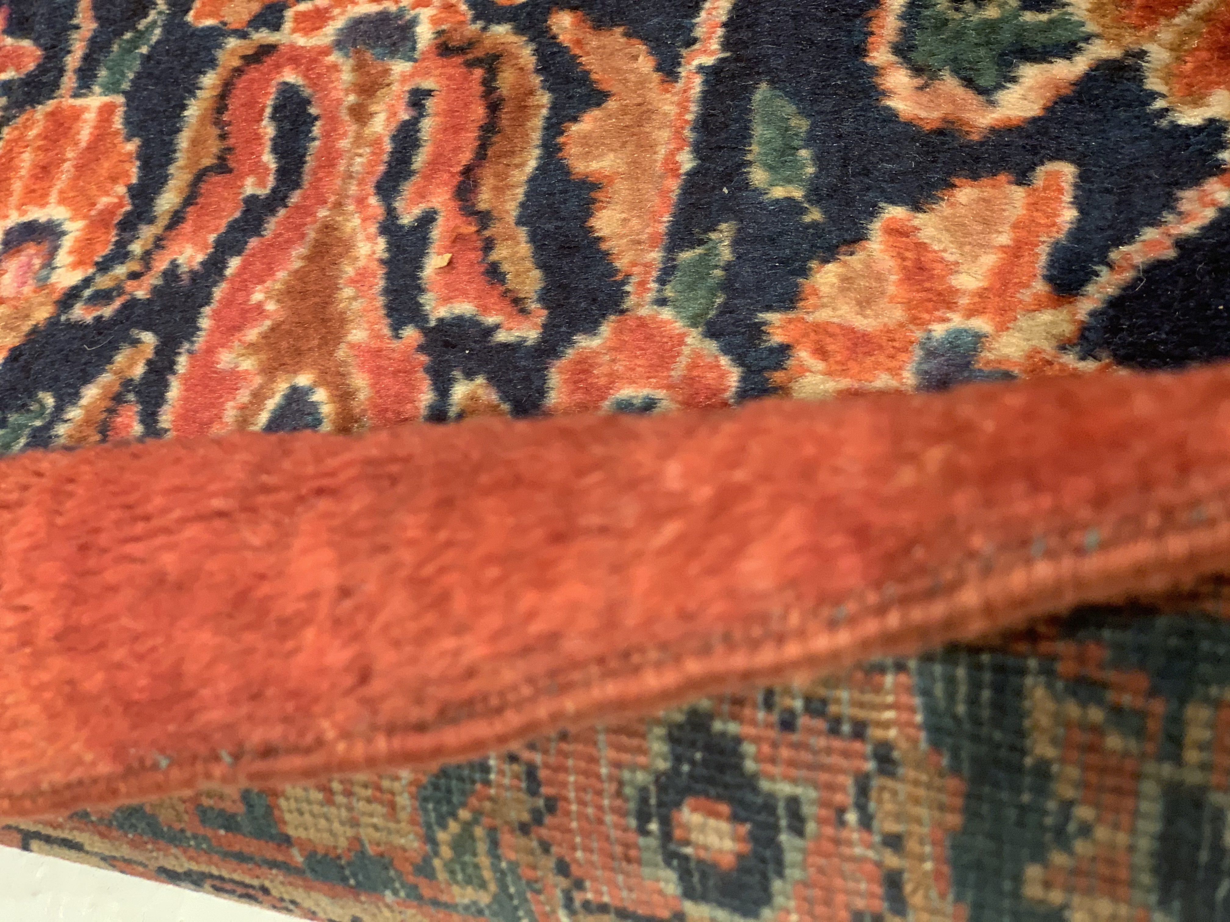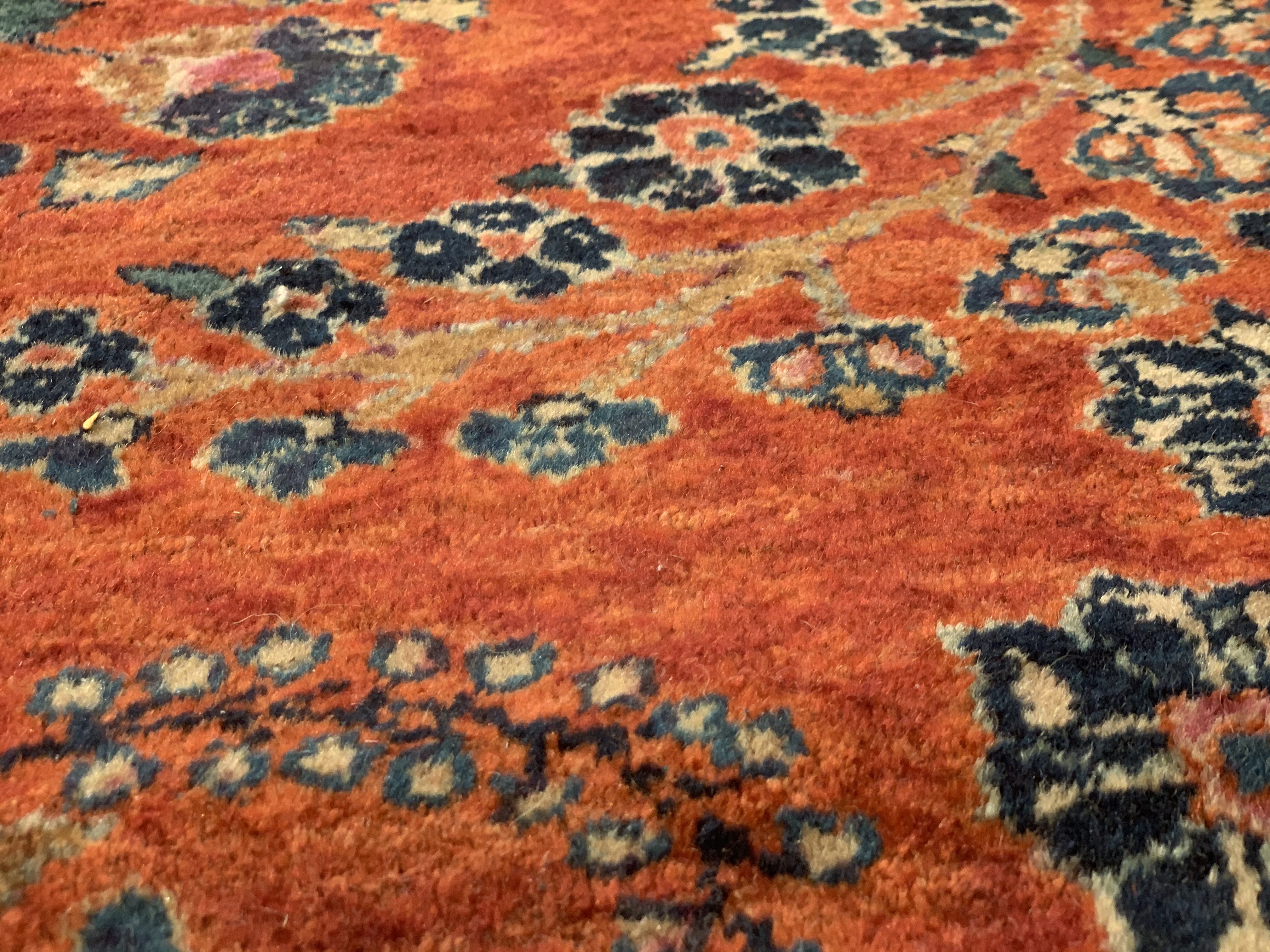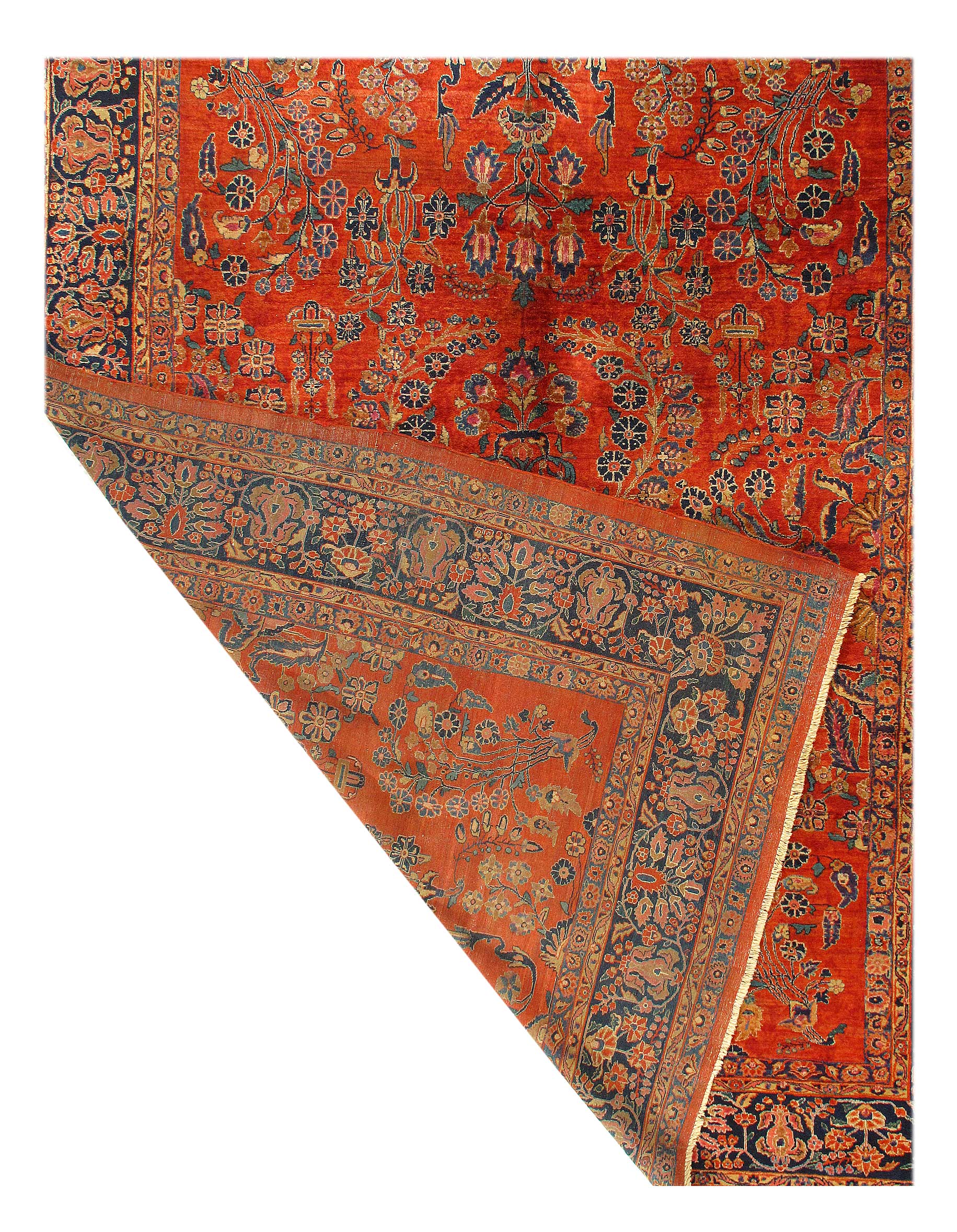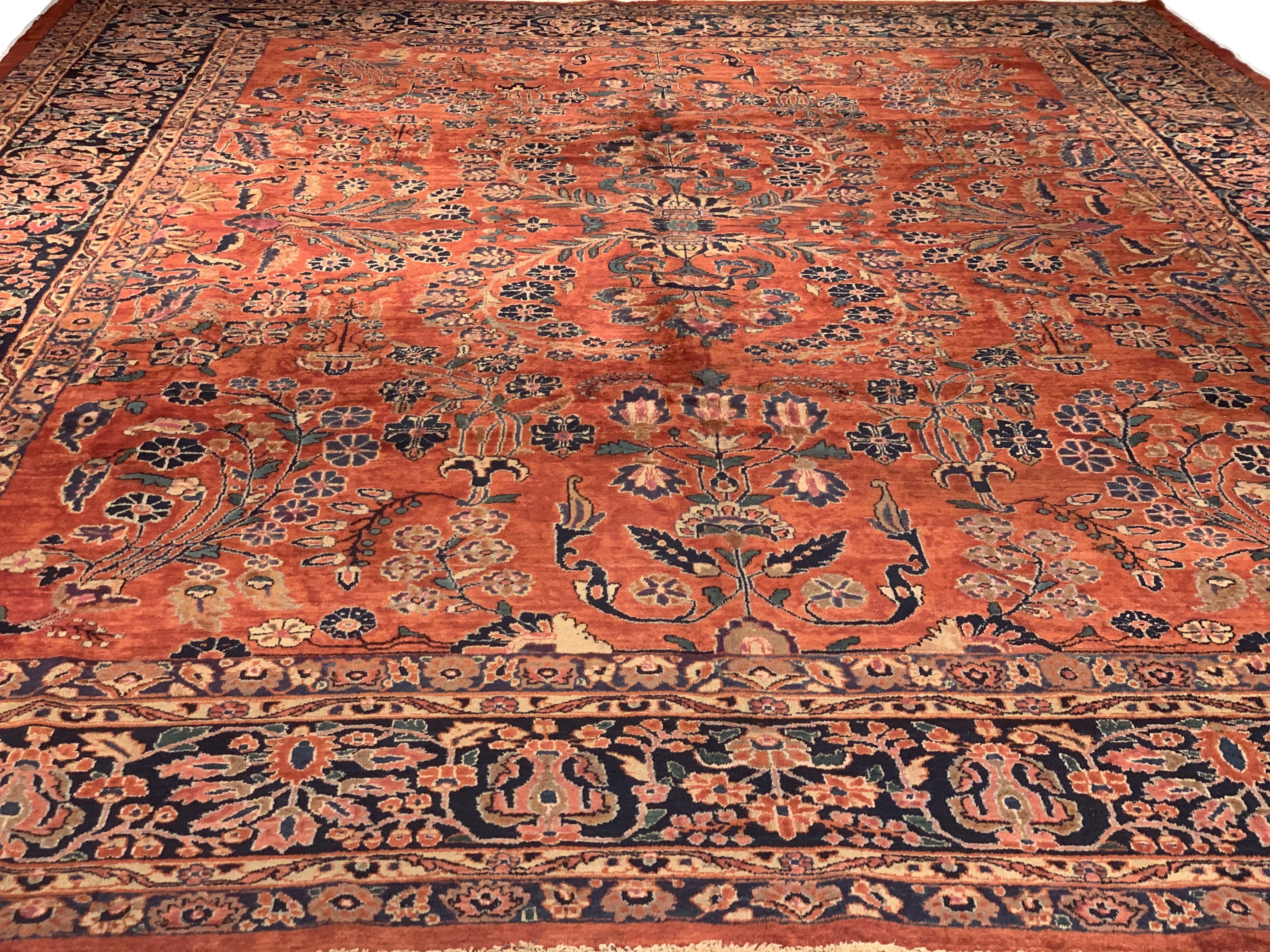 Palmettes, flowers, and sinuous vines wend their way in profusion across the rich red field of this luscious antique Sarouk. The design is carefully controlled in its layout and symmetry despite its dynamic freedom and exuberance. The field elements reappear in the main border as a continuous vinescroll, but set against a blue ground in framing contrast to the field. The meticulous drawing and uniform design texture create a harmonious decorative effect despite the richness of the color and complexity of the ornament.