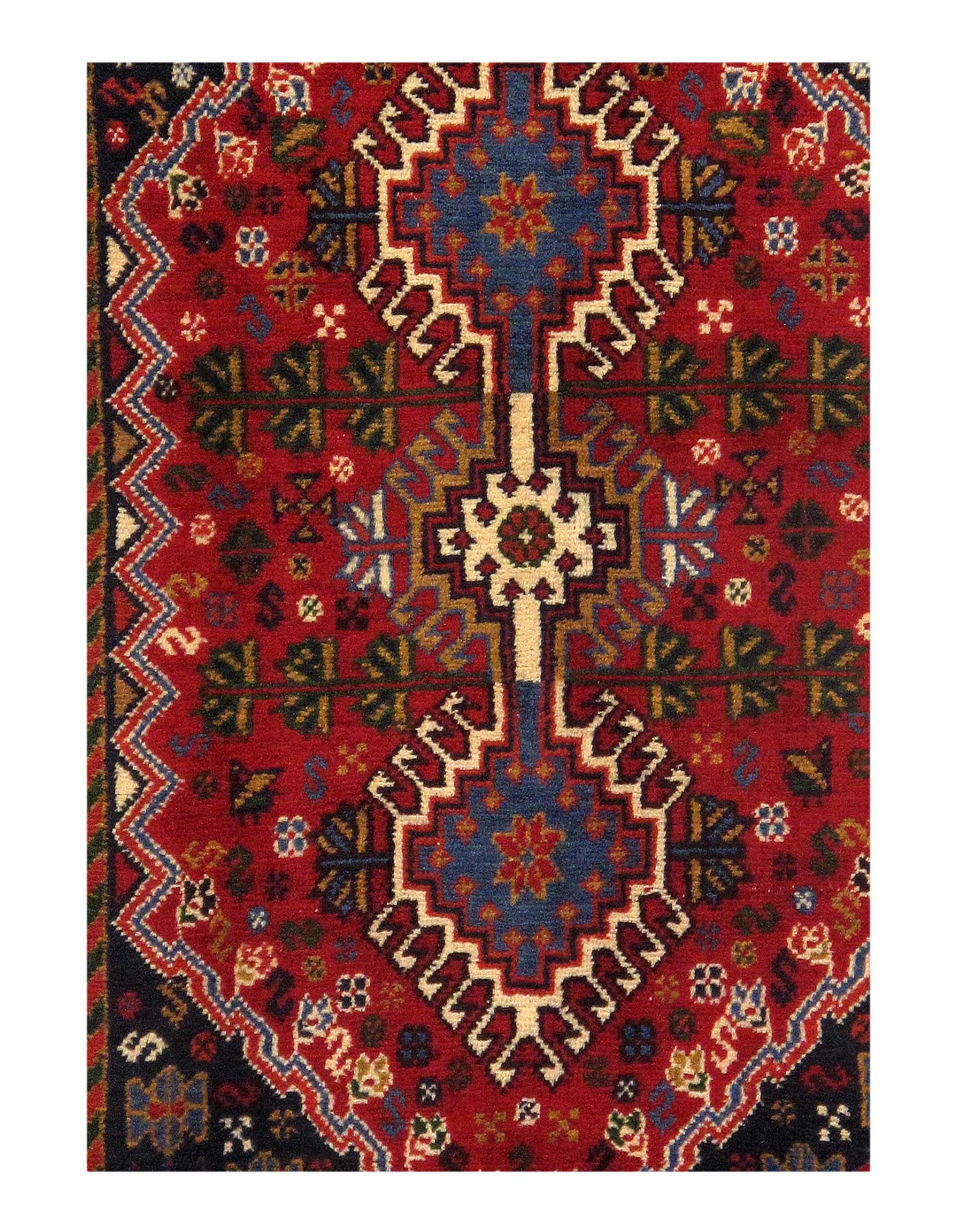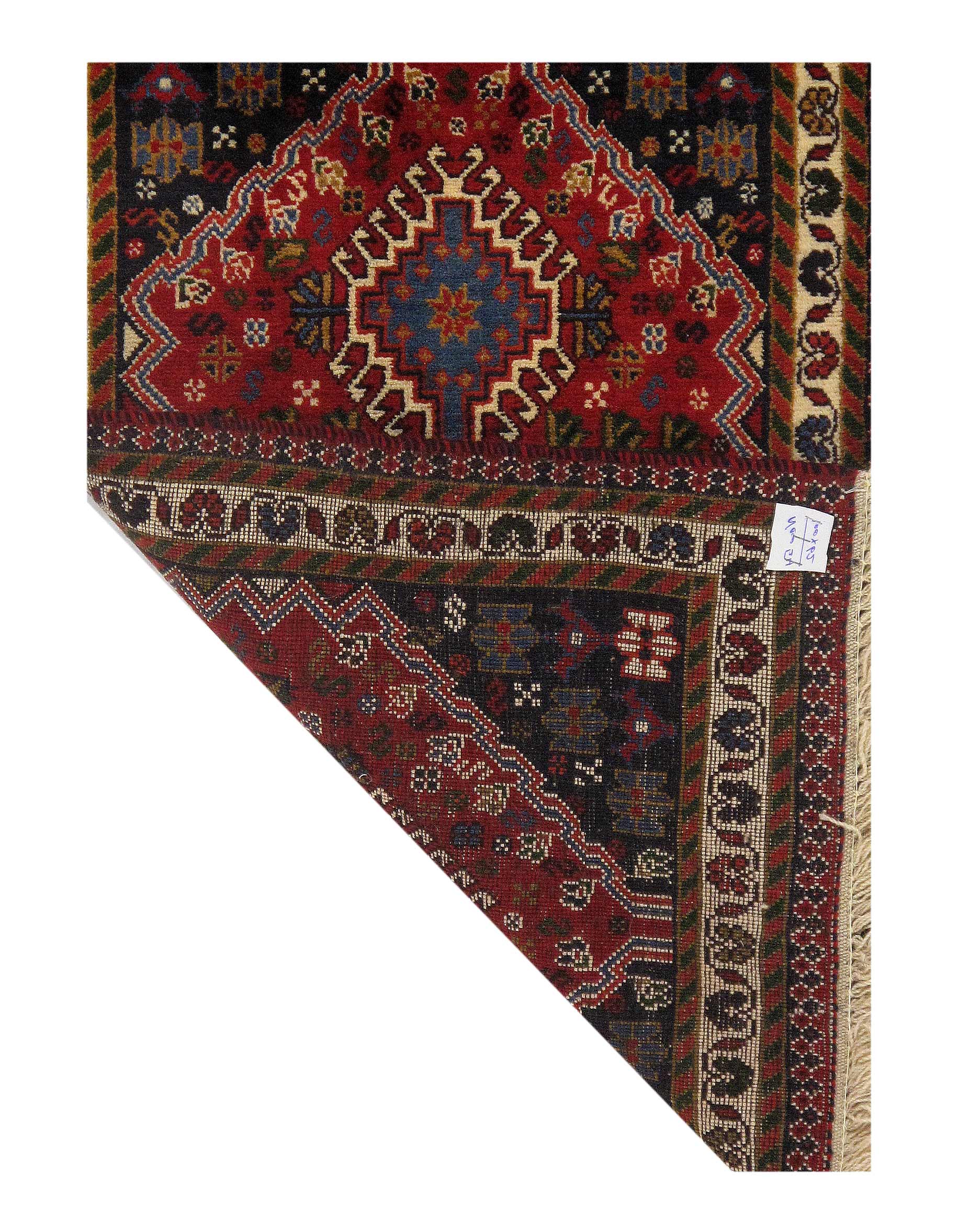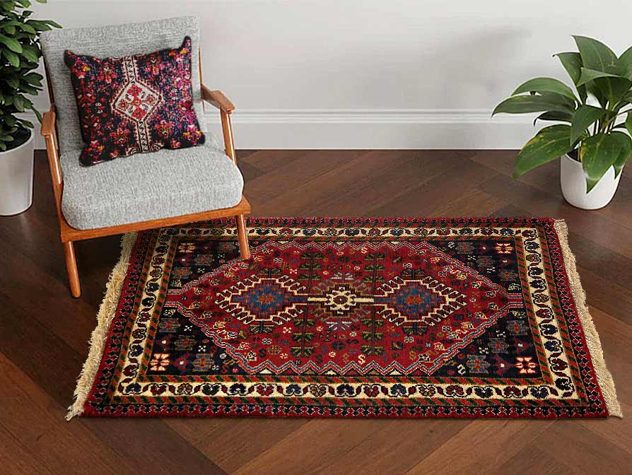 The pile used in Yalameh rugs is very fine, particularly in comparison to other tribal designs, using soft wool based on a Wool foundation. The pattern is distinctive with large repeated diamonds in a straight line down the carpet, often with geometrical animal or human prints scattered across the field. Dark red or light brown on a blue or orange background is most common for Yalameh, similar to Shiraz rugs, the rugs compliment modern or minimalist furniture beautifully, giving the living space an aura of luxurious style and warm.