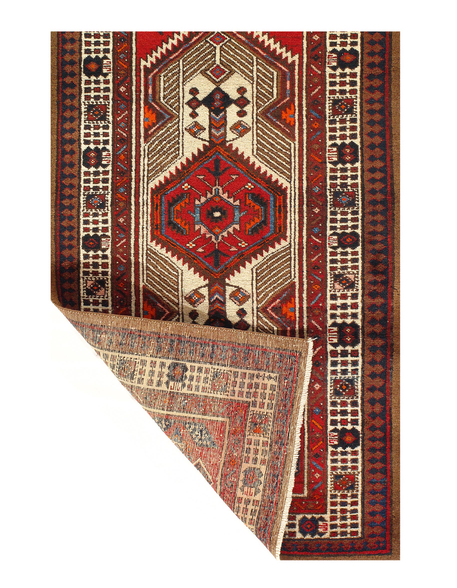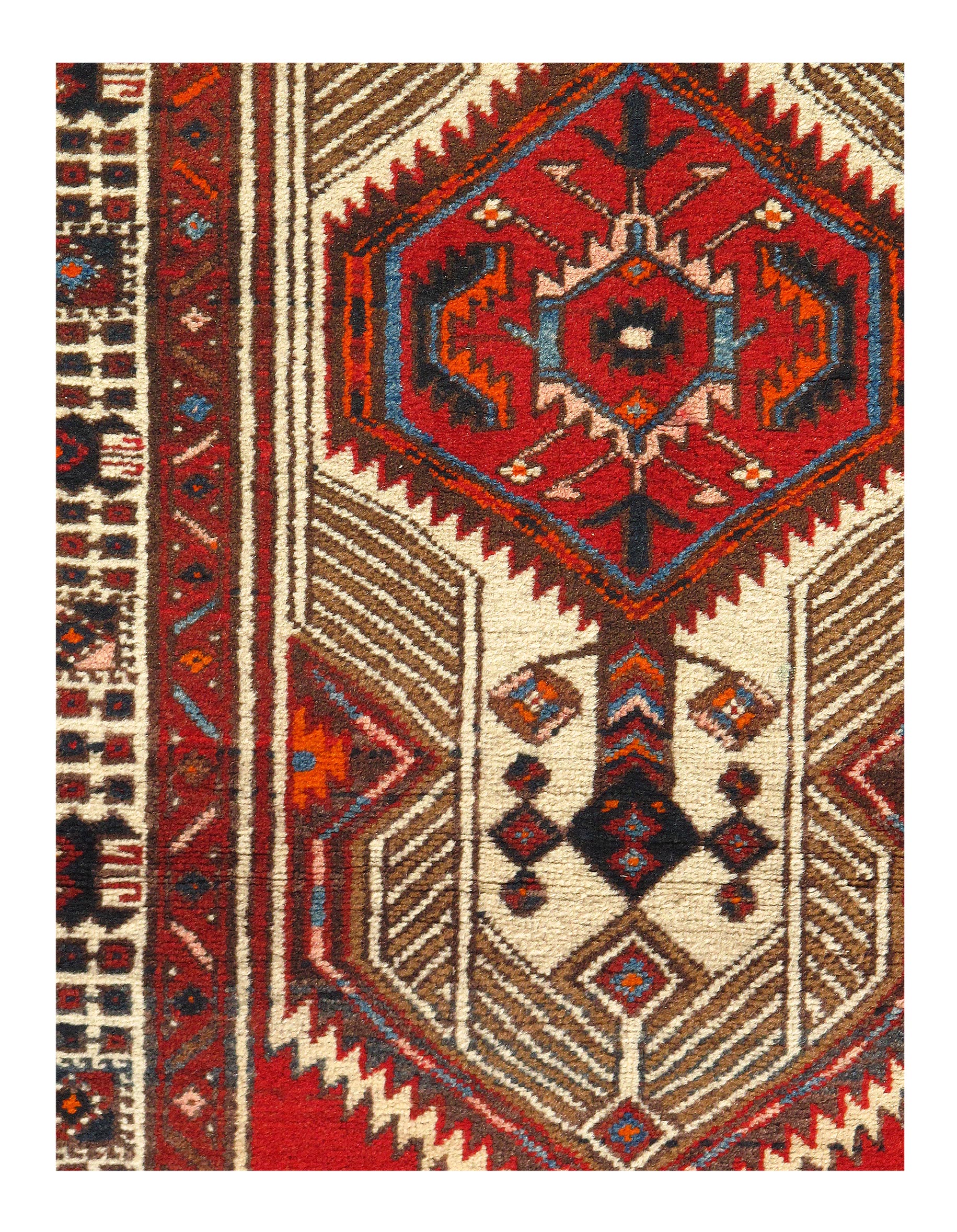 Hand knotted in the village of Serab, northwest Persia in the late 19th century. The rug is made from vegetable dyed wool knotted on a wool foundation. Serab is the collecting center for some of the hardest-wearing runners in the world. The pieces are also known for the camel color used in the field. Later Serab rugs have an unattractive synthetic red, but this one has the genuine vegetable dyed red derived from madder root.