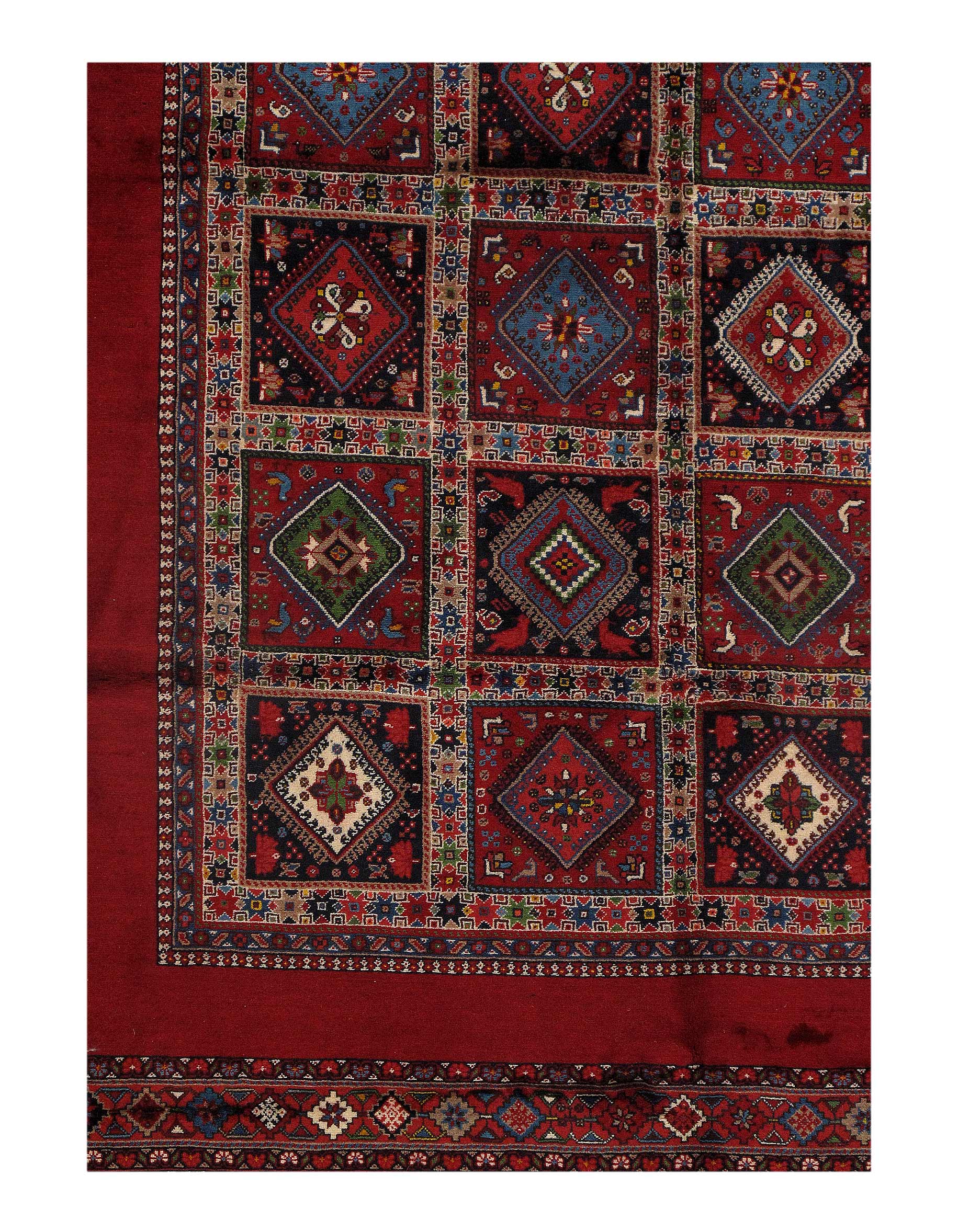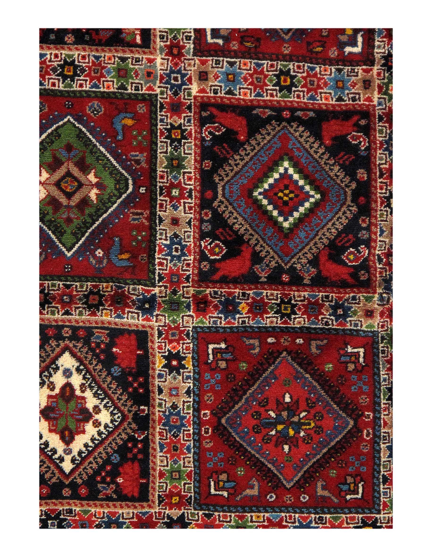 The pile used in Yalameh rugs is very fine, particularly in comparison to other tribal designs, using soft wool based on a Wool foundation. The pattern is distinctive with large repeated diamonds in a straight line down the carpet, often with geometrical animal or human prints scattered across the field. Dark red or light brown on a blue or orange background is most common for Yalameh, similar to Shiraz rugs, the rugs compliment modern or minimalist furniture beautifully, giving the living space an aura of luxurious style and warm.