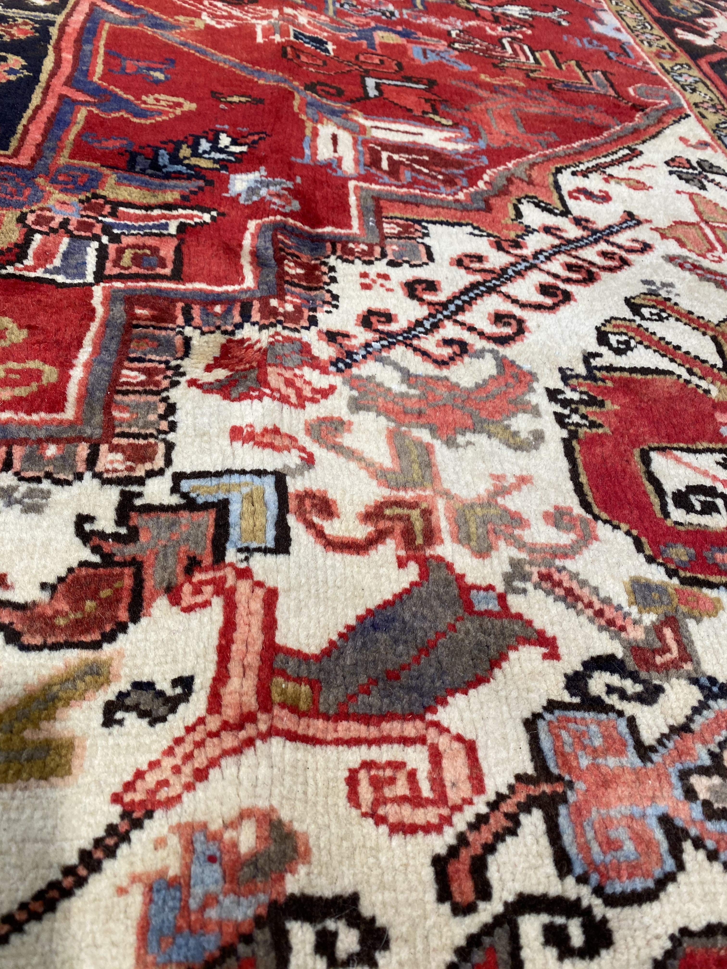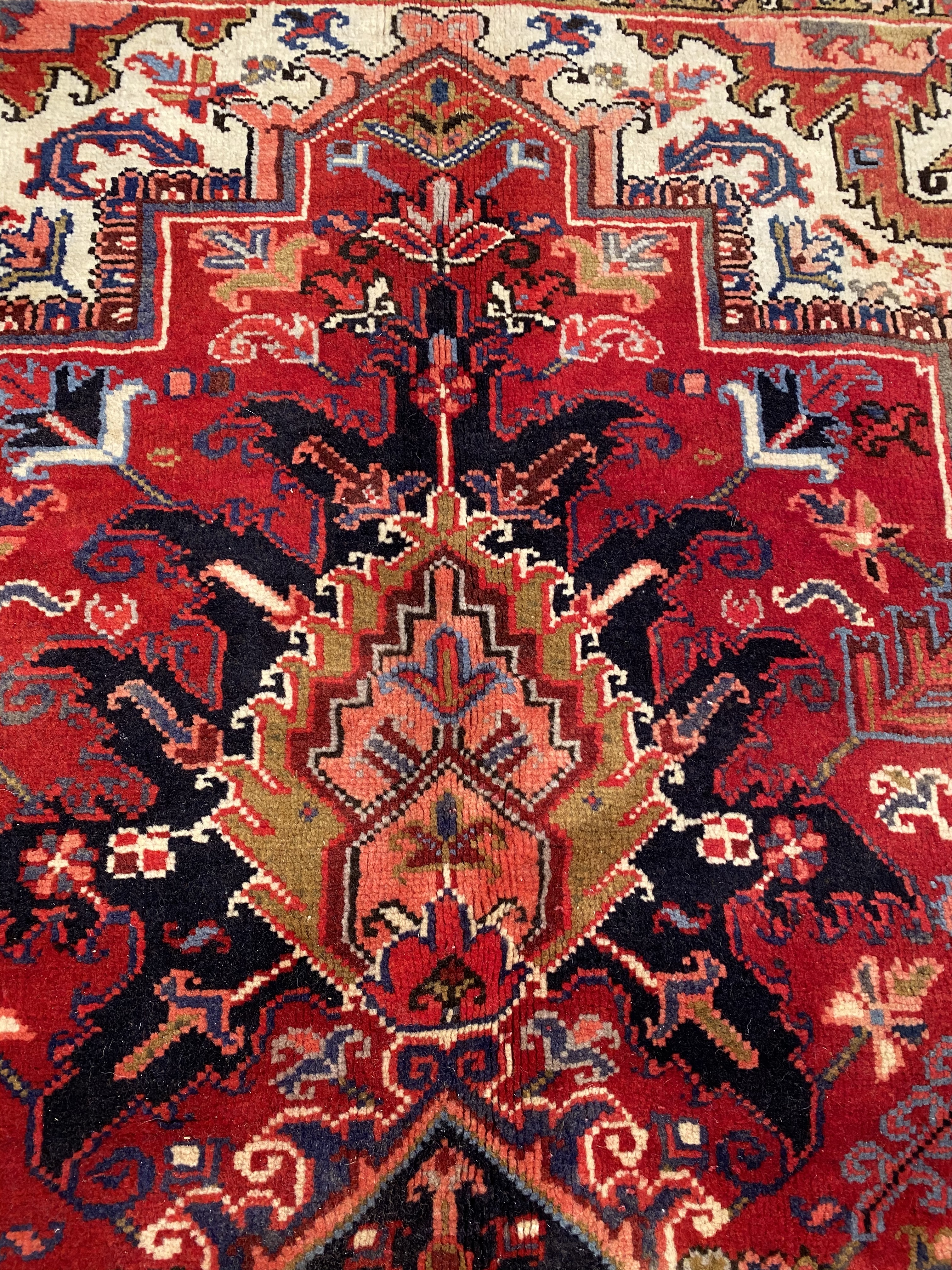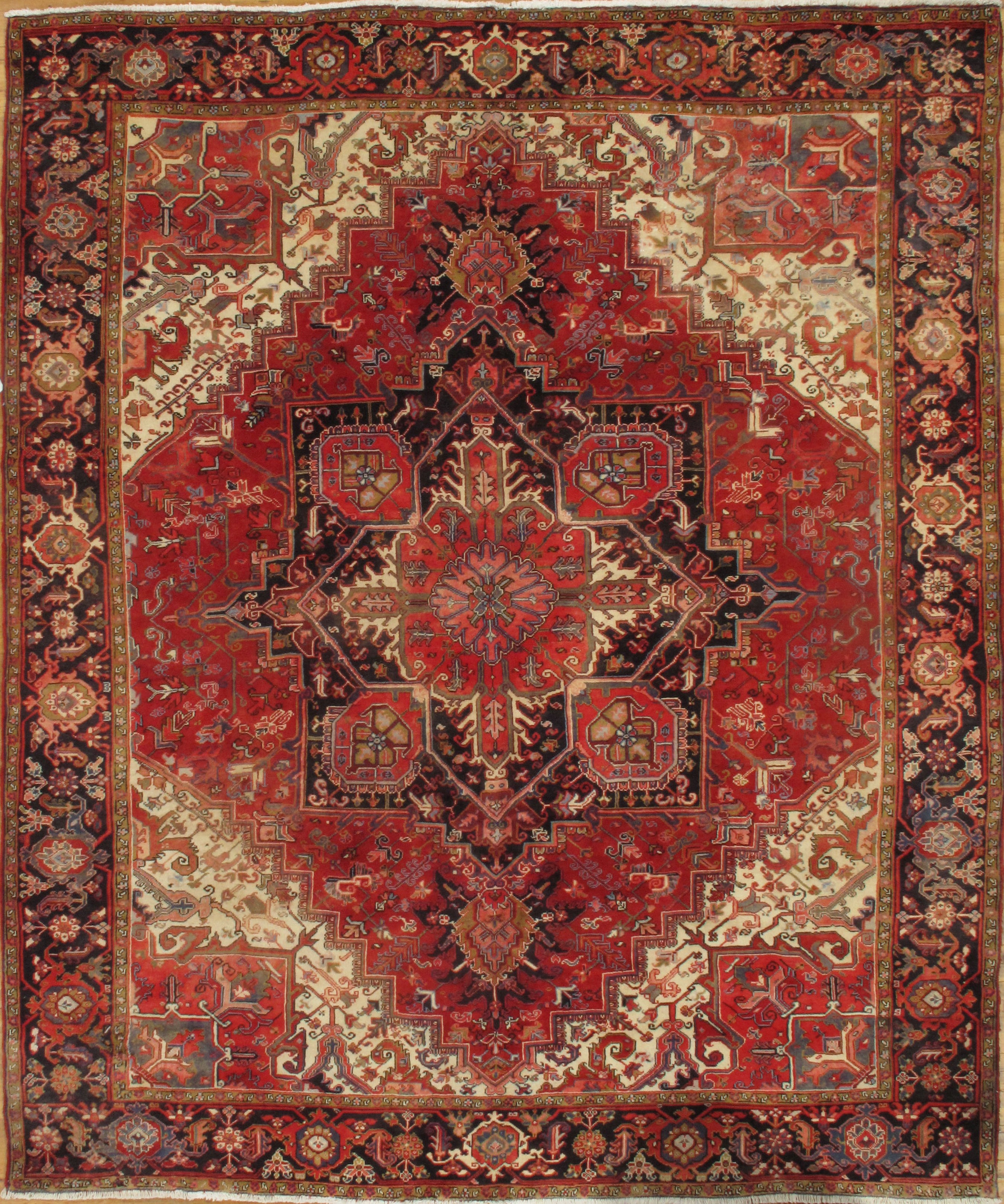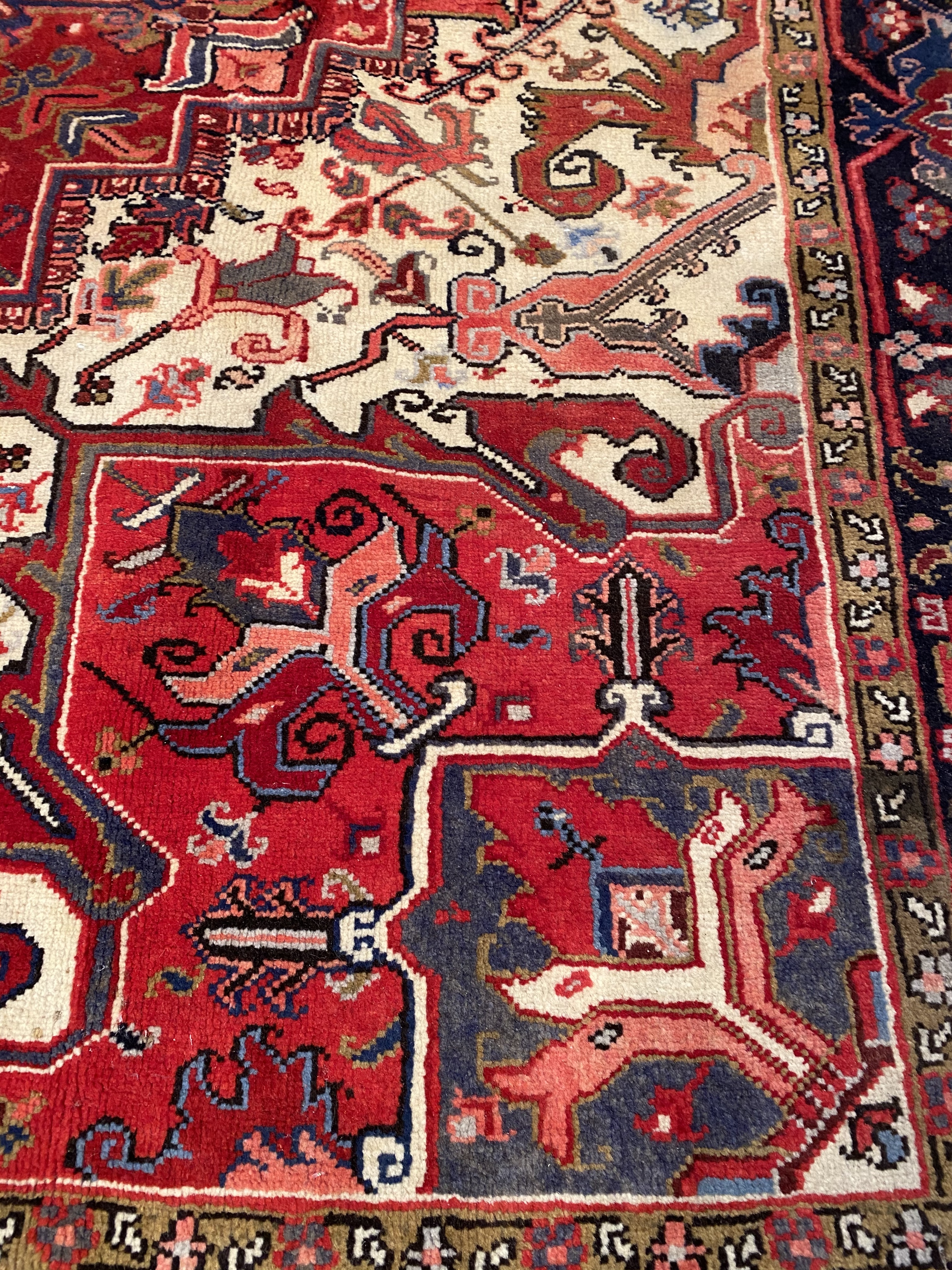 One of the most readily recognizable Persian rugs is the Heriz. Heriz rugs, boldly colored in rust reds and blues, have rectilinear design elements rather than curvy ones found on formal Persian rugs. Most often the design focuses around a large center medallion. However, Heriz rugs without medallions may also be found. The best of the Heriz rugs have a particularly crisp look because the design elements are outlined by two lines of contrasting colors. Heriz rugs traditionally have a thick pile and heavy foundation.